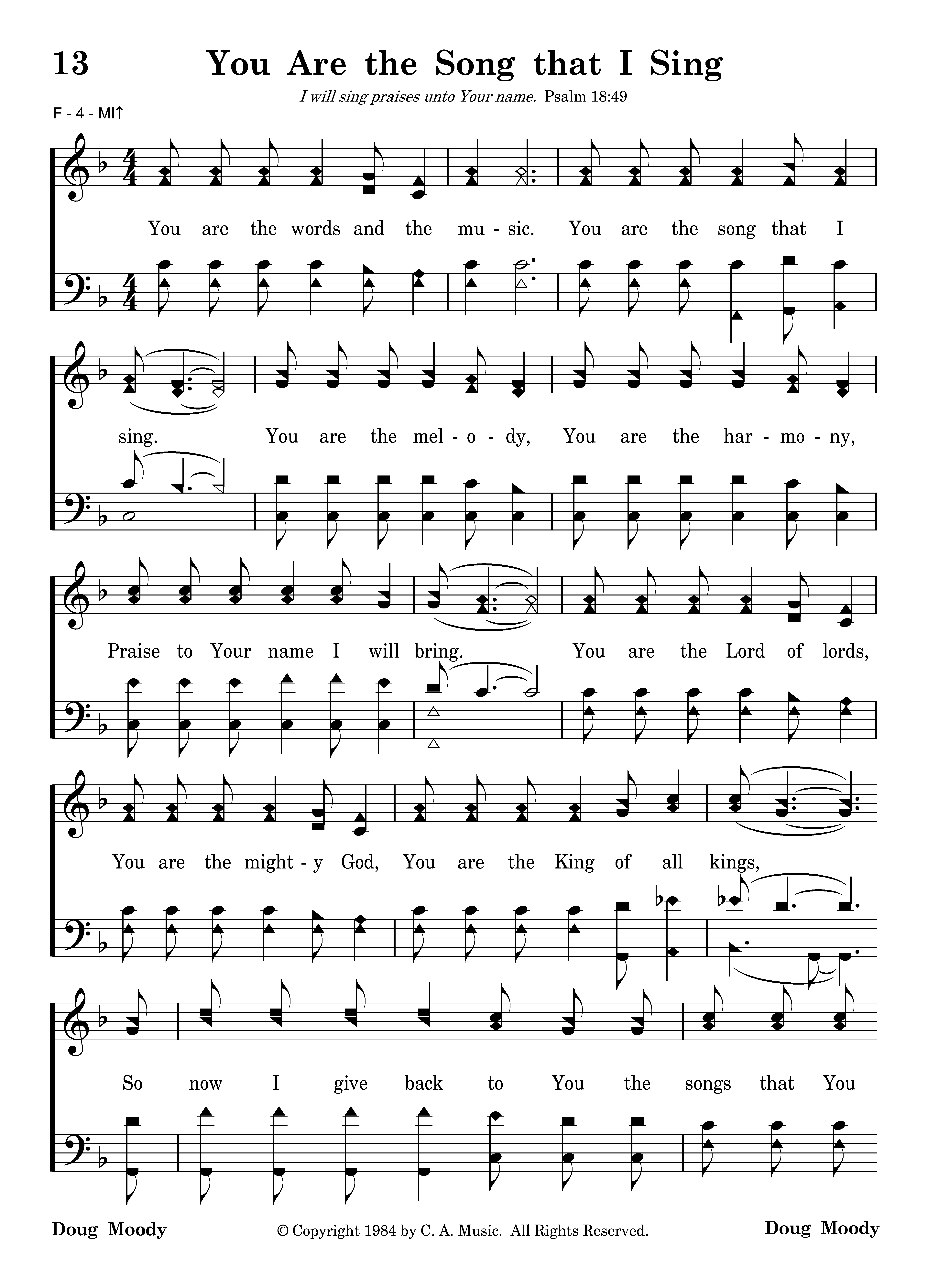 You are the words and the music. You are the song that I sing. You are the melody, You are the harmony, Praise to your name I will bring. You are the Lord of lords, You are the mighty God, You are the King of all kings, So now I give back to You the song that You gave to me, You are the song that I sing.