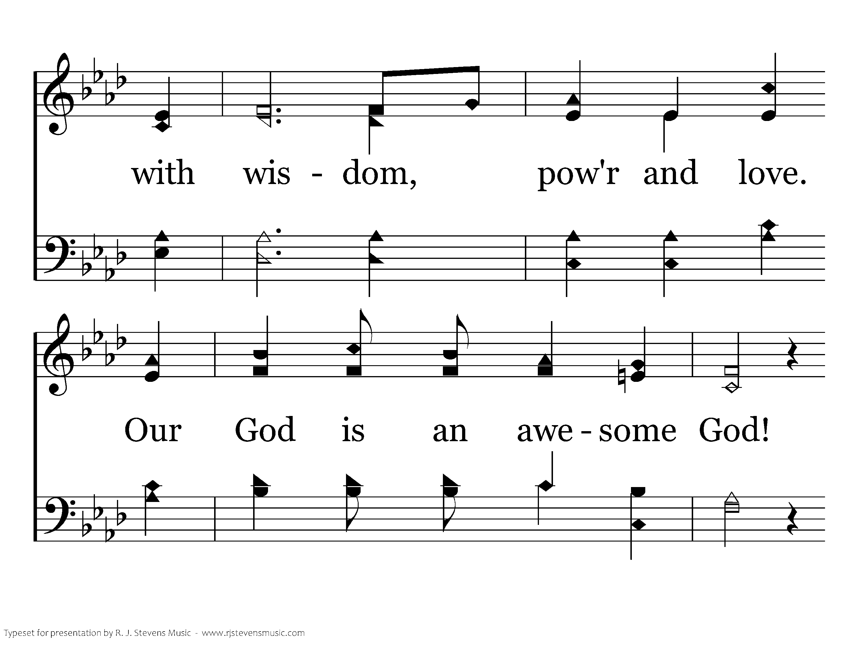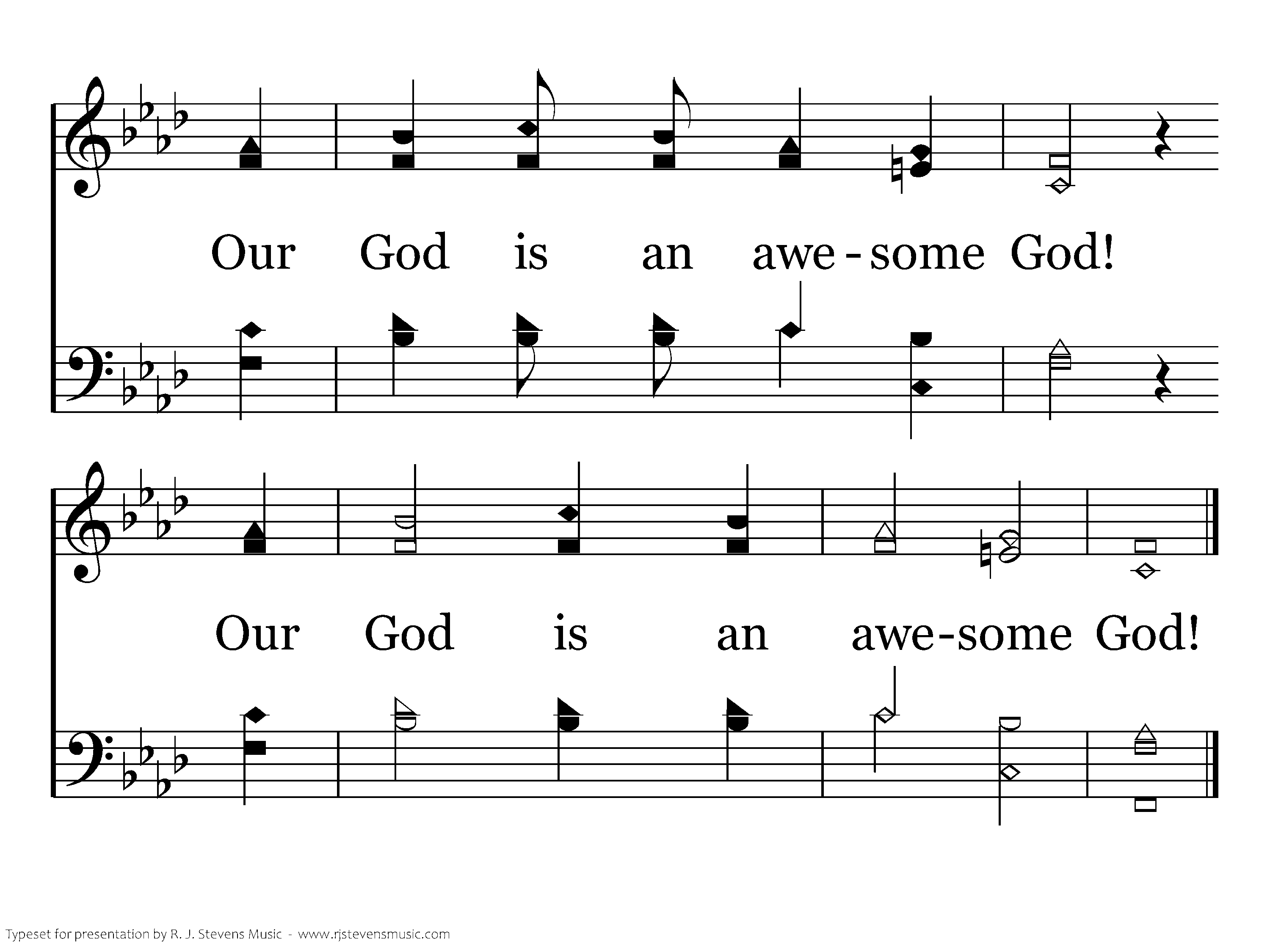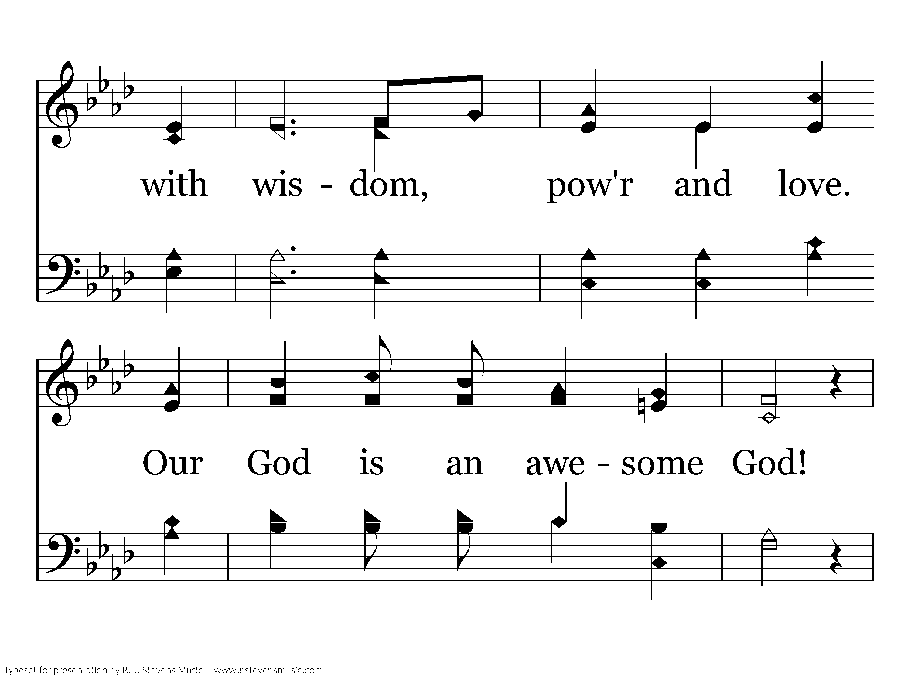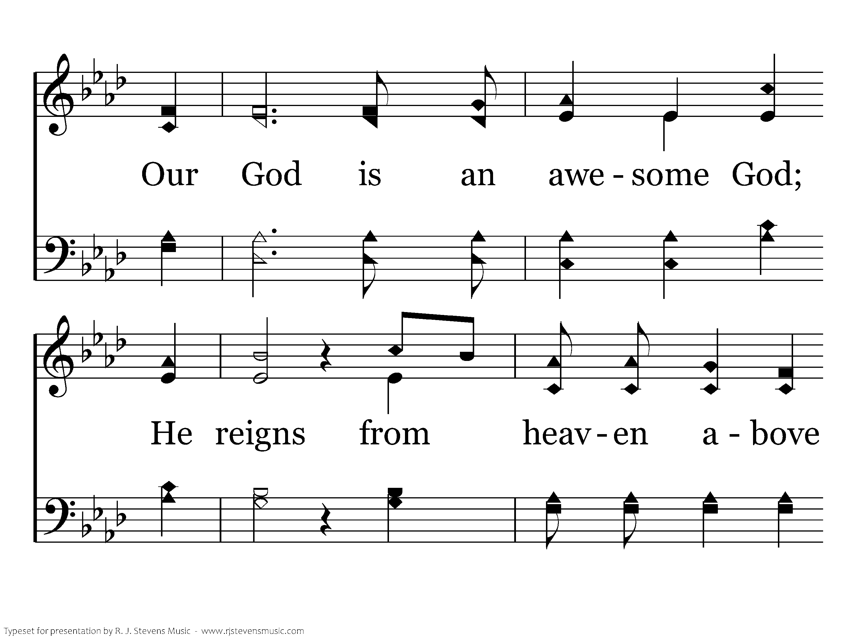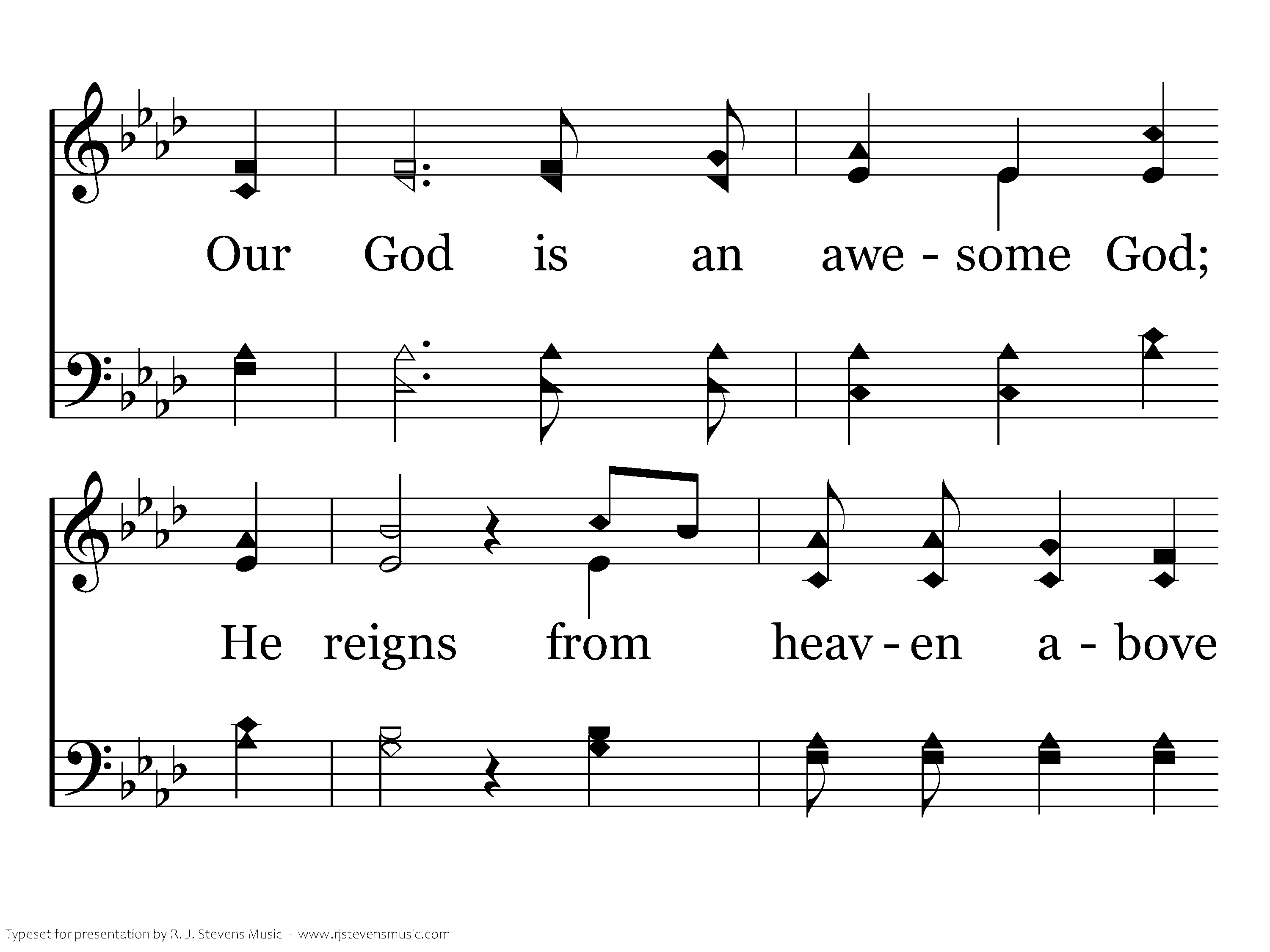 Our God is an awesome God; He reigns from heaven above with wisdom, pow'r and love. Our God is an awesome God! Our God is an awesome God! Our God is an awesome God!