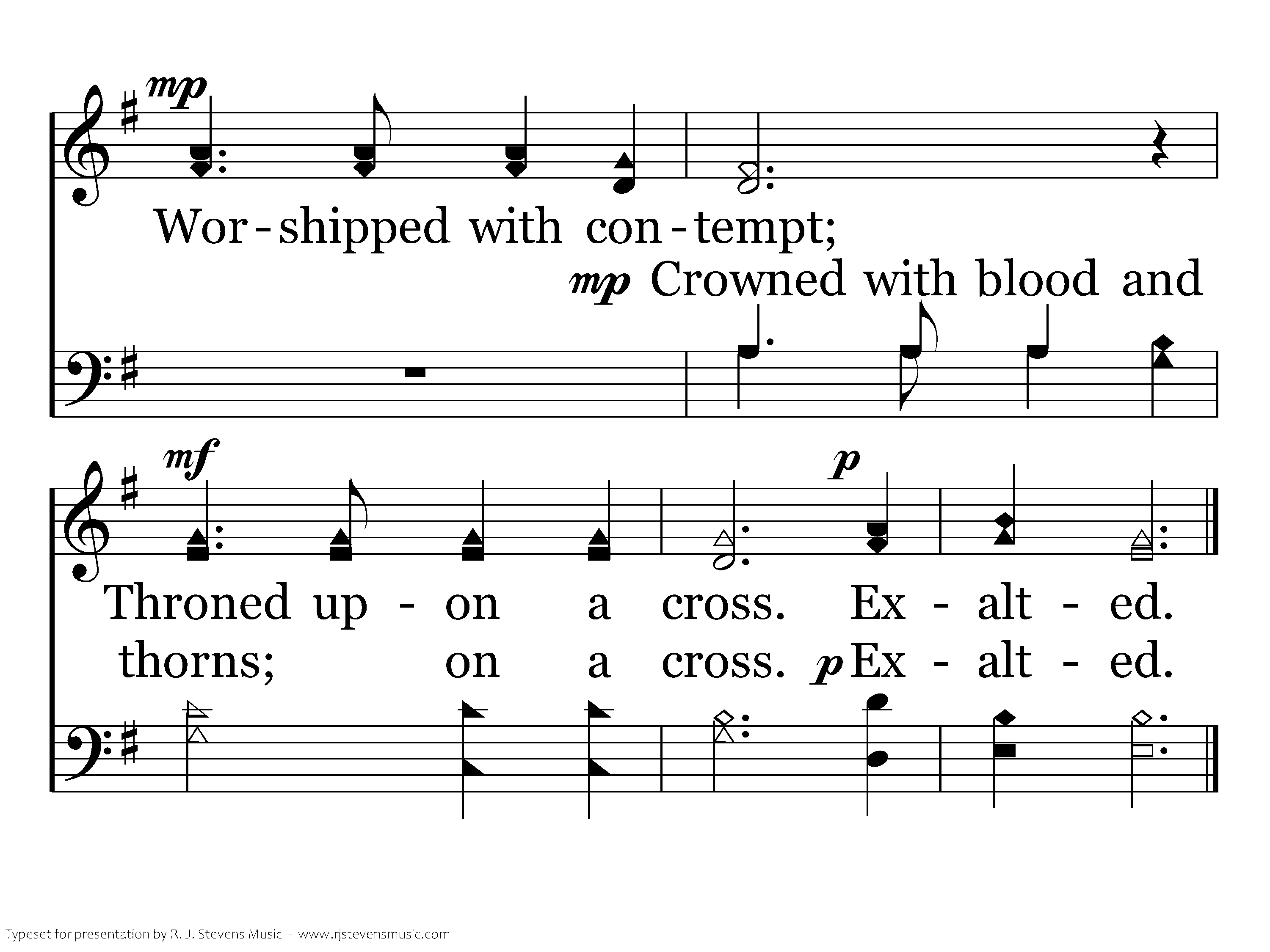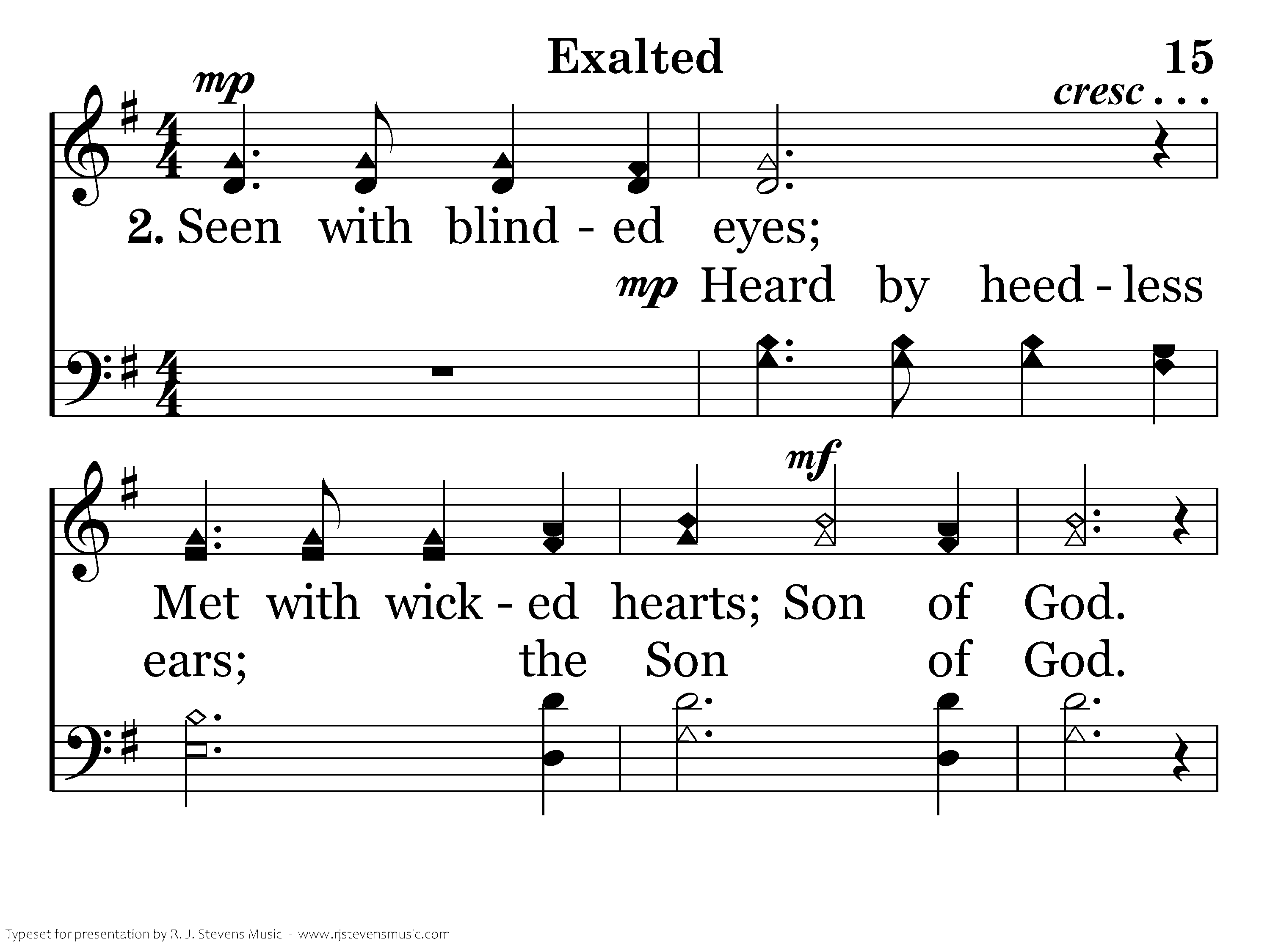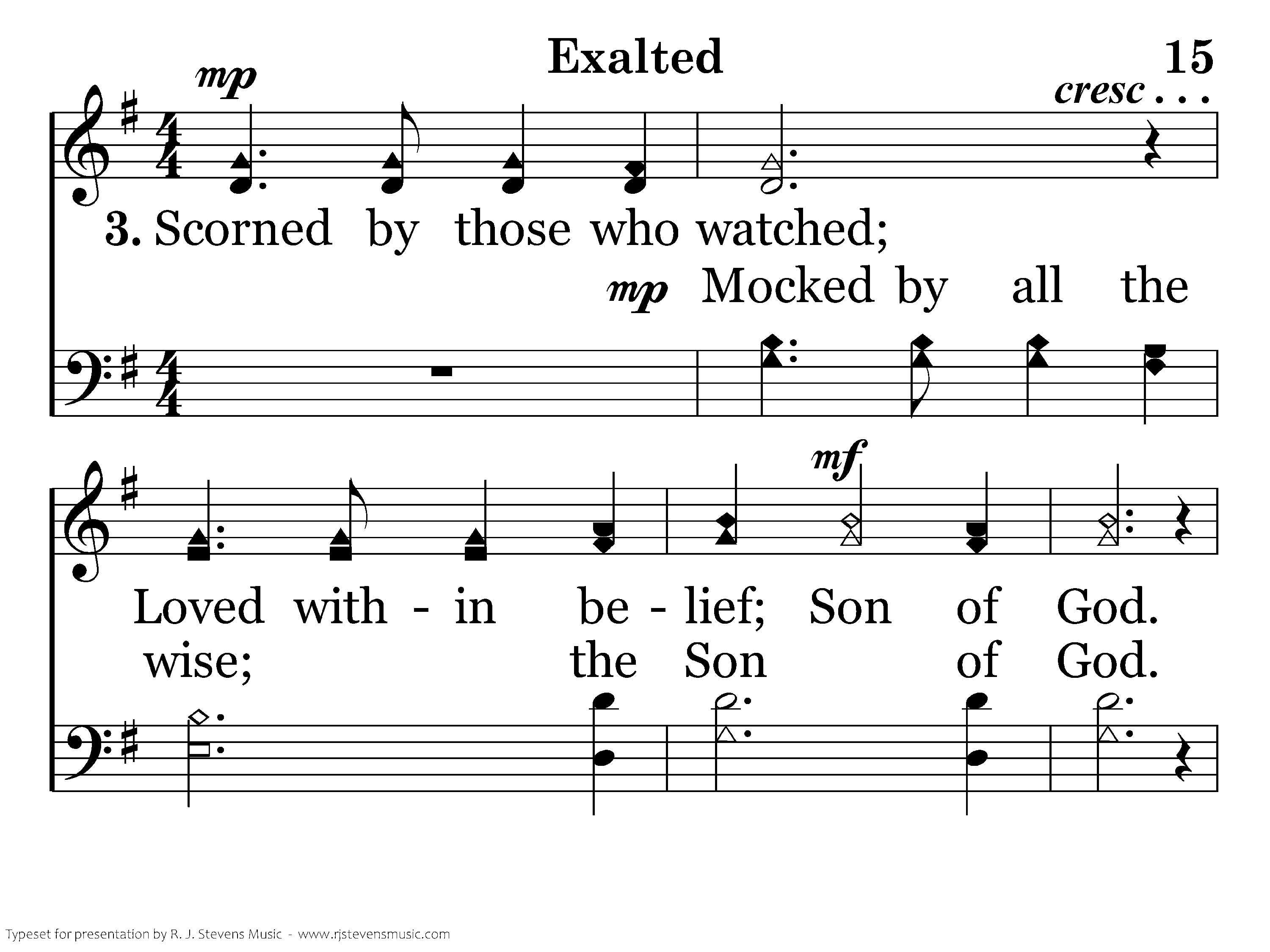 Scorned by those who watched; (Mocked by all the wise;) Loved within belief; Son of God. Born to take my death; (Slain to give me life;) Jesus, Son of God. Exalted. Exalted.