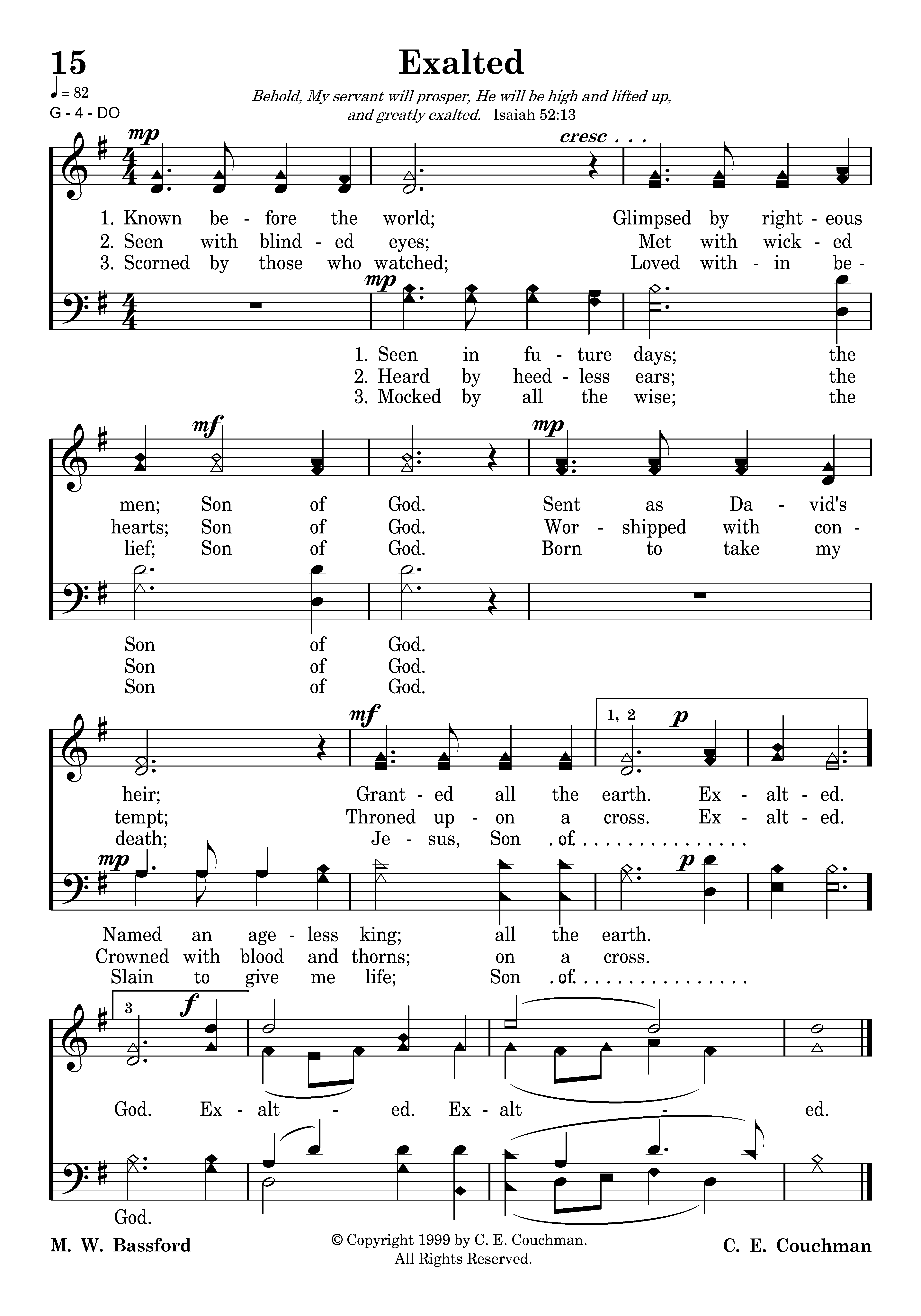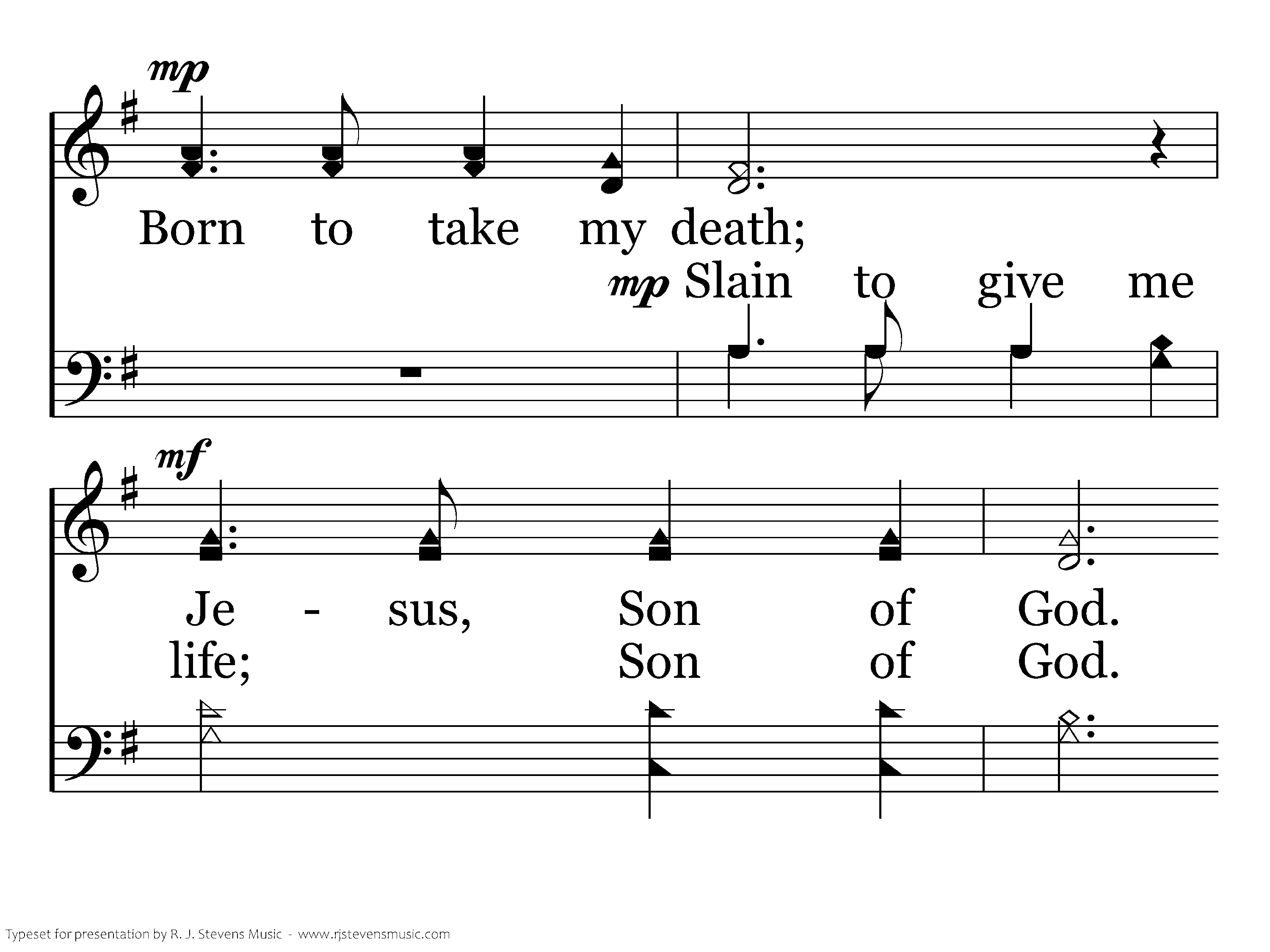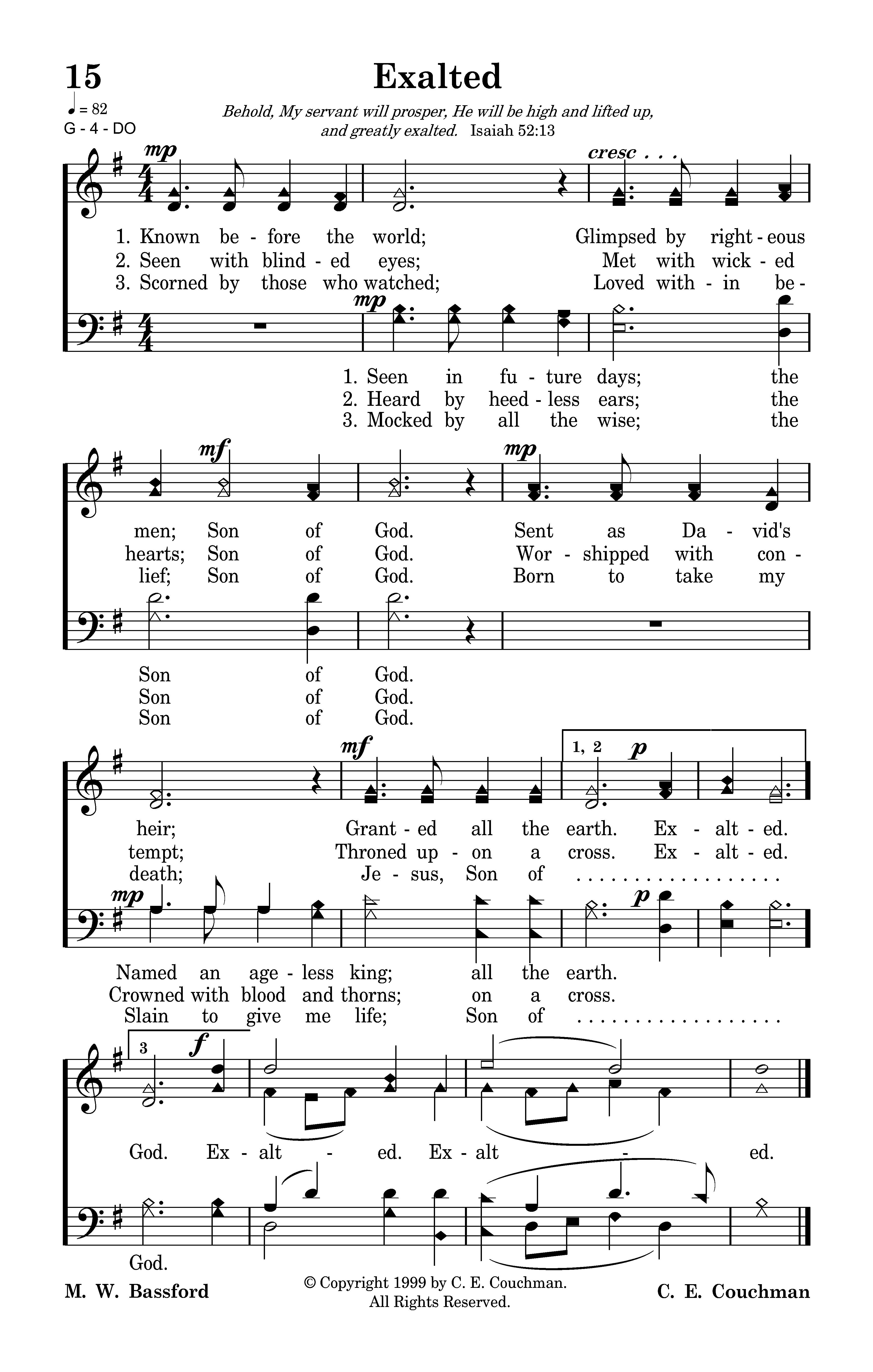 Scorned by those who watched; (Mocked by all the wise;) Loved within belief; Son of God. Born to take my death; (Slain to give me life;) Jesus, Son of God. Exalted. Exalted.