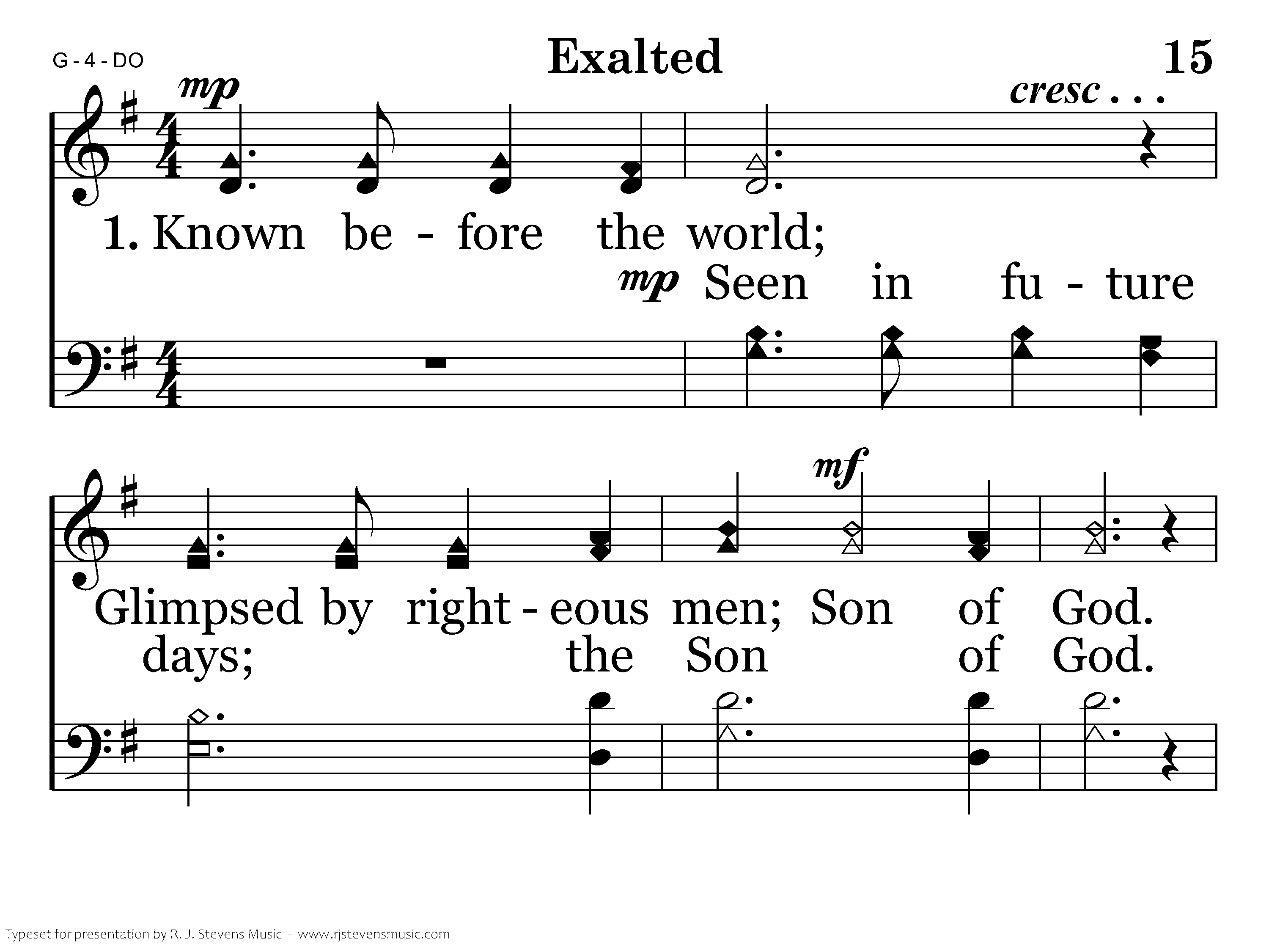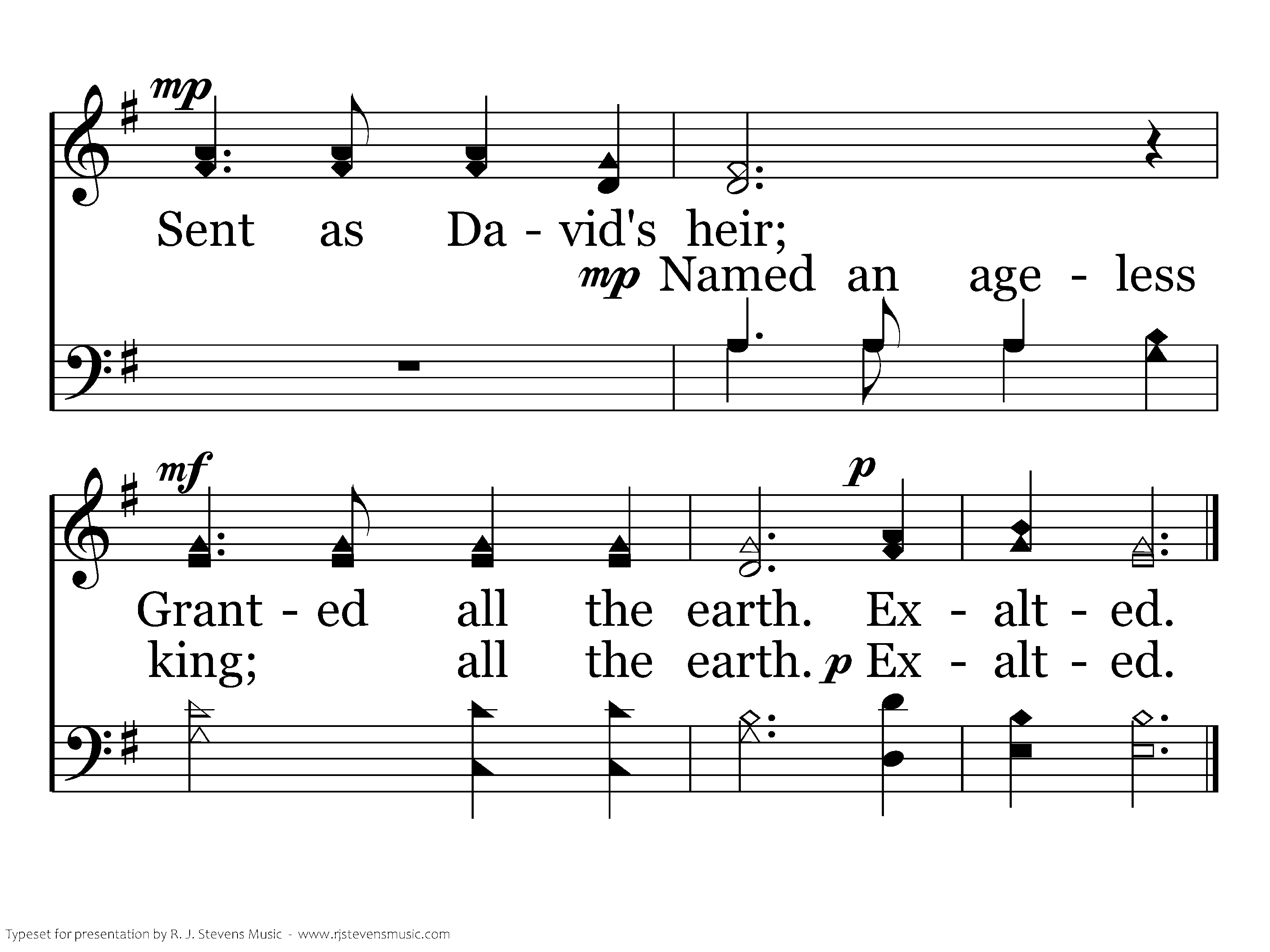 Known before the world; (Seen in future days;) Glimpsed by righteous men; (Son of God). Sent as David's heir; (Named an ageless king;) Granted all the earth. Exalted.