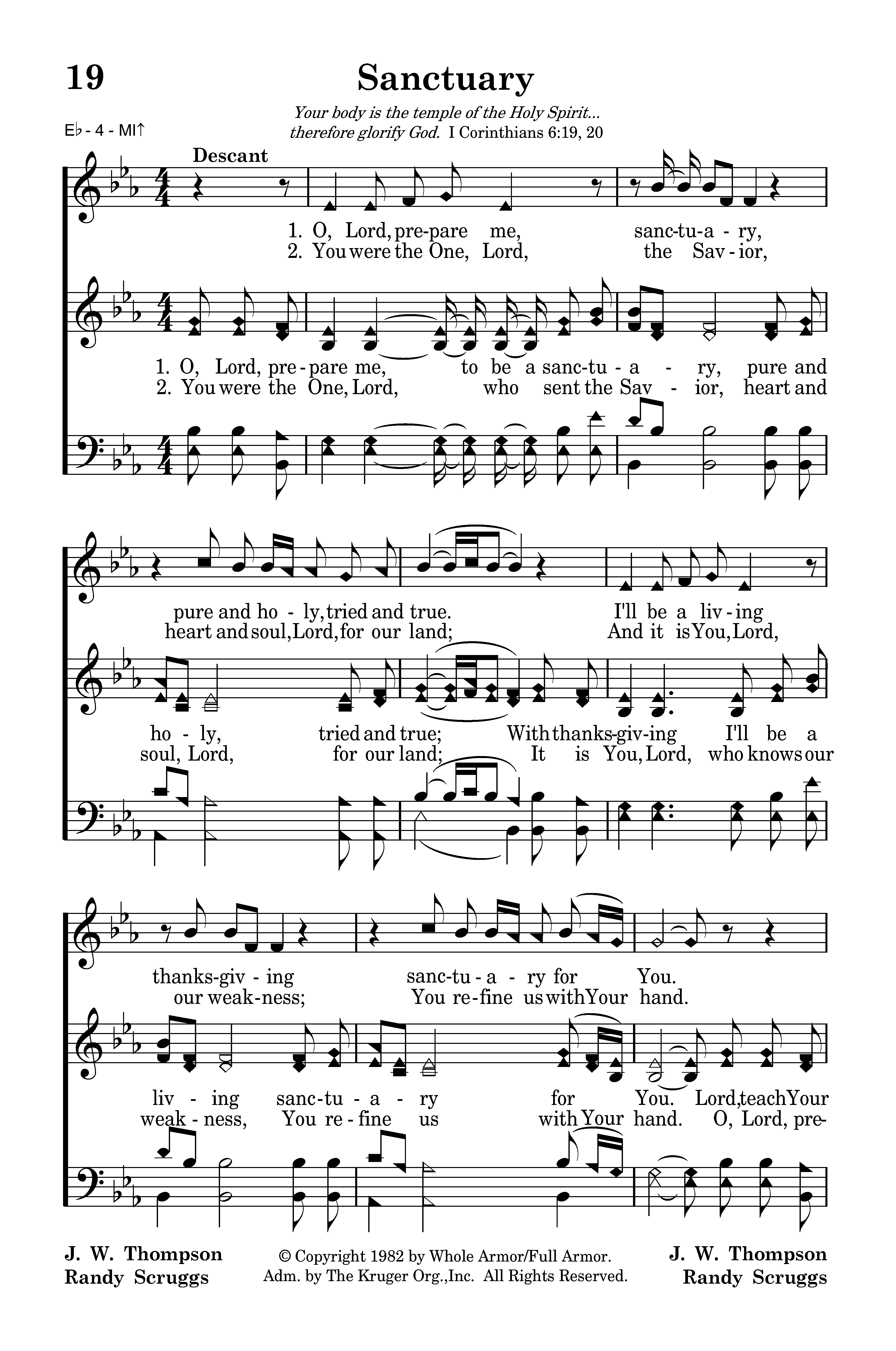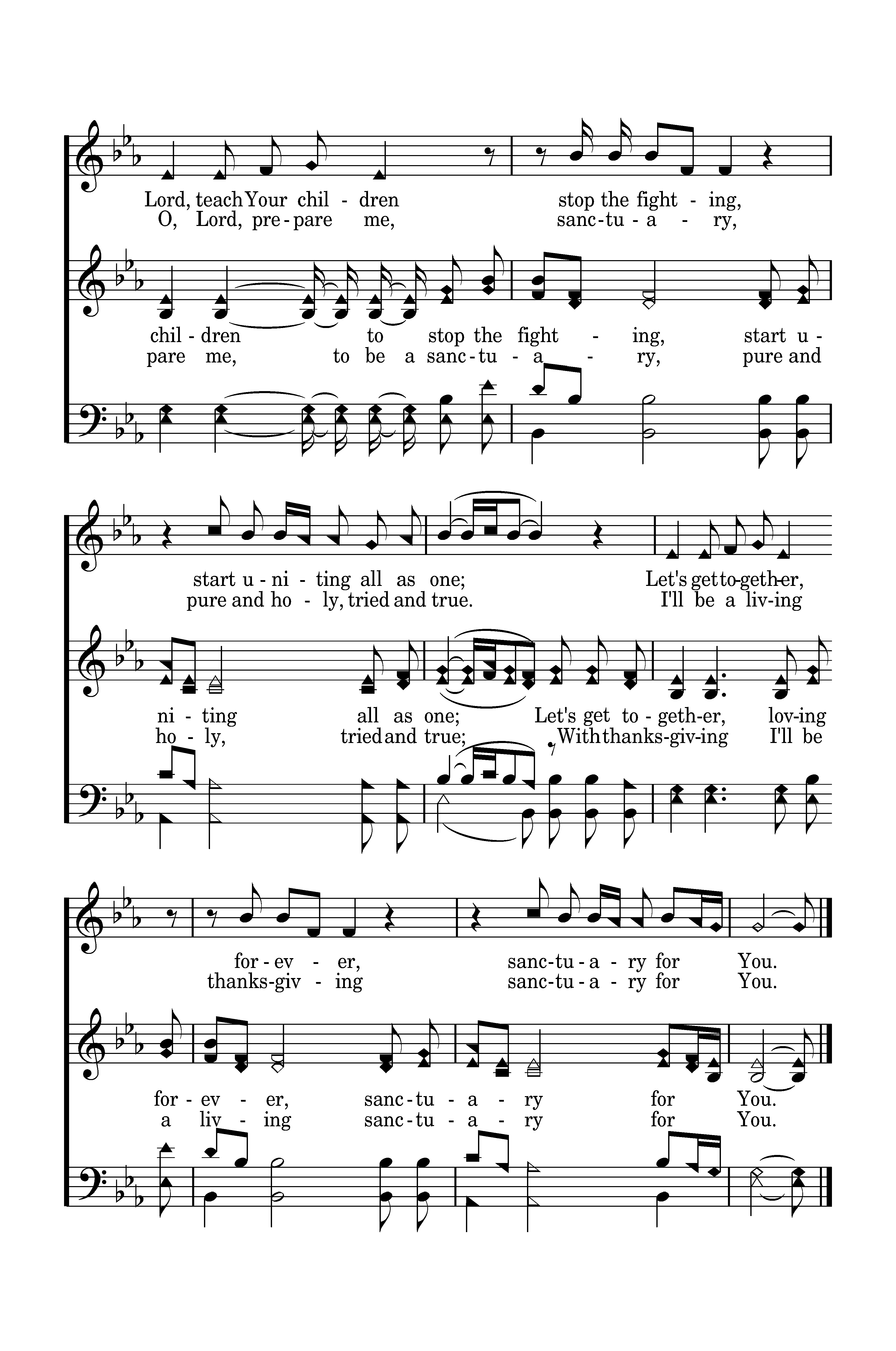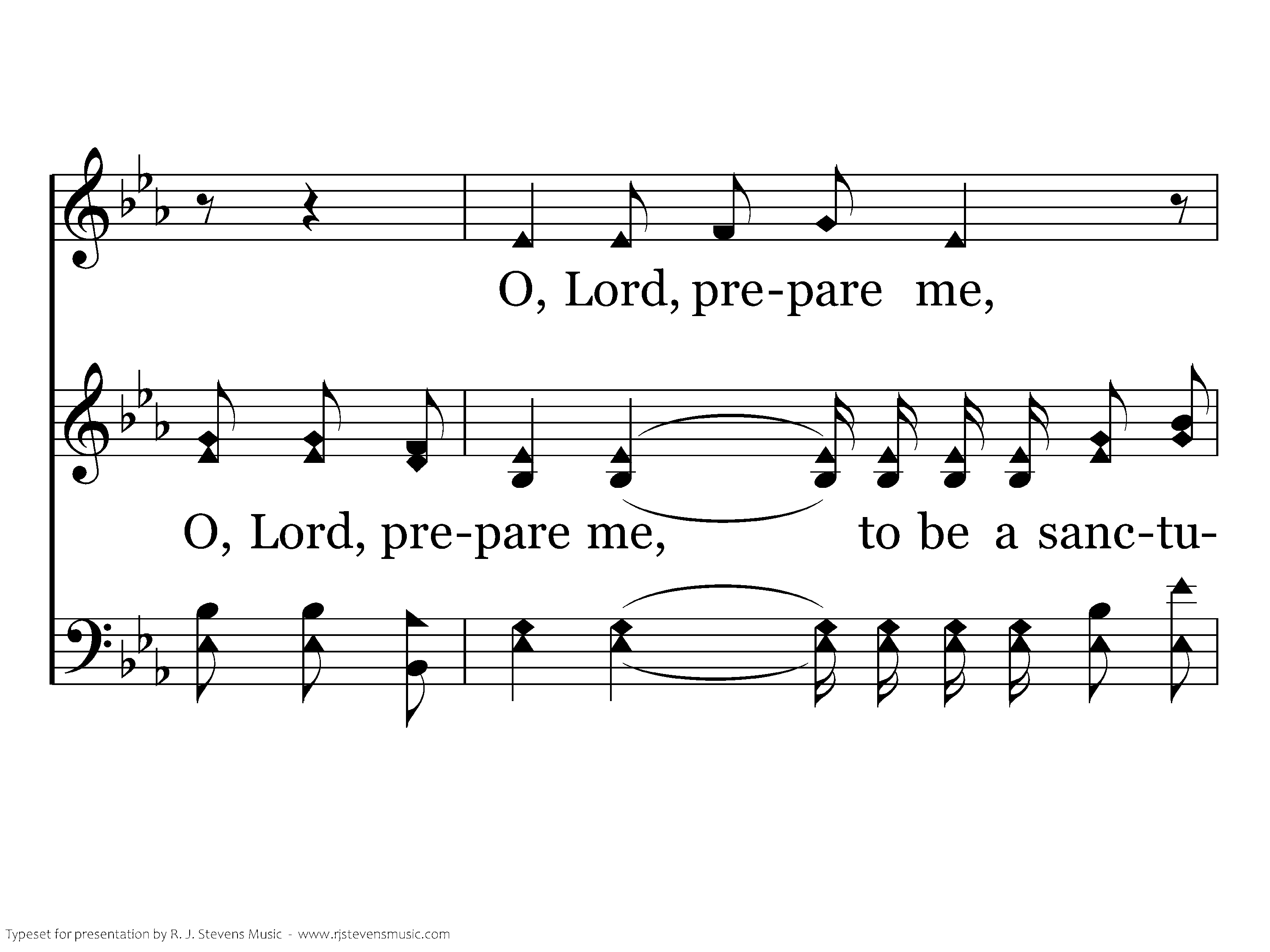 O, Lord, prepare me, to be a sanctuary, pure and holy, tried and true; With thanksgiving I'll be a living sanctuary for You. Lord, teach Your children to stop the fighting, start uniting all as one; Let's get together, loving forever, sanctuary for You.