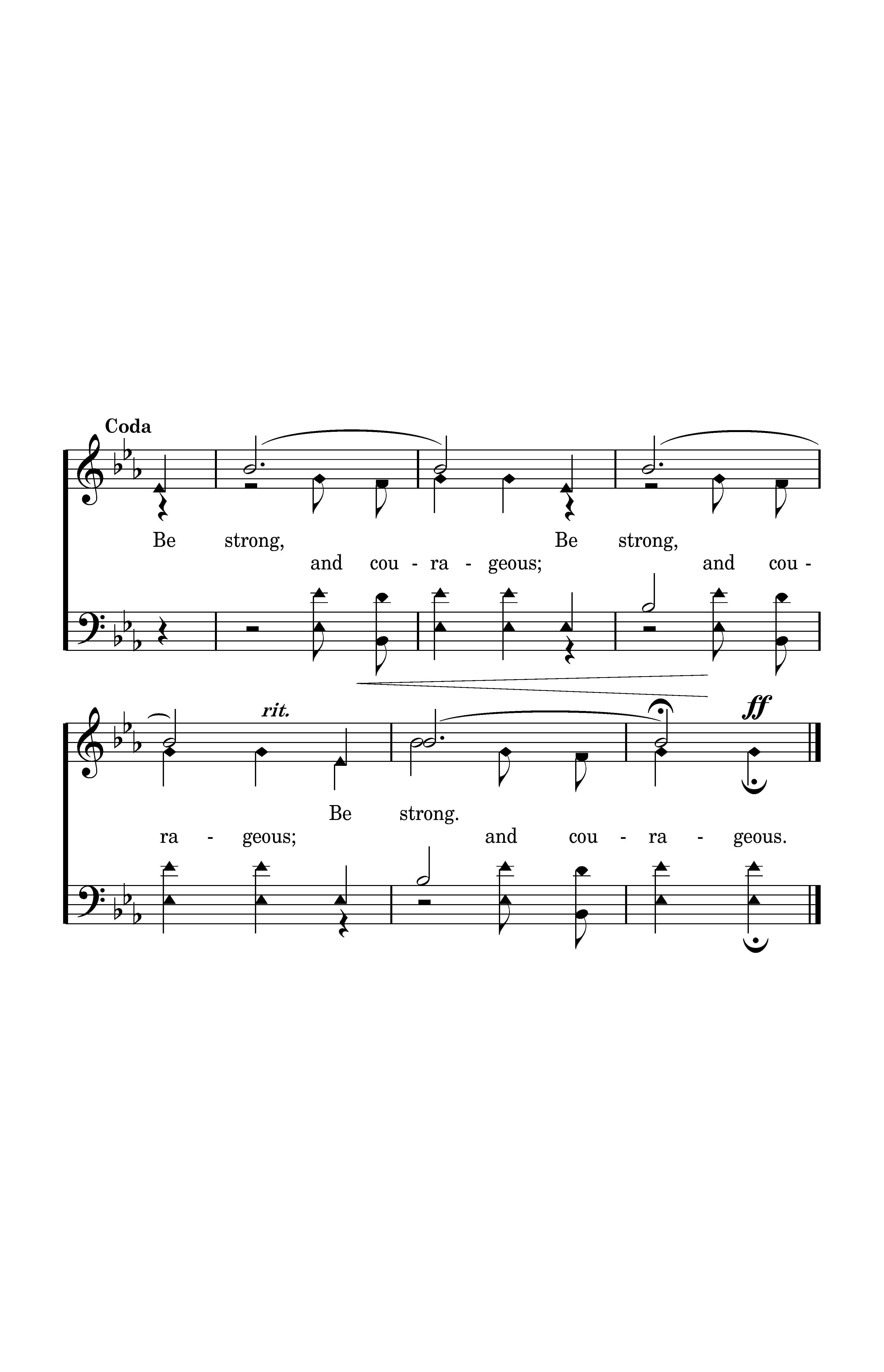 Be strong and courageous, consider His law; regard it with rev'rence; perform it with awe. Be careful to follow all God has decreed. For then He will bless you, and you will succceed.