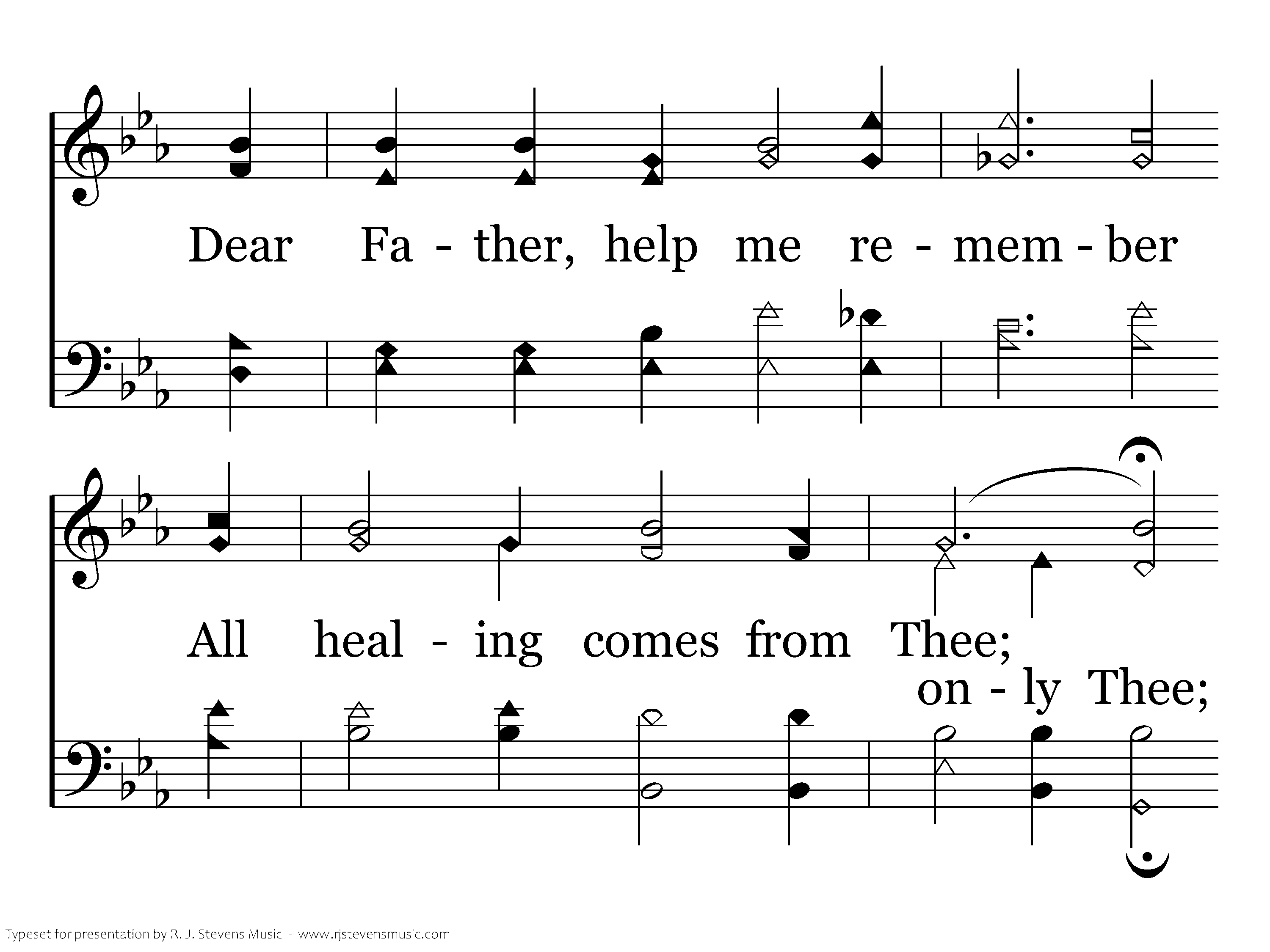 In days of grief and sorrow, In times of hurt or fear, Dear Father, help me remember All healing comes from Thee; And Thou art near!