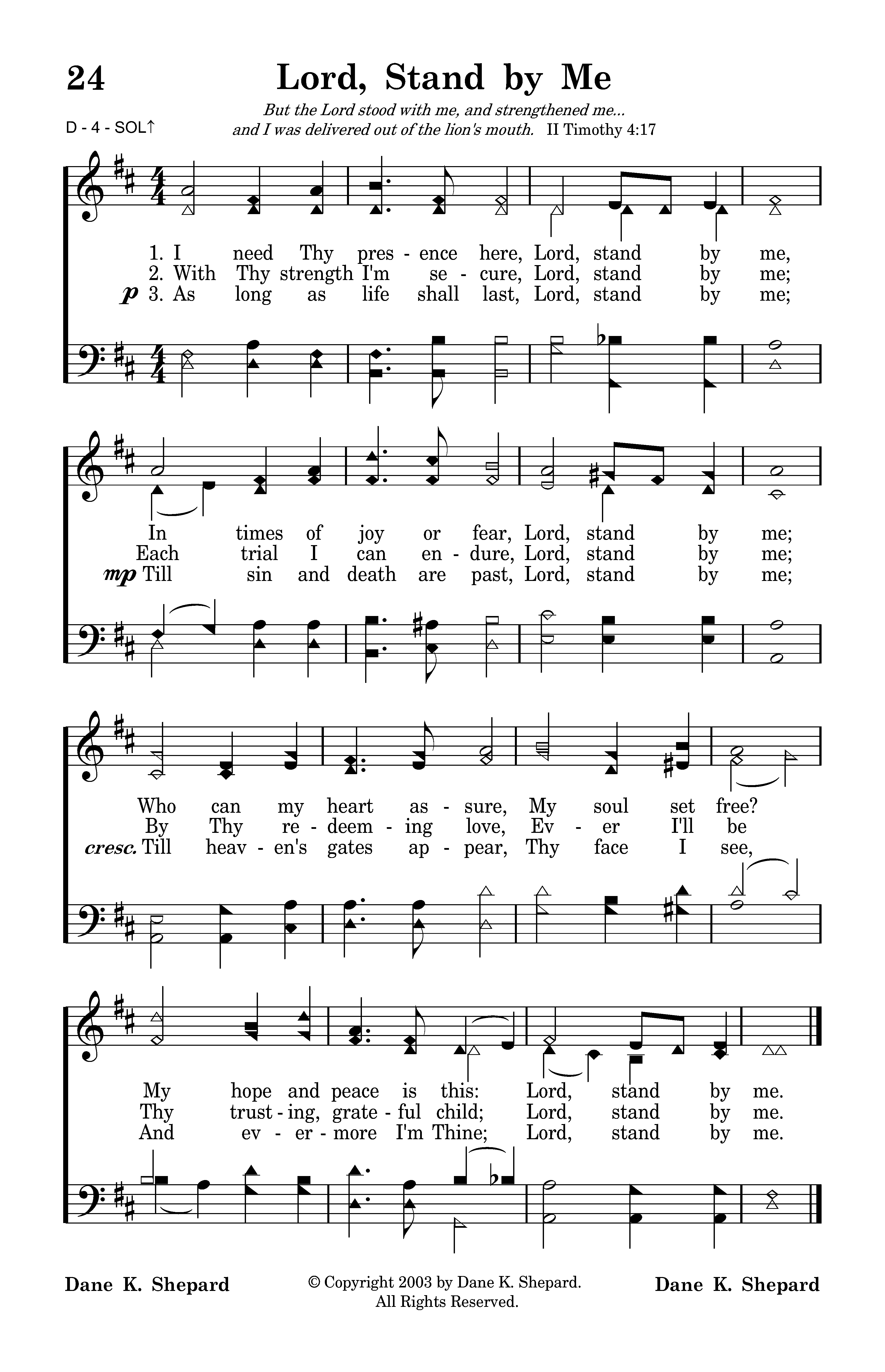 I need Thy presence here, Lord, stand by me, In times of joy or fear, Lord, stand by me; Who can my heart assure, My soul set free? My hope and peace is this: Lord, stand by me.