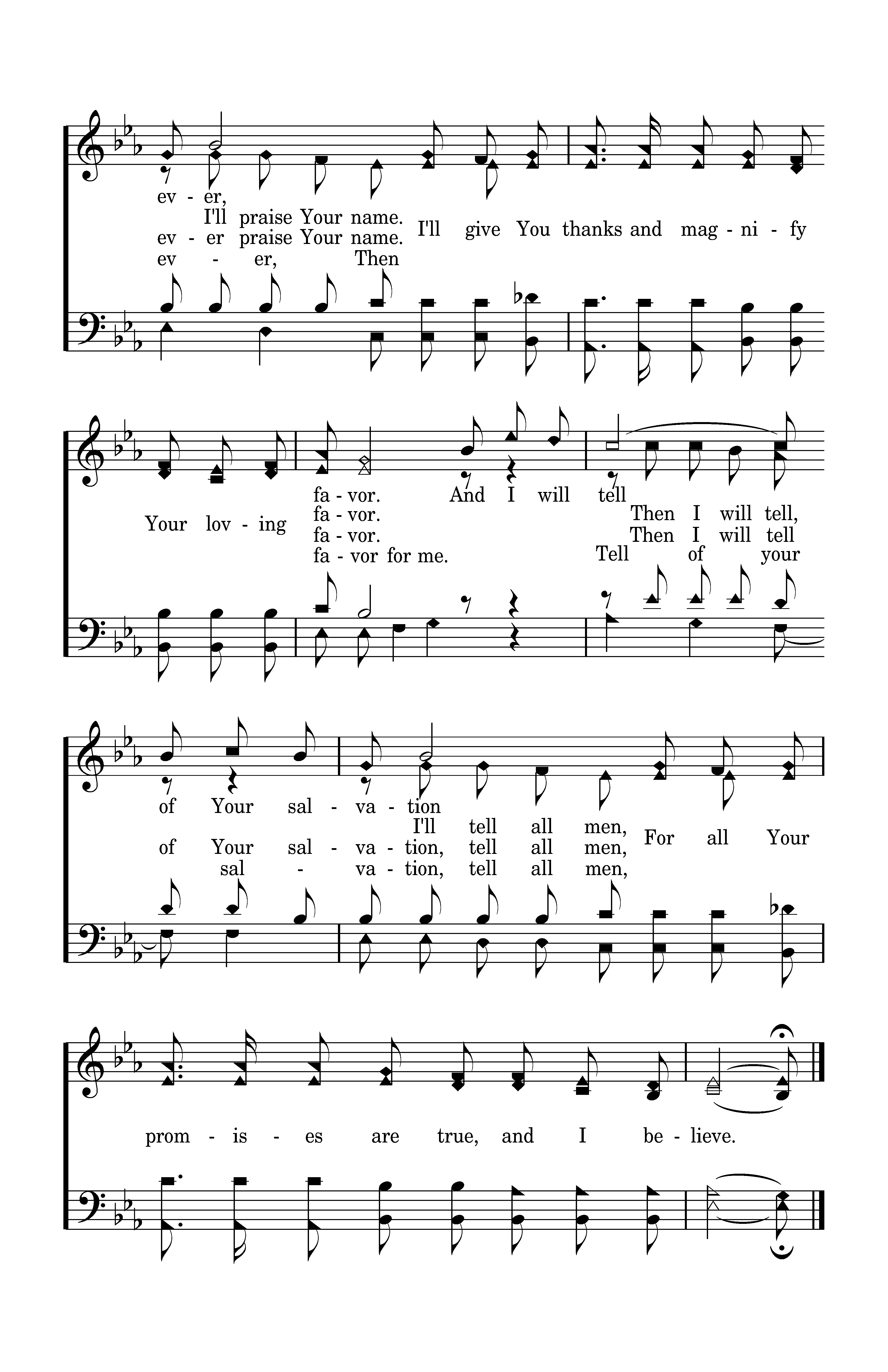 Then I will praise Your name forever, I'll give You thanks and magnify Your loving favor. And I will tell of Your salvation, For all Your promises are true, and I believe.