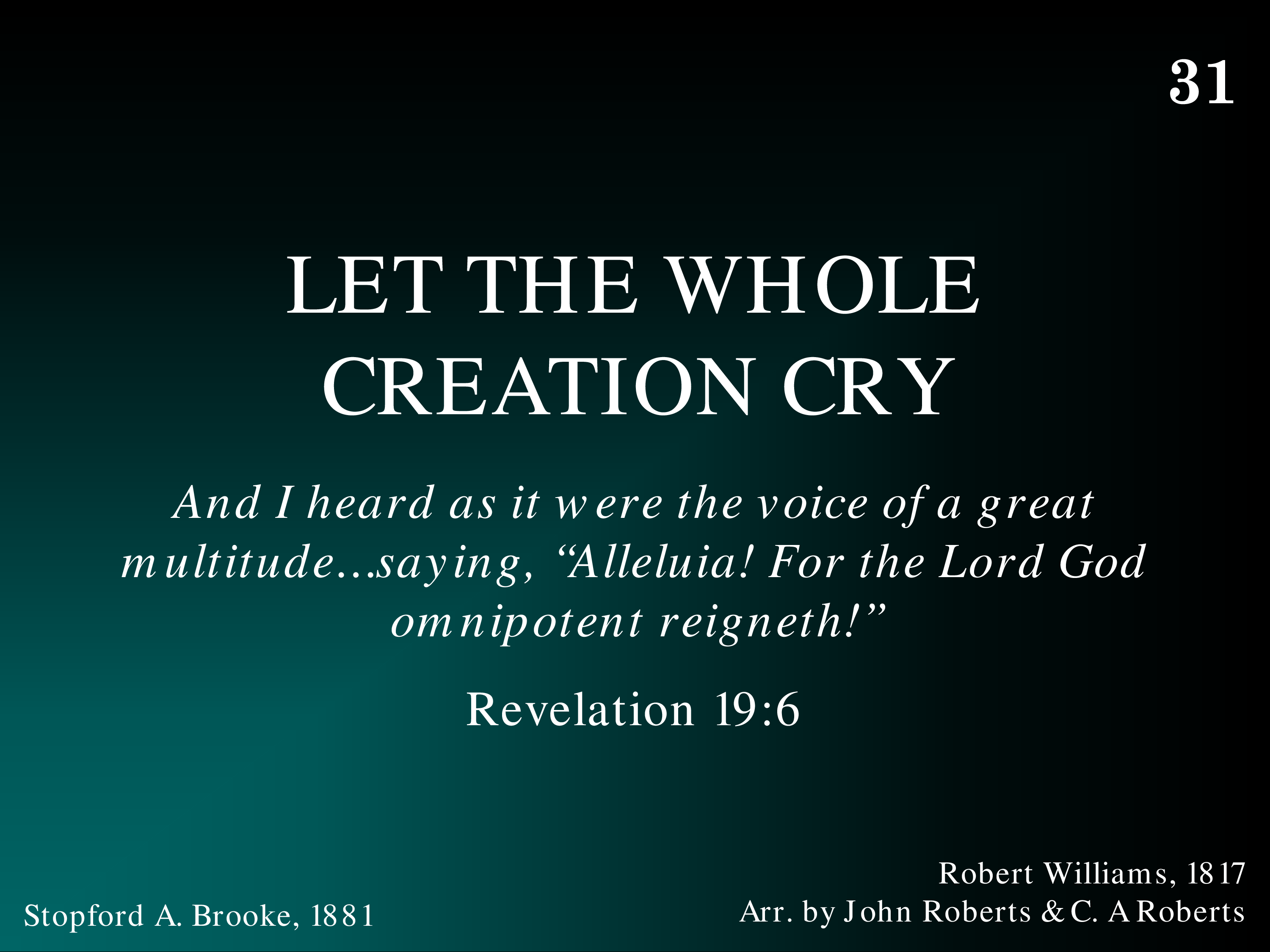Let the whole creation cry: Alleluia! "Glory to the Lord on high!" Alleluia! Heav'n and earth, awake and sing, Alleluia! God is good and God is King! Alleluia!