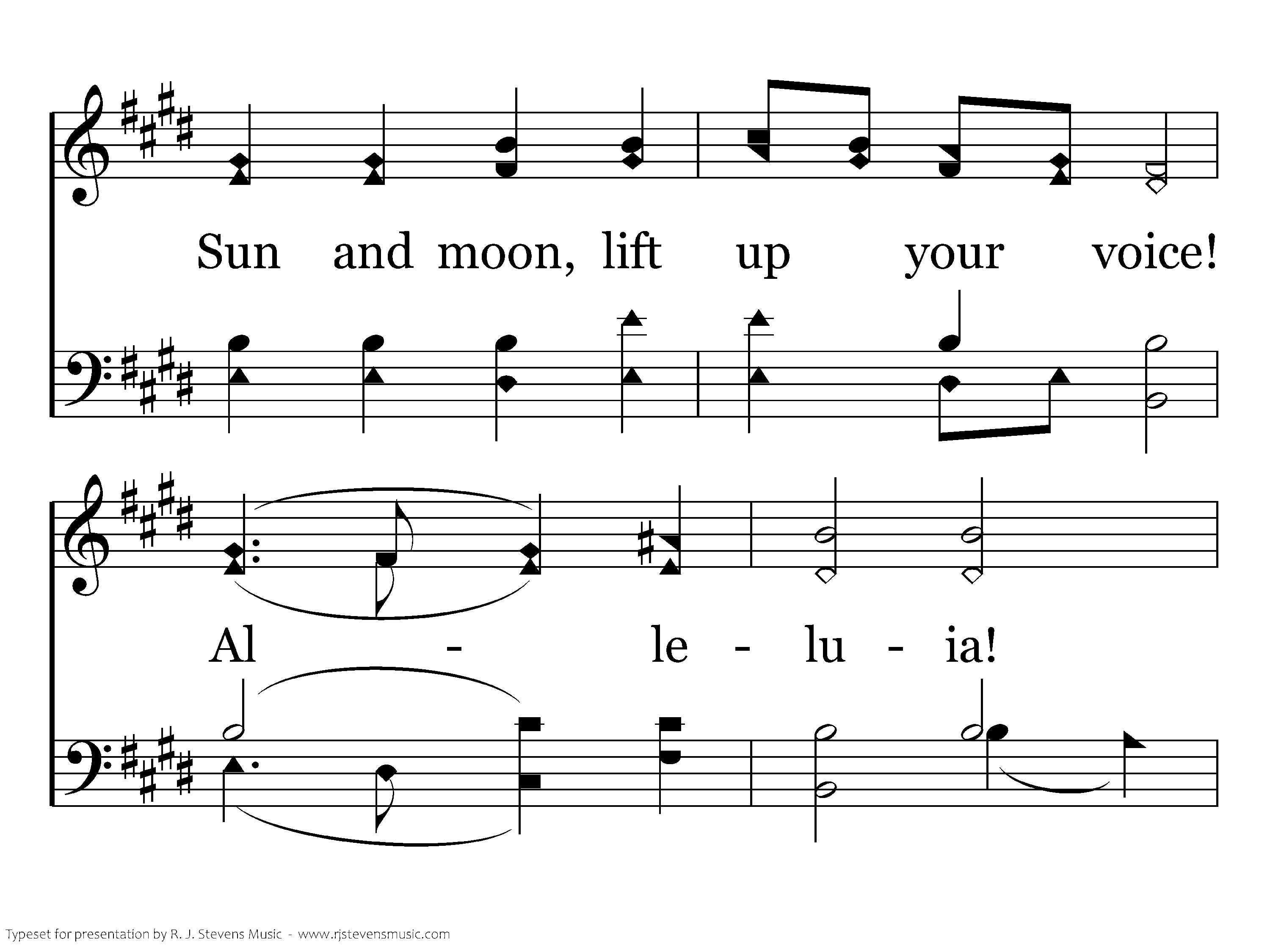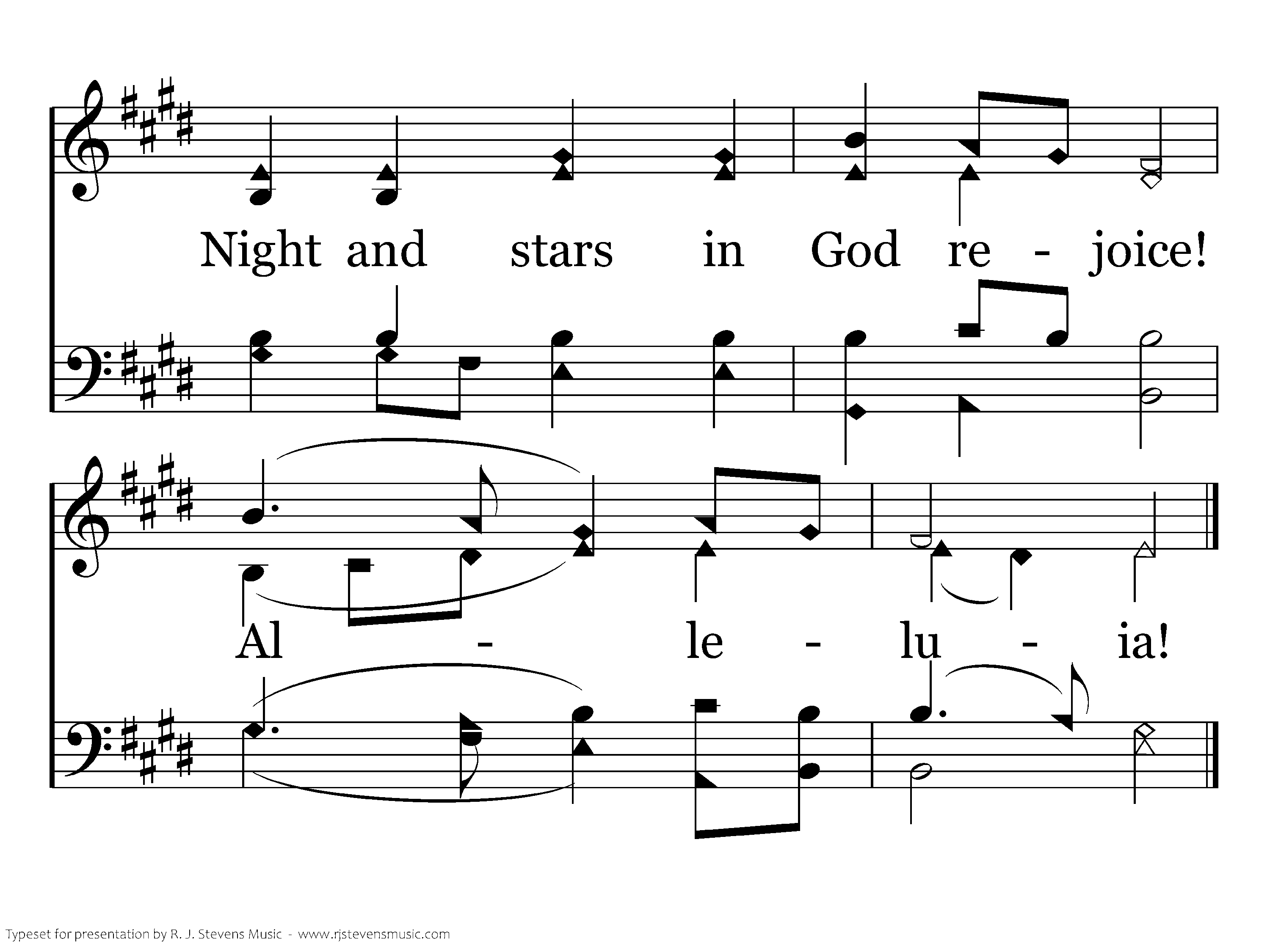 Praise Him all ye hosts above, Alleluia! Ever bright and fair in love, Alleluia! Sun and moon, lift up your voice! Alleluia! Night and stars in God rejoice! Alleluia!
