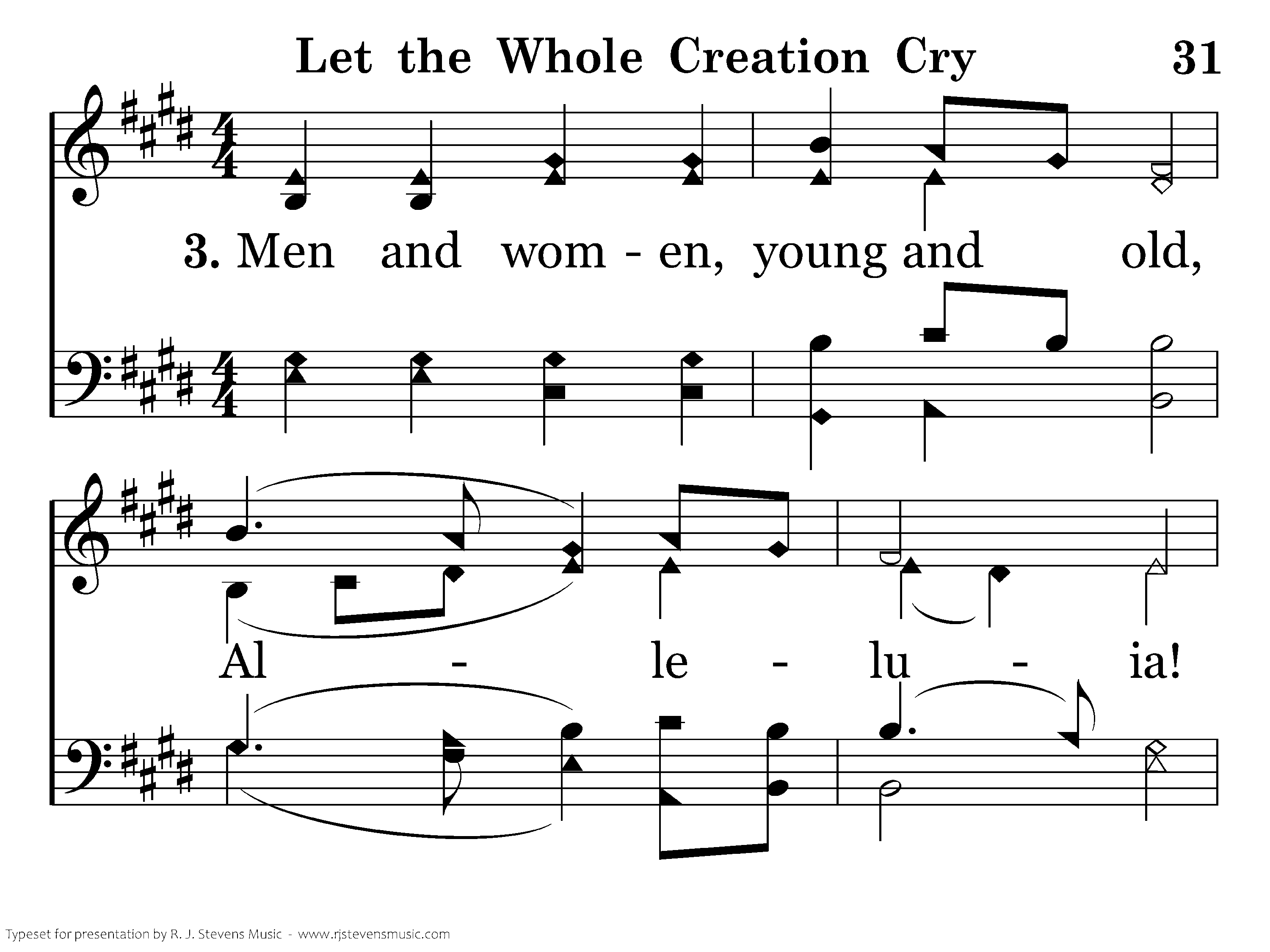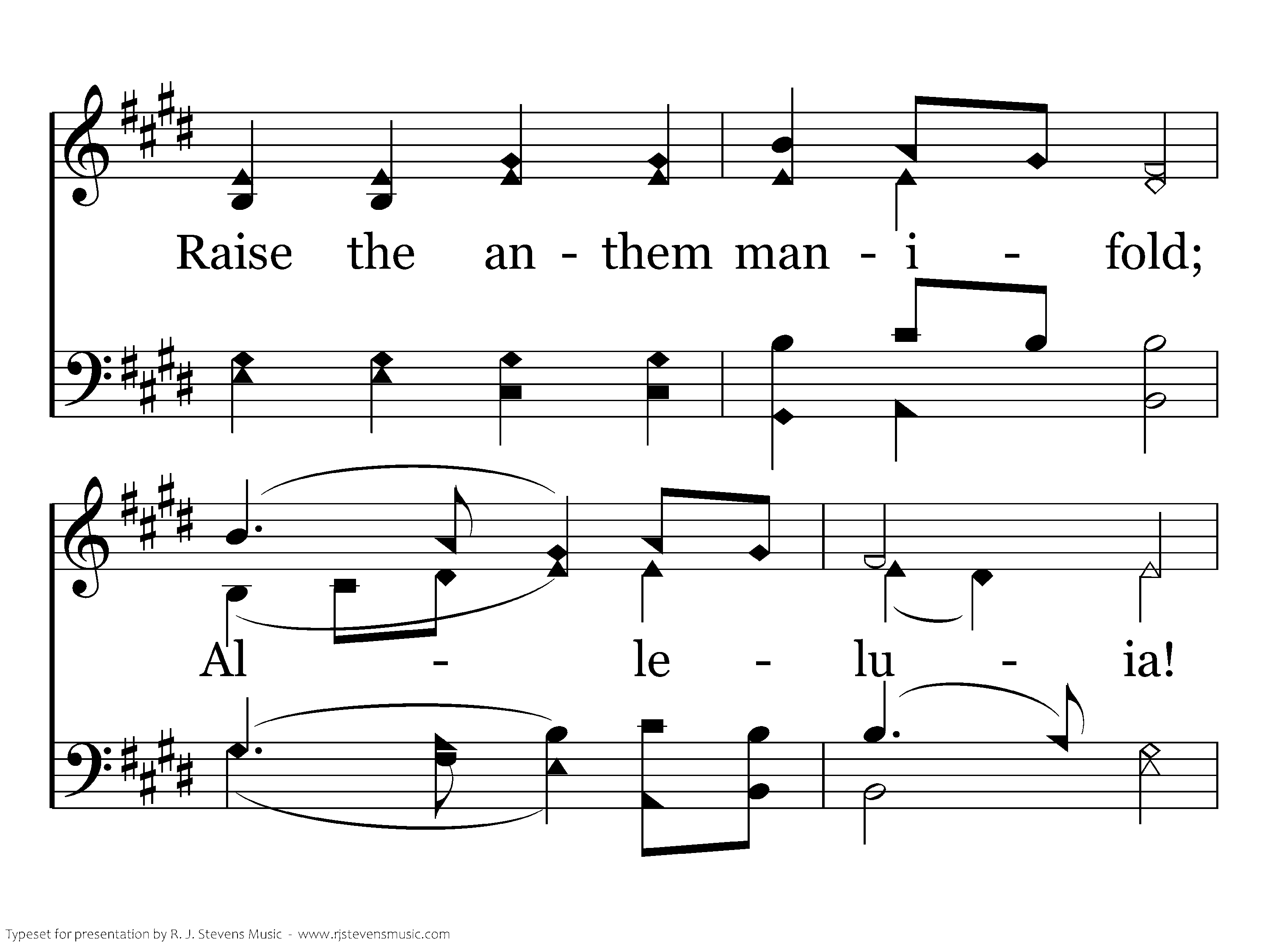 Men and women, young and old, Alleluia! Raise the anthem manifold; Alleluia! Children with your happy hearts, Alleluia! In this worship, sing your parts. Alleluia!