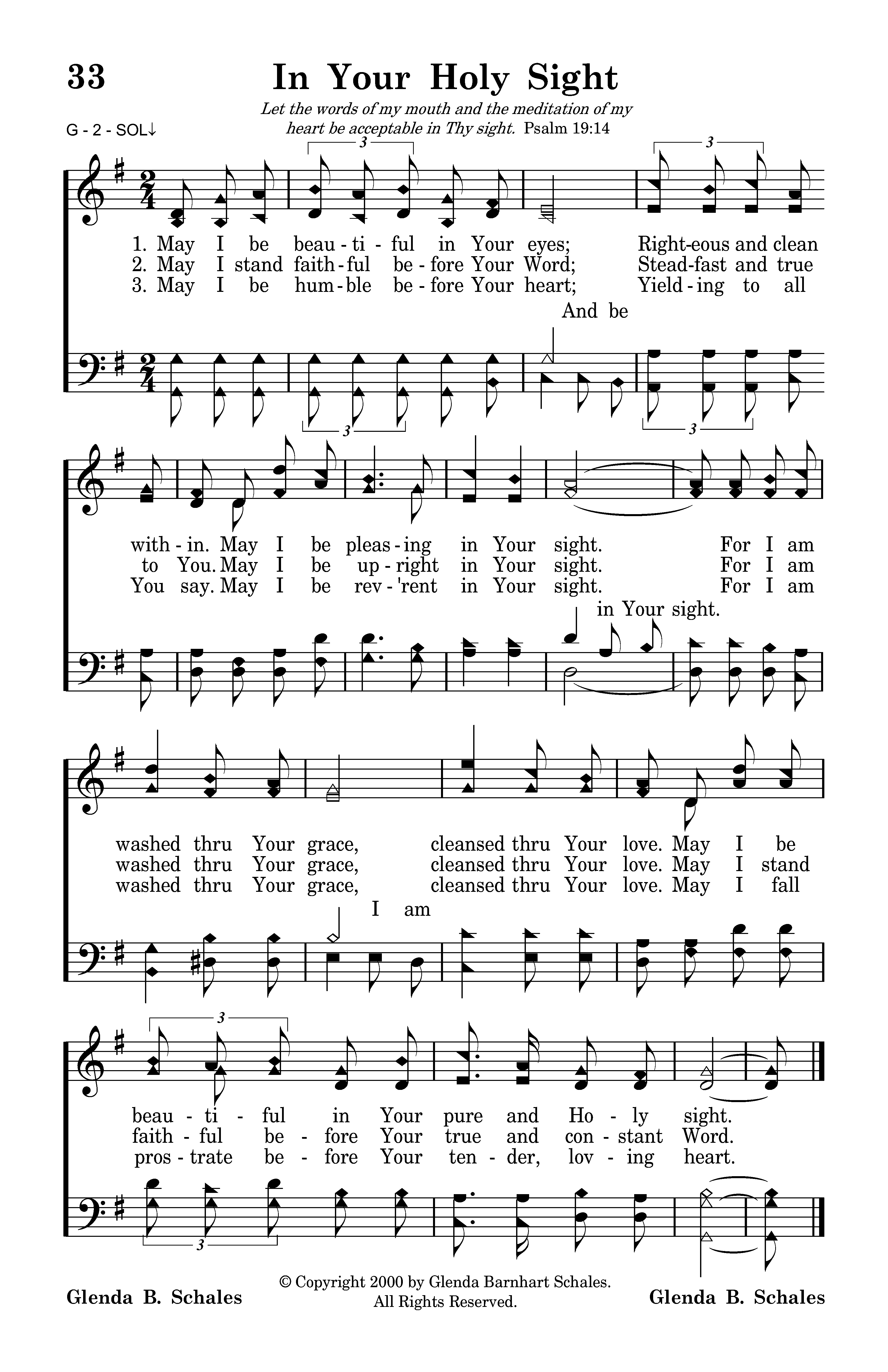 May I be beautiful in Your eyes. (And be) Righteous and clean within. May I be pleasing in Your sight. (in Your sight.) For I am washed thro' Your grace, (I am) cleansed thro' Your love., May I be beautiful in Your pure and Holy sight.