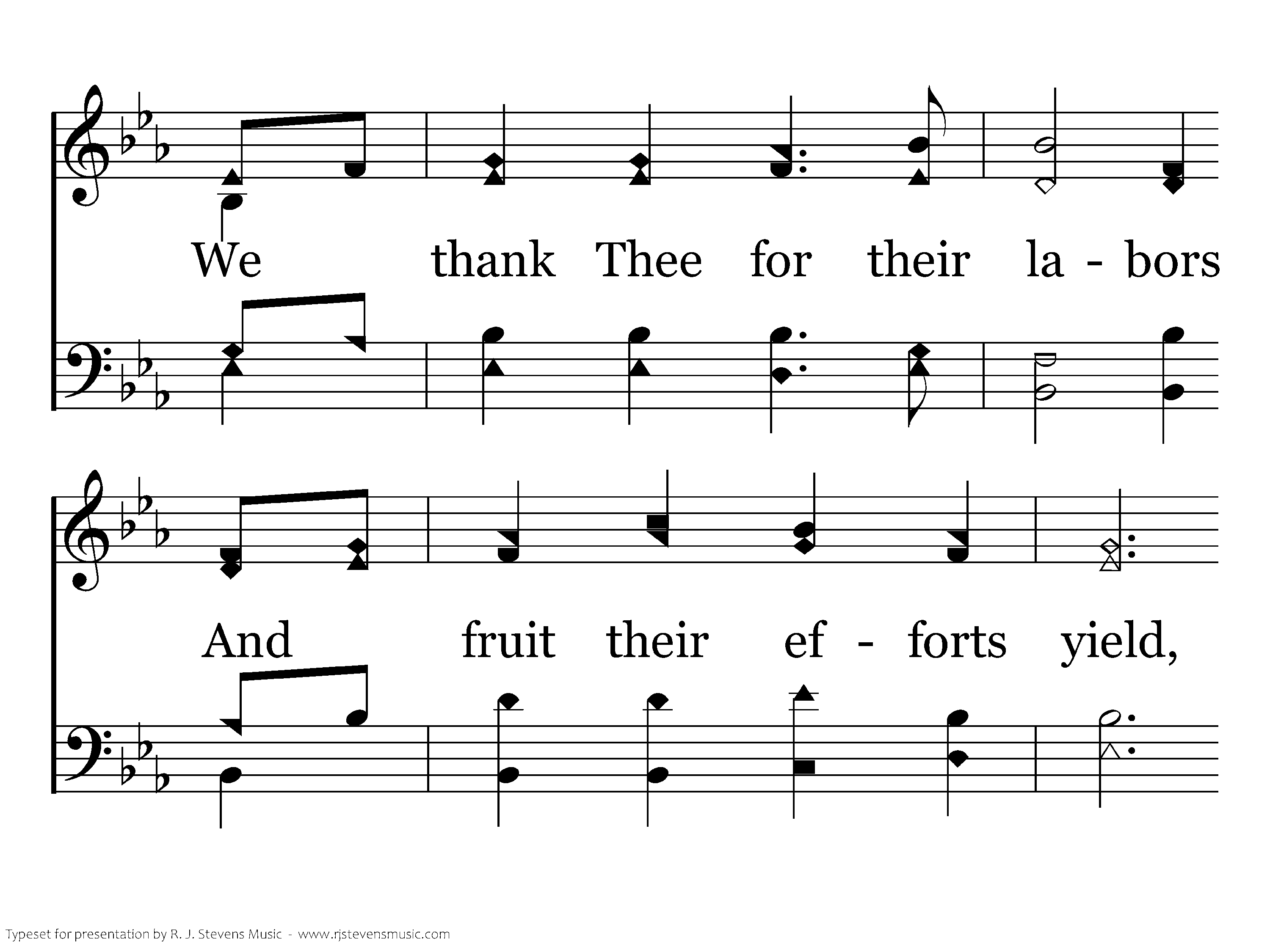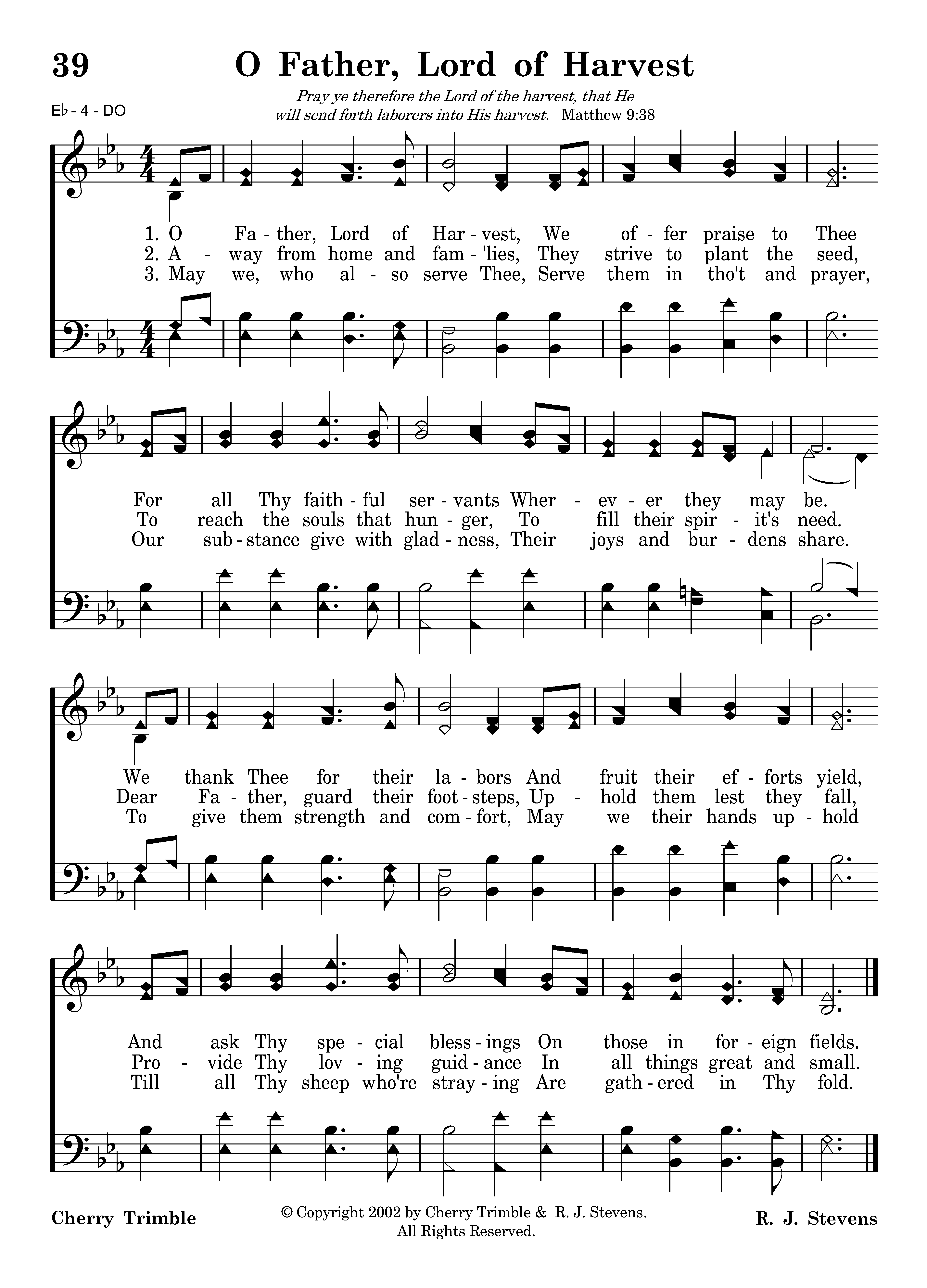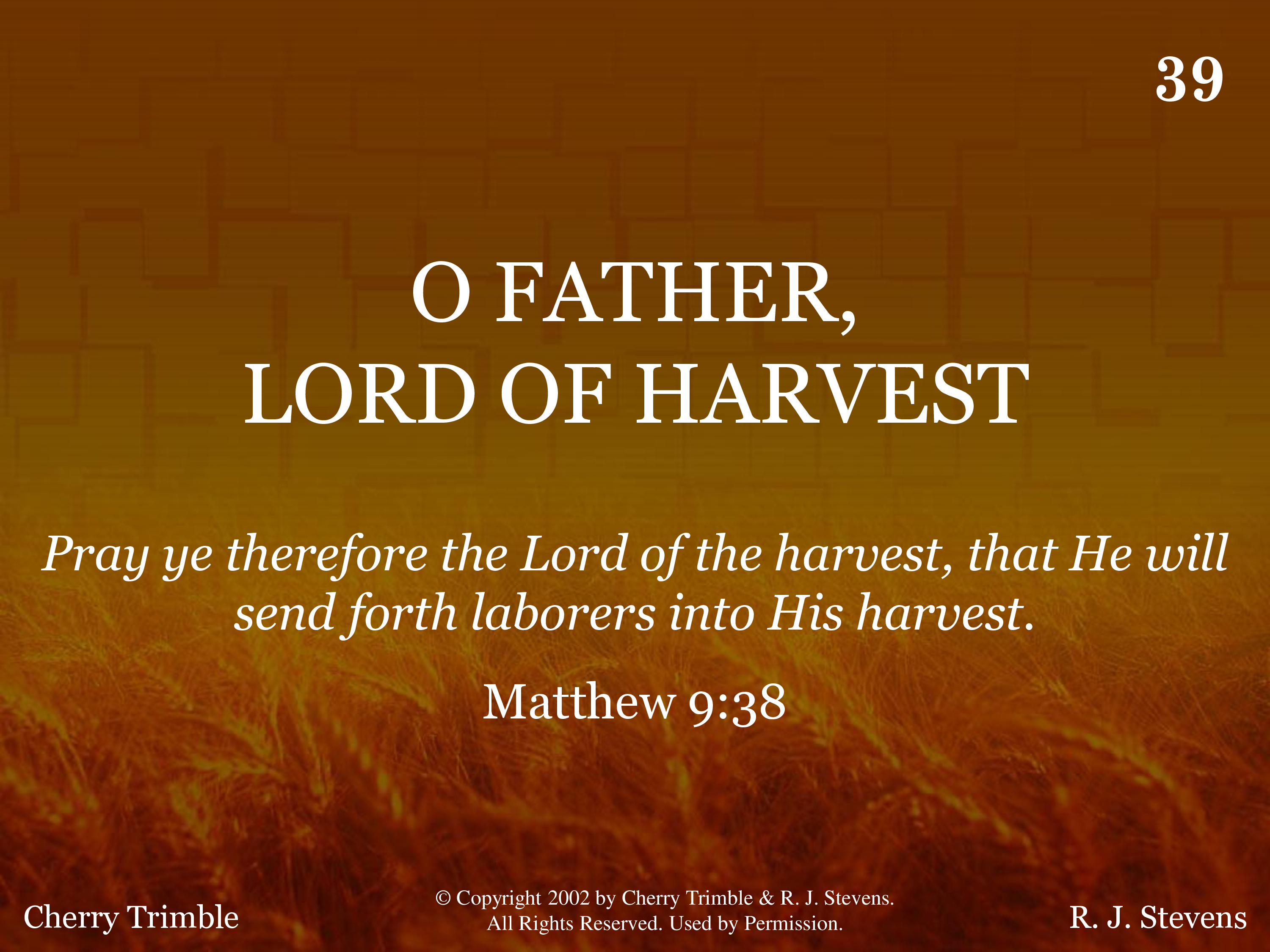 O Father, Lord of Harvest, We offer praise to Thee For all Thy faithful servants Wherever they may be. We thank Thee for their labors And fruit their efforts yield, And ask Thy special blessings On those in foreign fields.