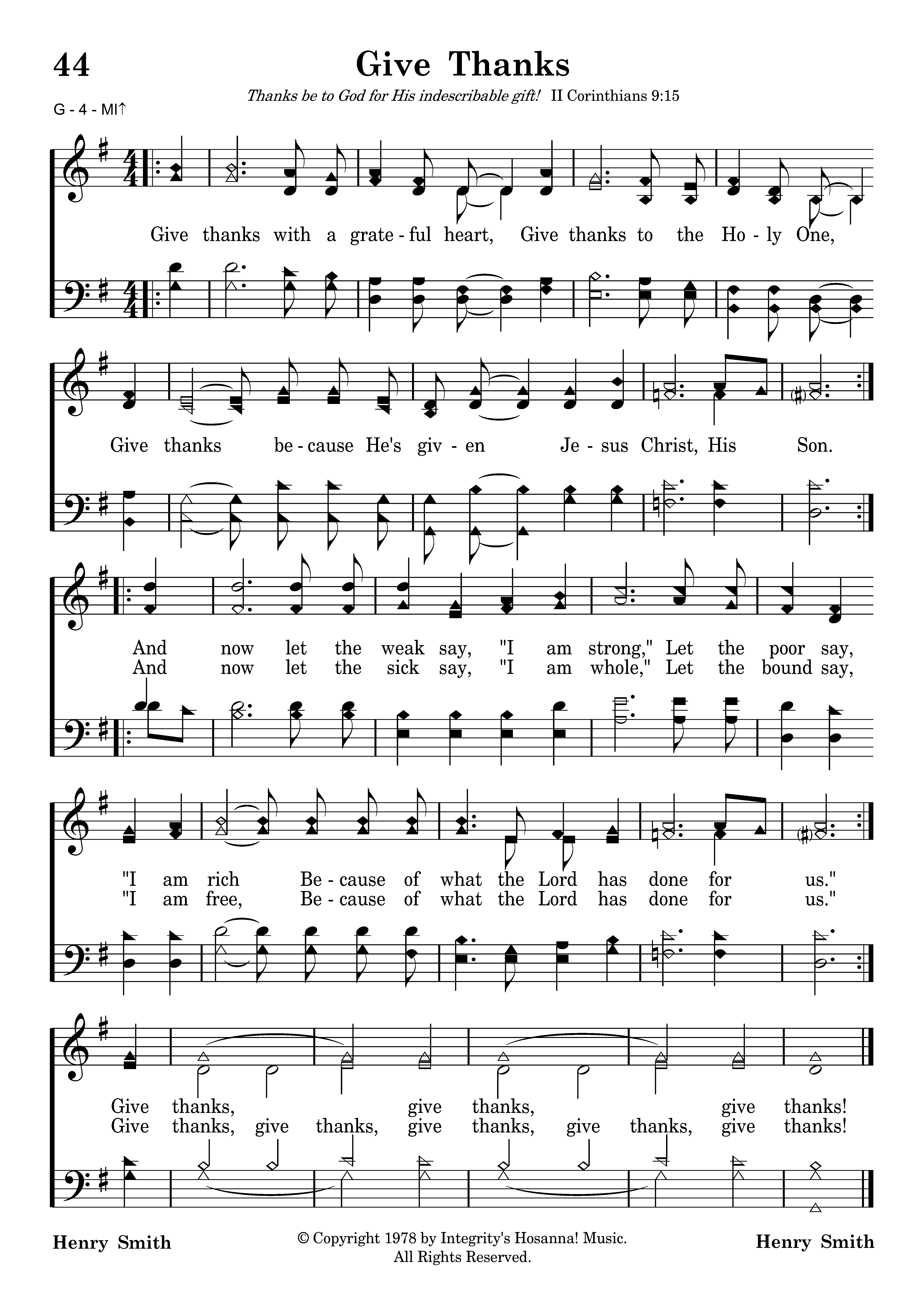 Give thanks with a grateful heart, Give thanks to the Holy One, Give thanks because He's given Jesus Christ, His son. Give thanks with a grateful heart, Give thanks to the Holy One, Give thanks because He's given Jesus Christ, His son. And now let the weak say, "I am strong," Let the poor say, "I am rich Because of what the Lord has done for us." And now let the sick say, "I am whole," Let the bound say, "I am free, Because of what the Lord has done for us." Give thanks, give thanks, give thanks!