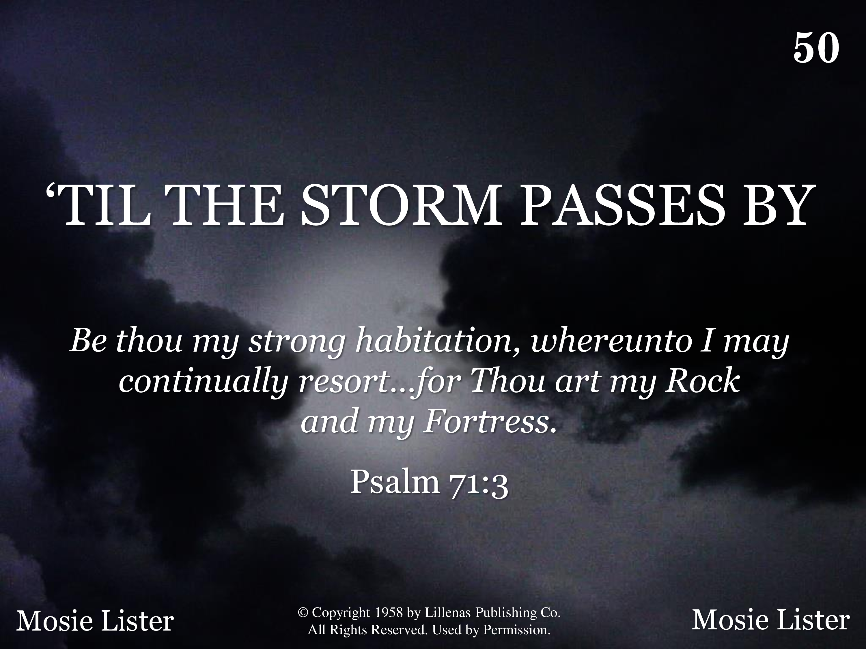 Till the storm passes over, 'til the thunder sounds no more, 'til the clouds roll forever from the sky, Hold me fast, let me stand in the hollow of Thy hand, Keep me safe 'til the storm passes by.