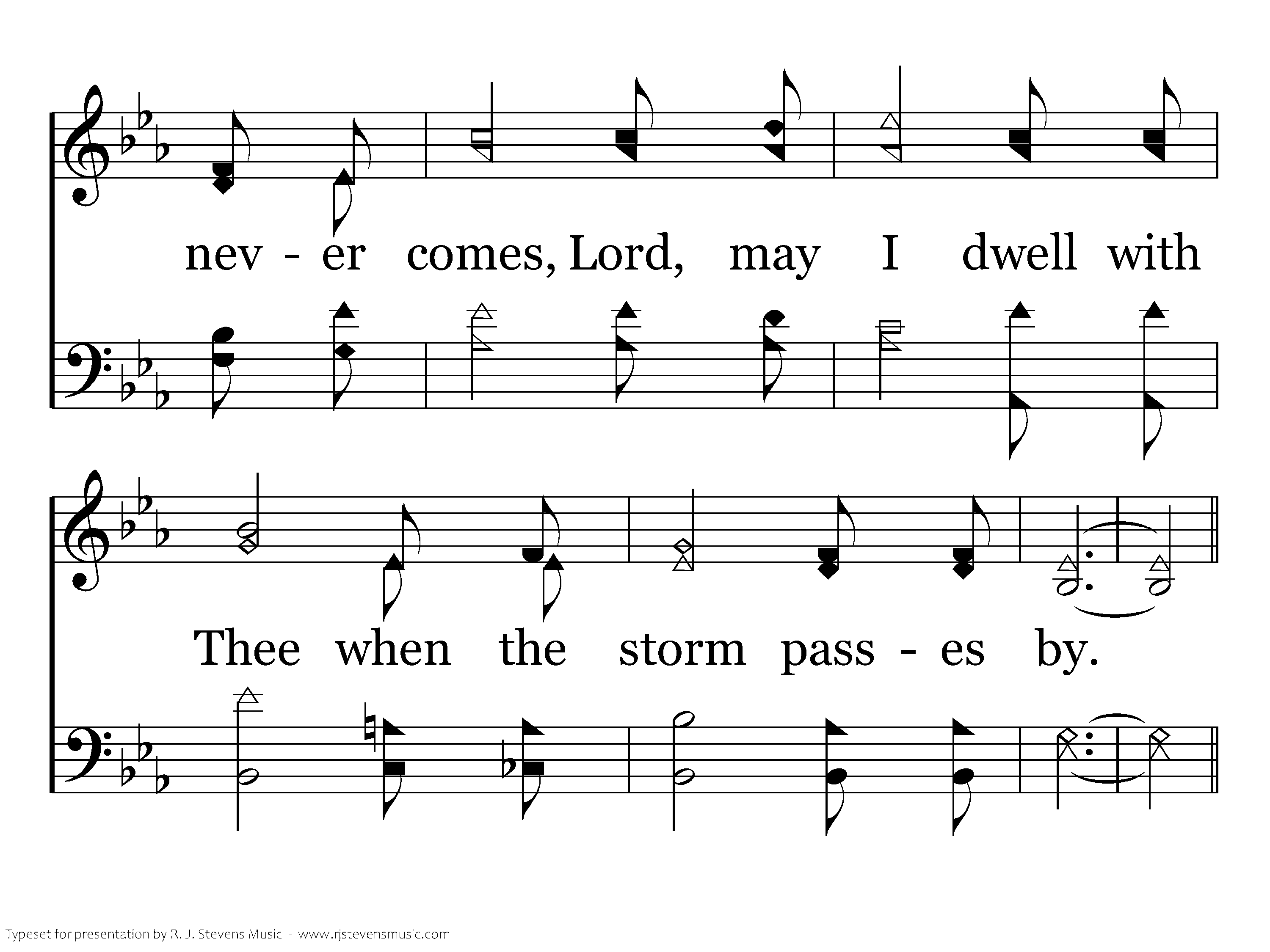 When the long night has ended and the storms come no more, Let me stand in Thy presence on that bright, peaceful shore. In that land where the tempest never comes, Lord, may I dwell with Thee when the storm passes by.