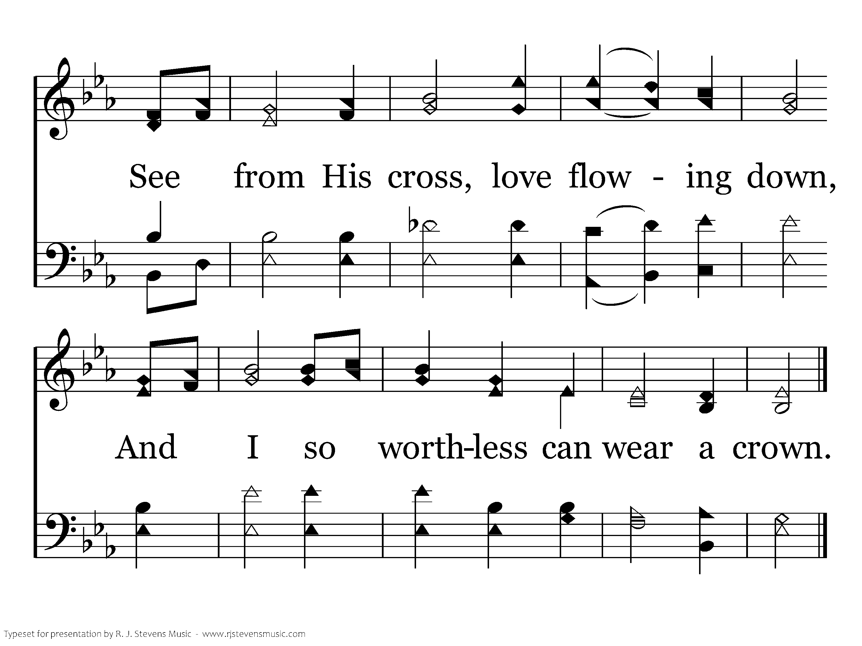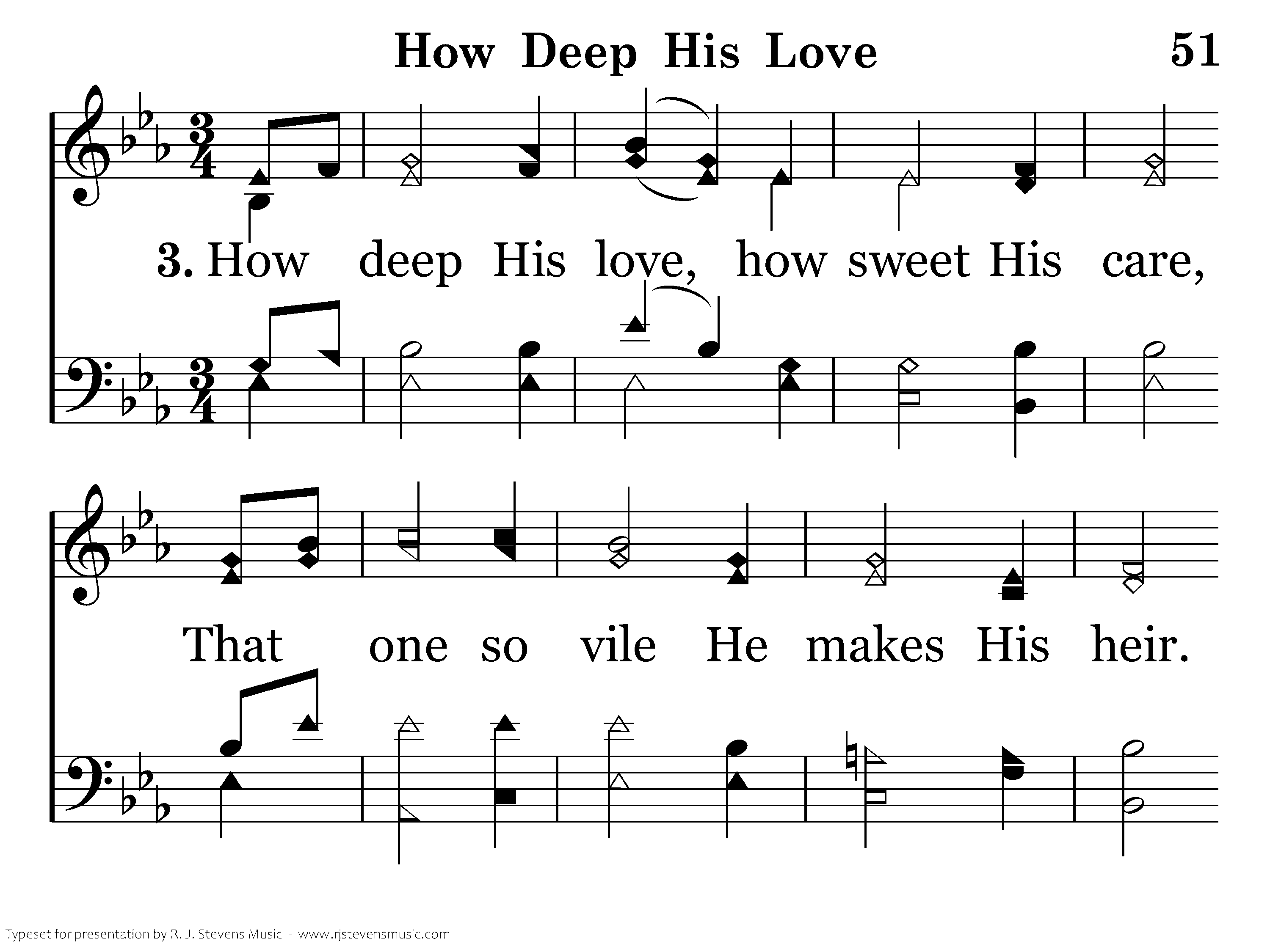 How deep His love, how sweet His care, That one so vile He makes His heir. See from His cross, love flowing down; And I so worthless can wear a crown.