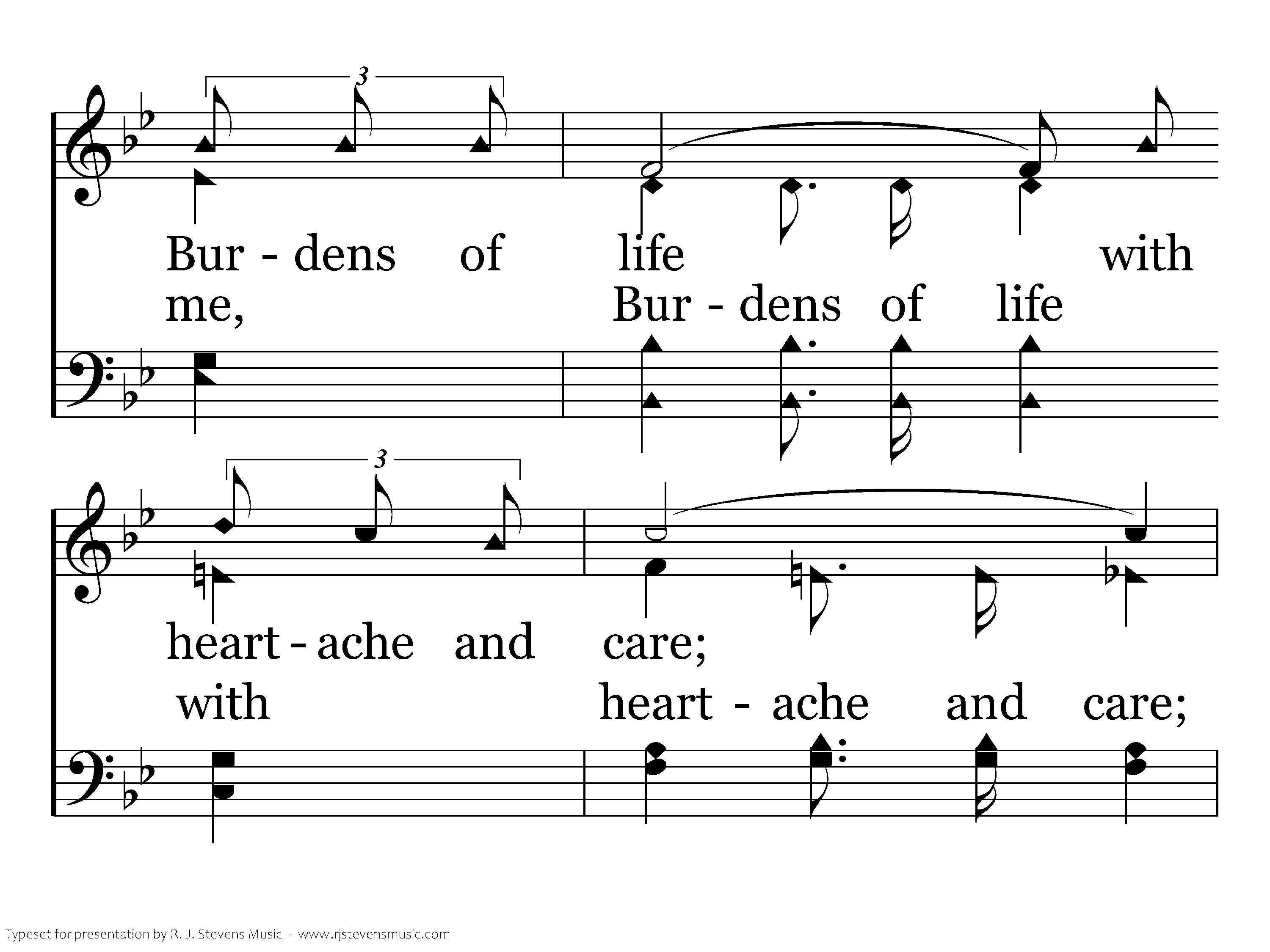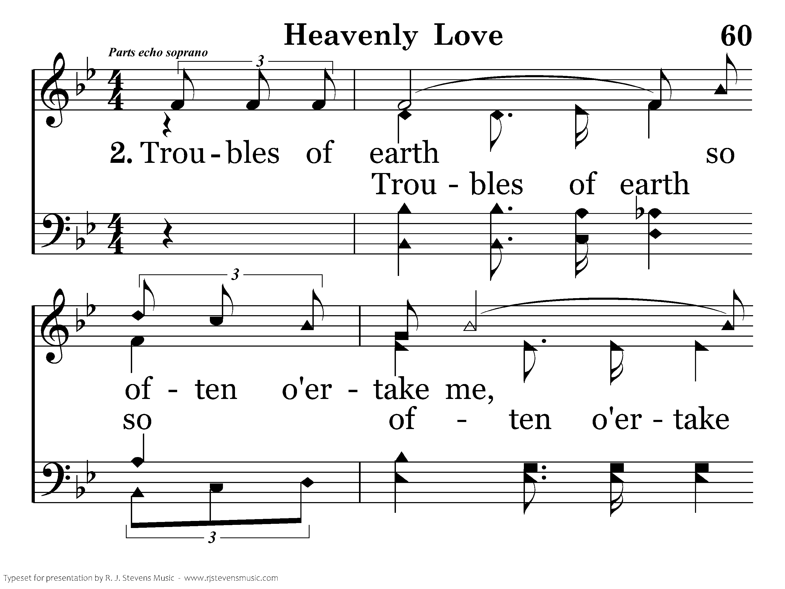 Troubles of earth so often o'er take me, Burdens of life with heartache and care; Heavenly love will never forsake me, Filling my need, Jesus is there.