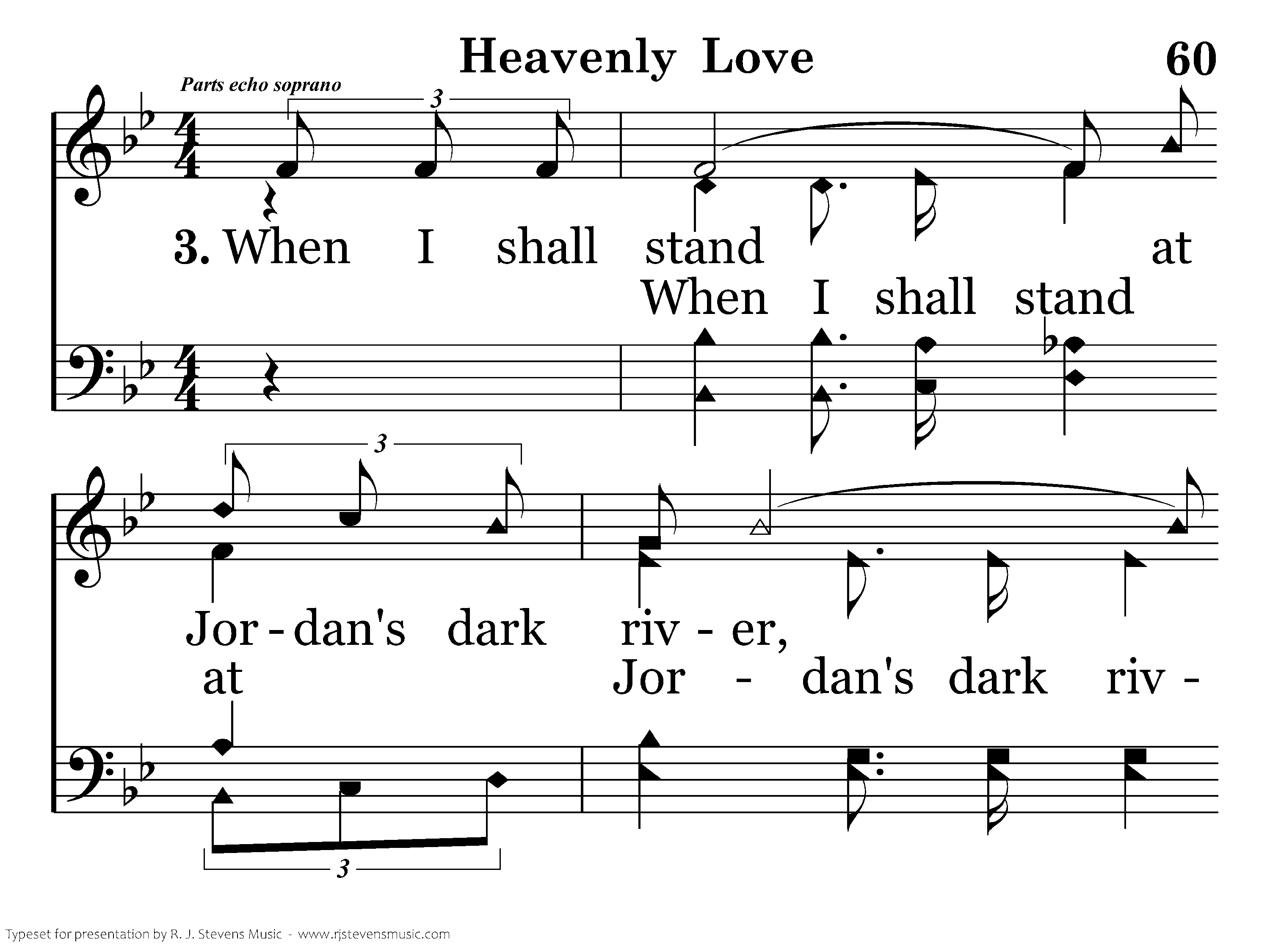 When I shall stand at Jordan's dark river, Shadows of night are gath'ring above; There is a pow'r I know will deliver, Heavenly love, heavenly love.