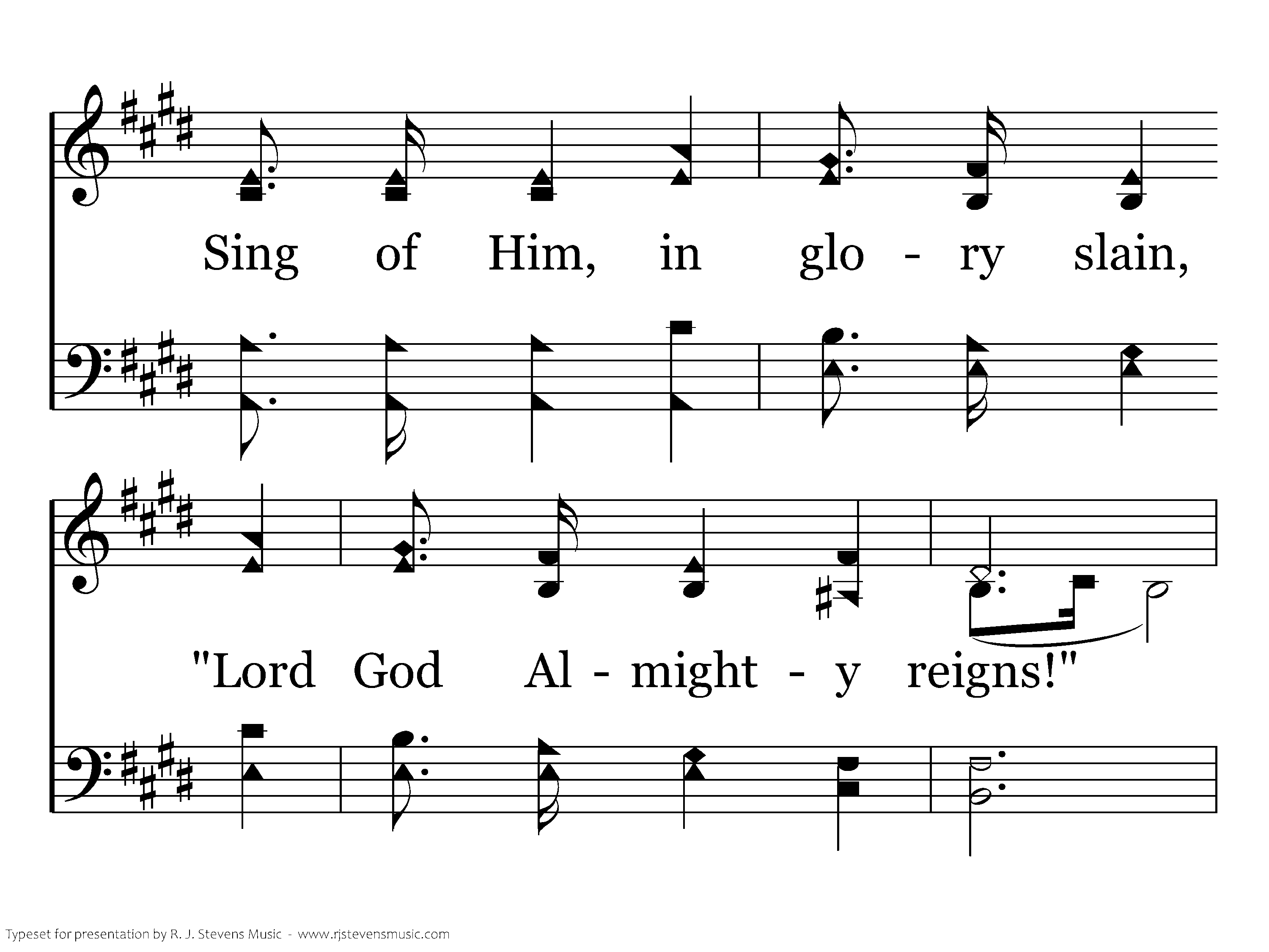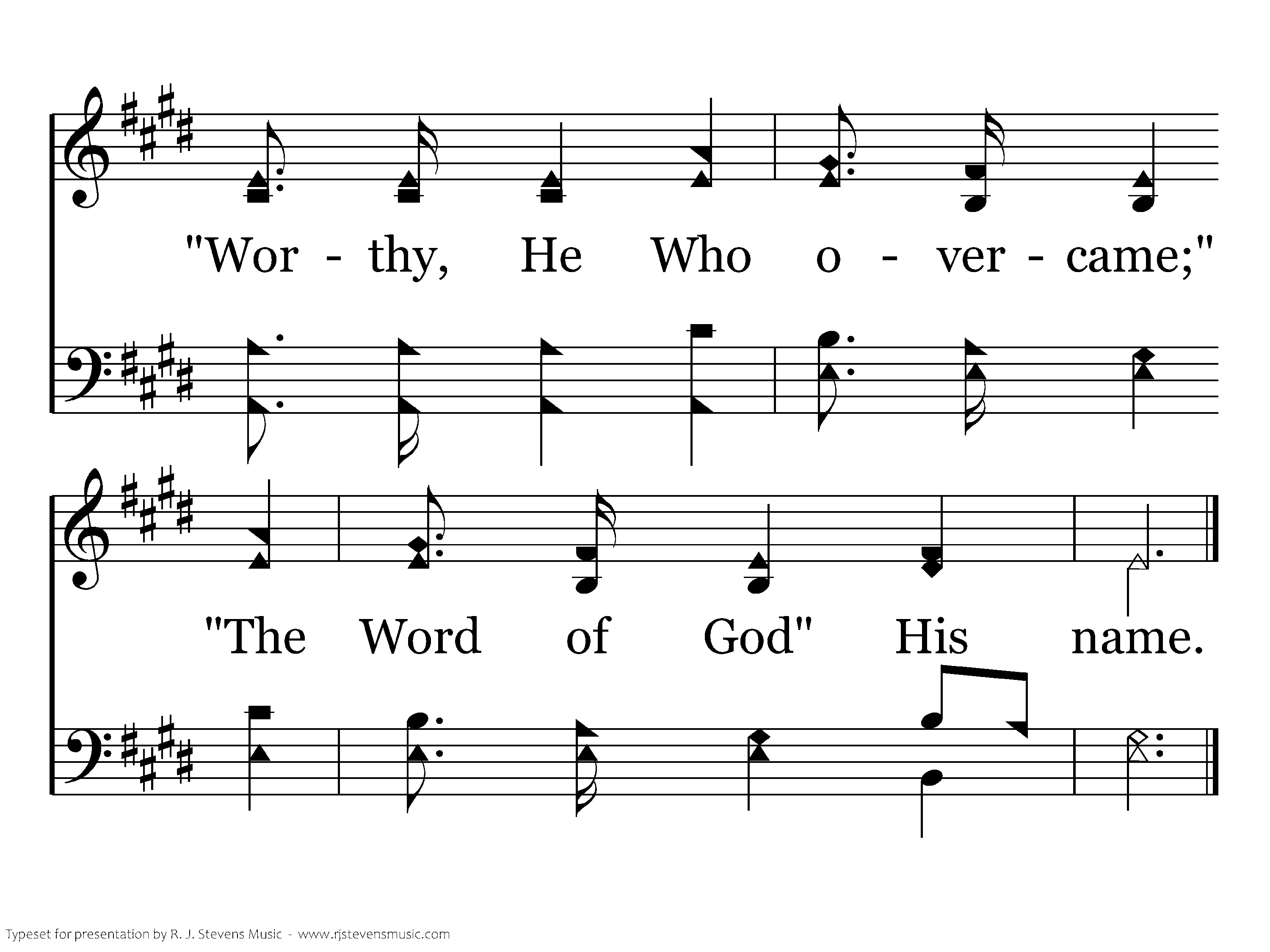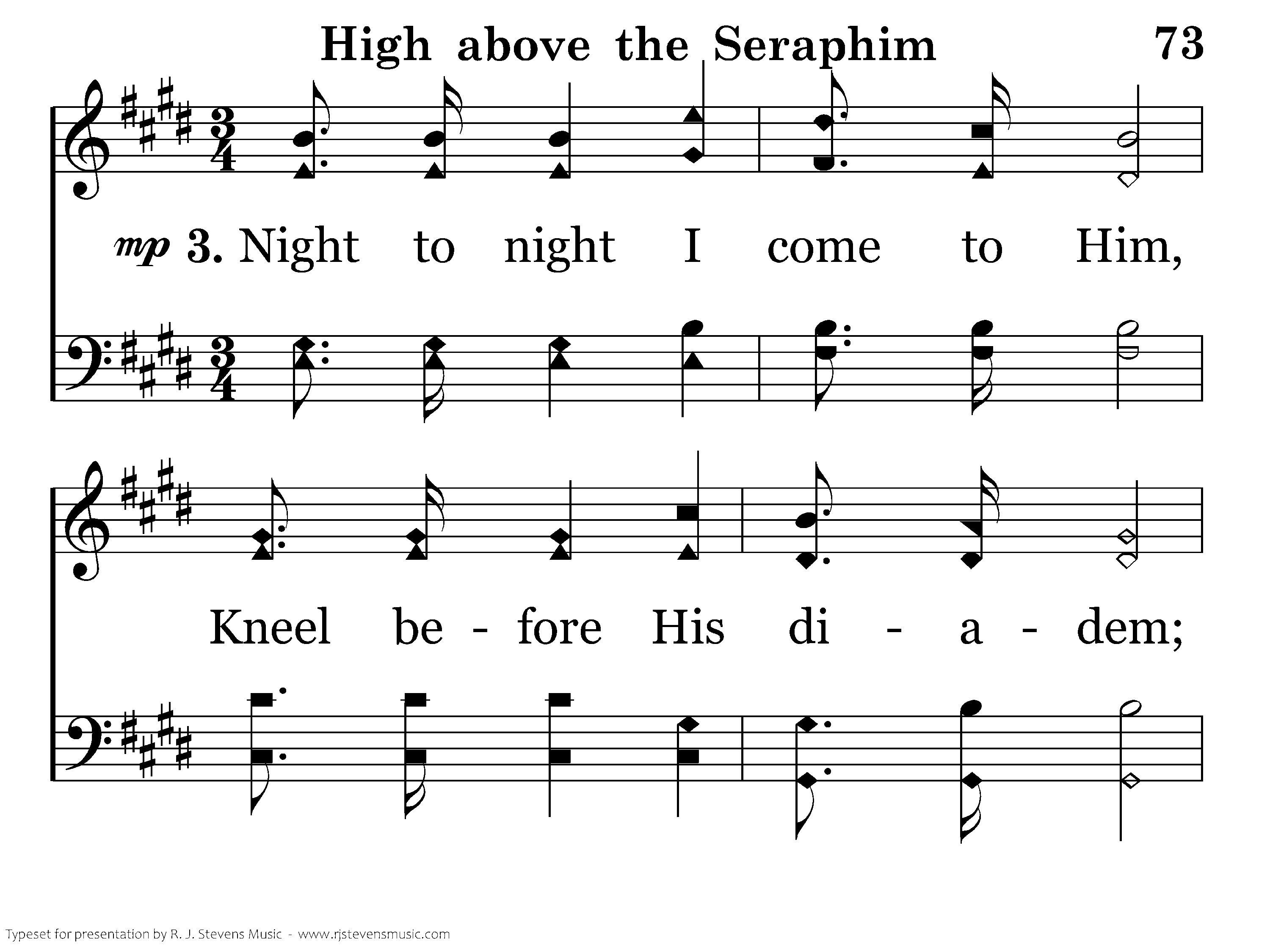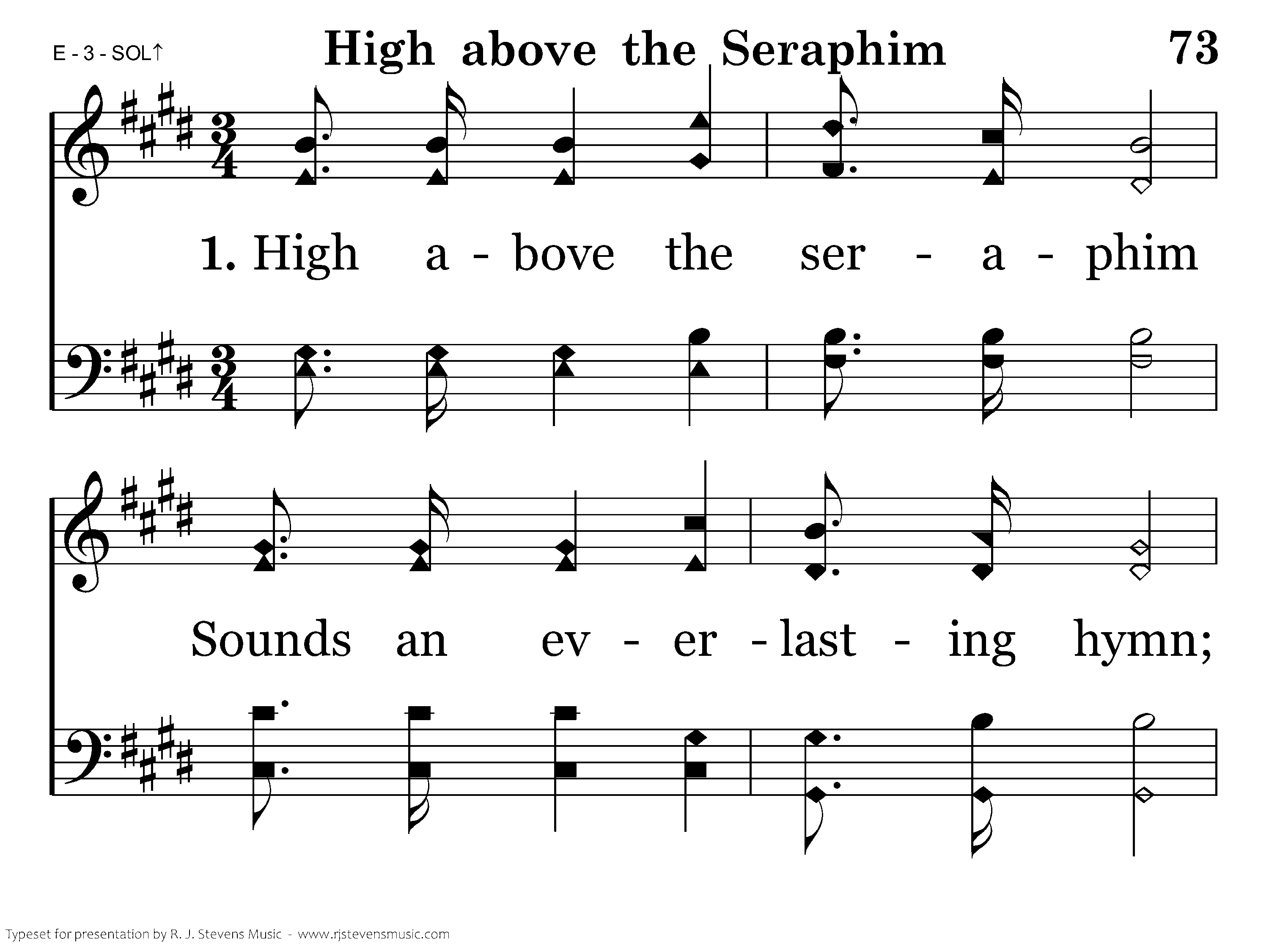 High above the seraphim Sounds an everlasting hymn; Voices echo thro' the hall And shake the temple wall. Living creatures bless the King, Four and twenty elders sing, "Worthy, He who overcame;" "The Word of God" His name.