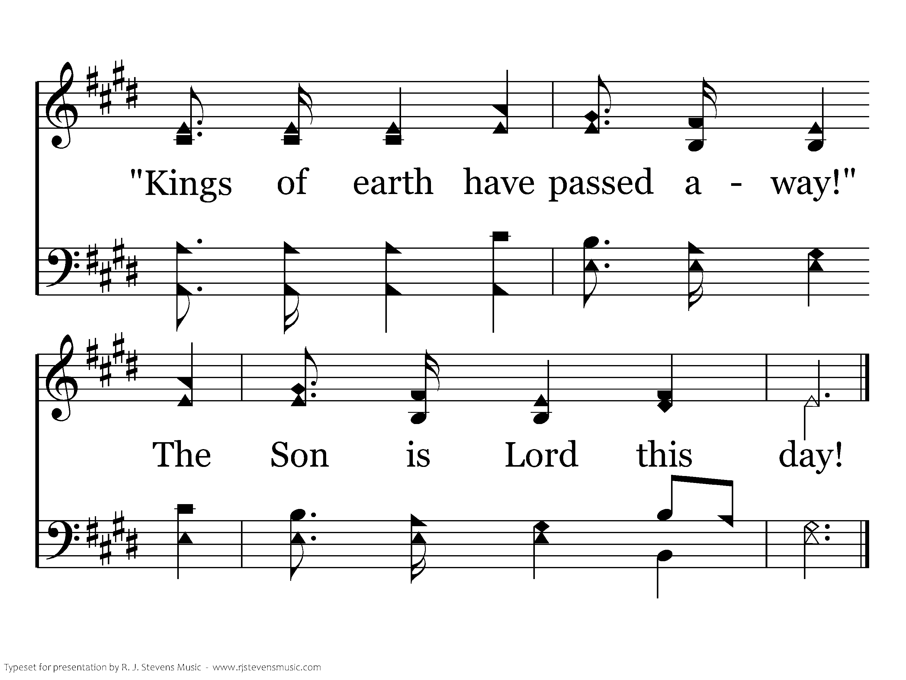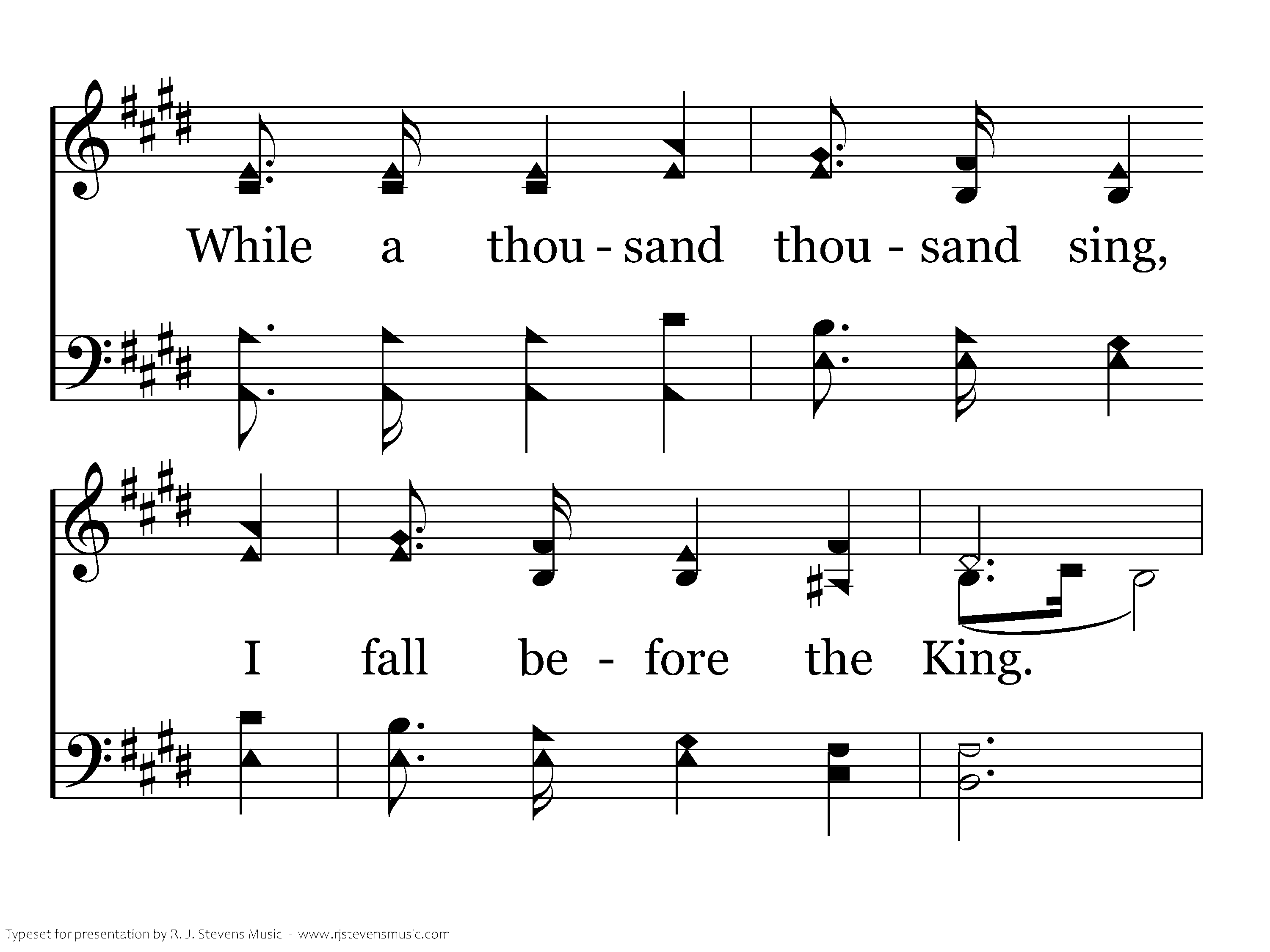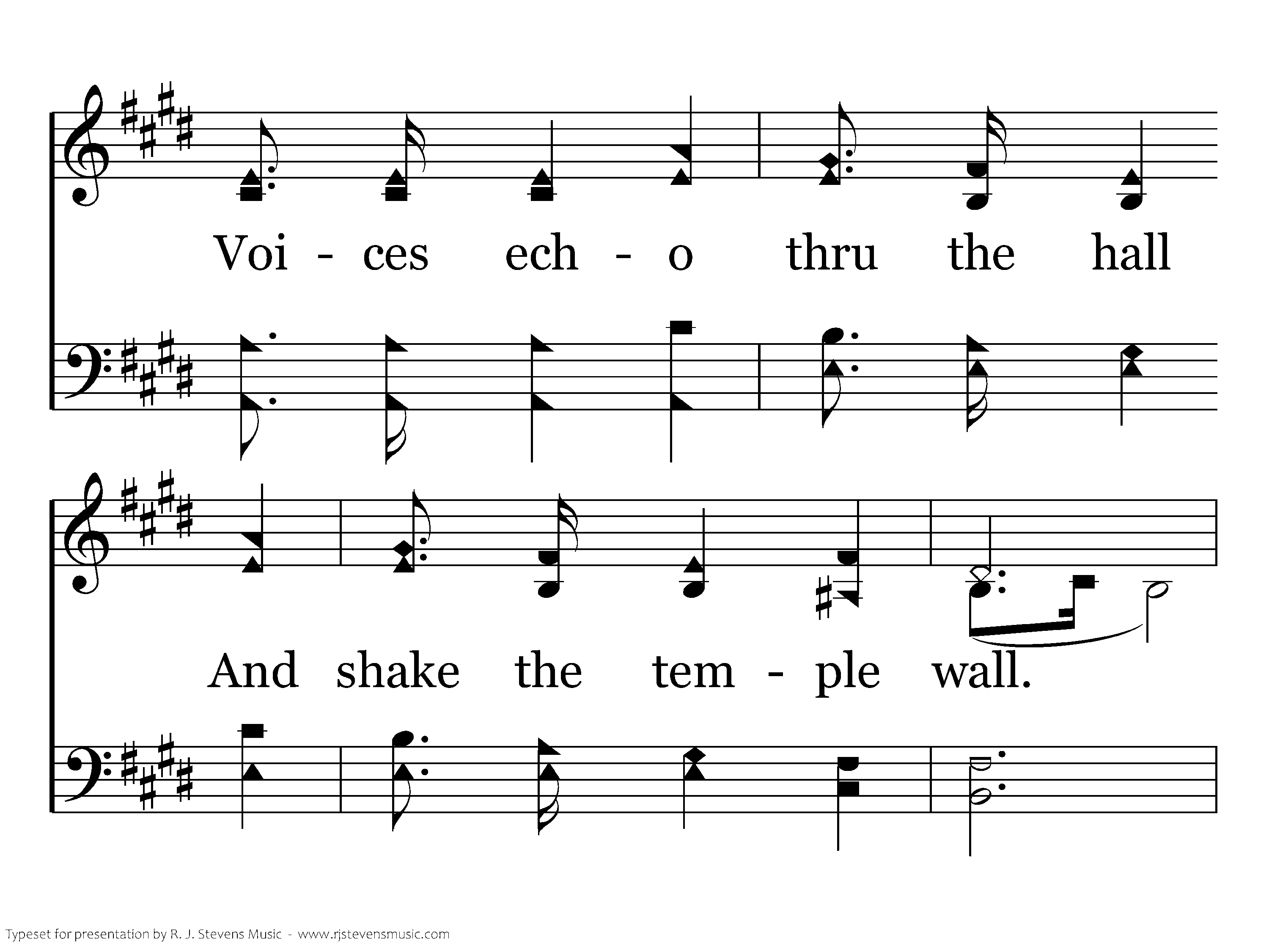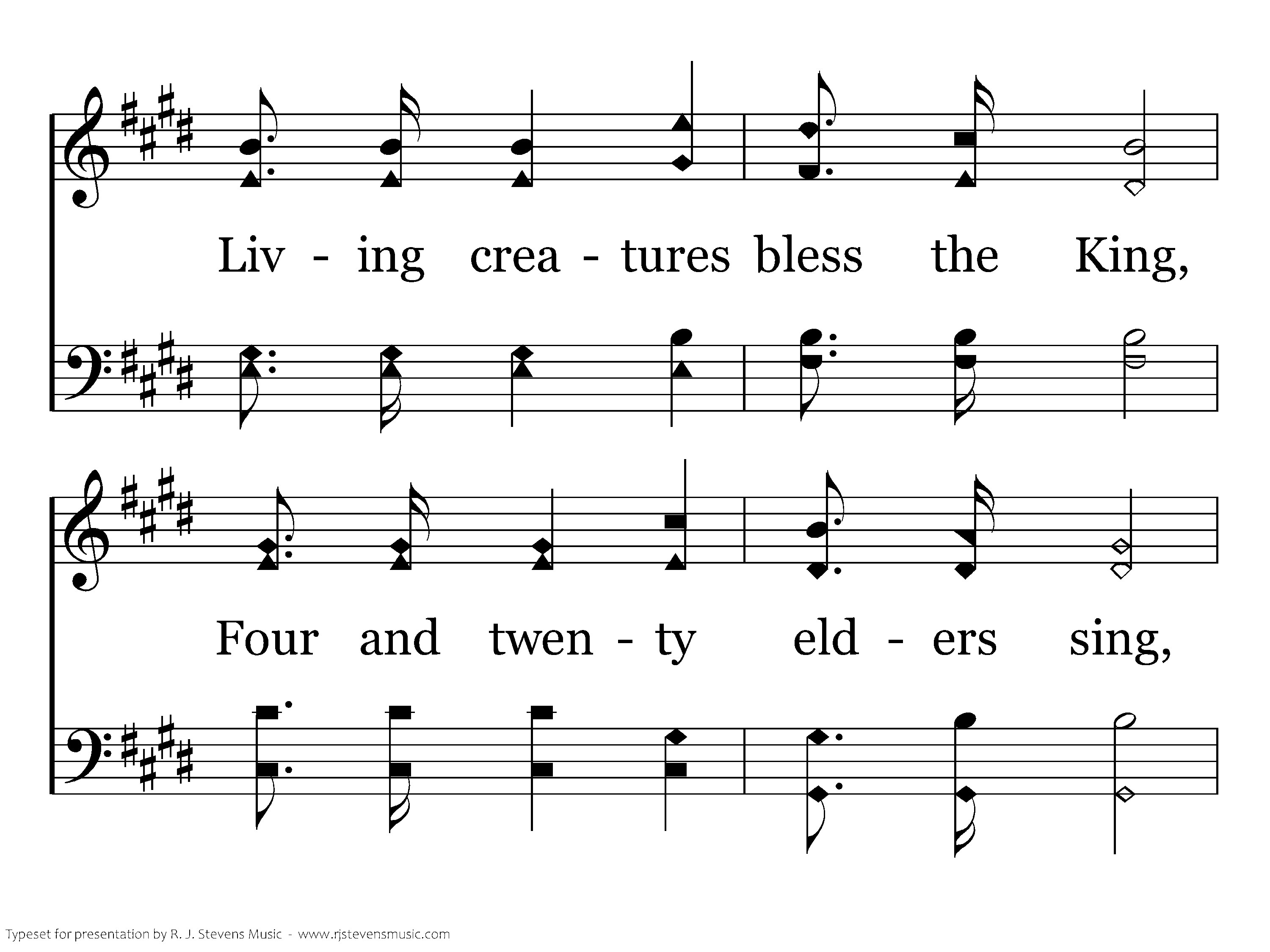 High above the seraphim Sounds an everlasting hymn; Voices echo thro' the hall And shake the temple wall. Living creatures bless the King, Four and twenty elders sing, "Worthy, He who overcame;" "The Word of God" His name.