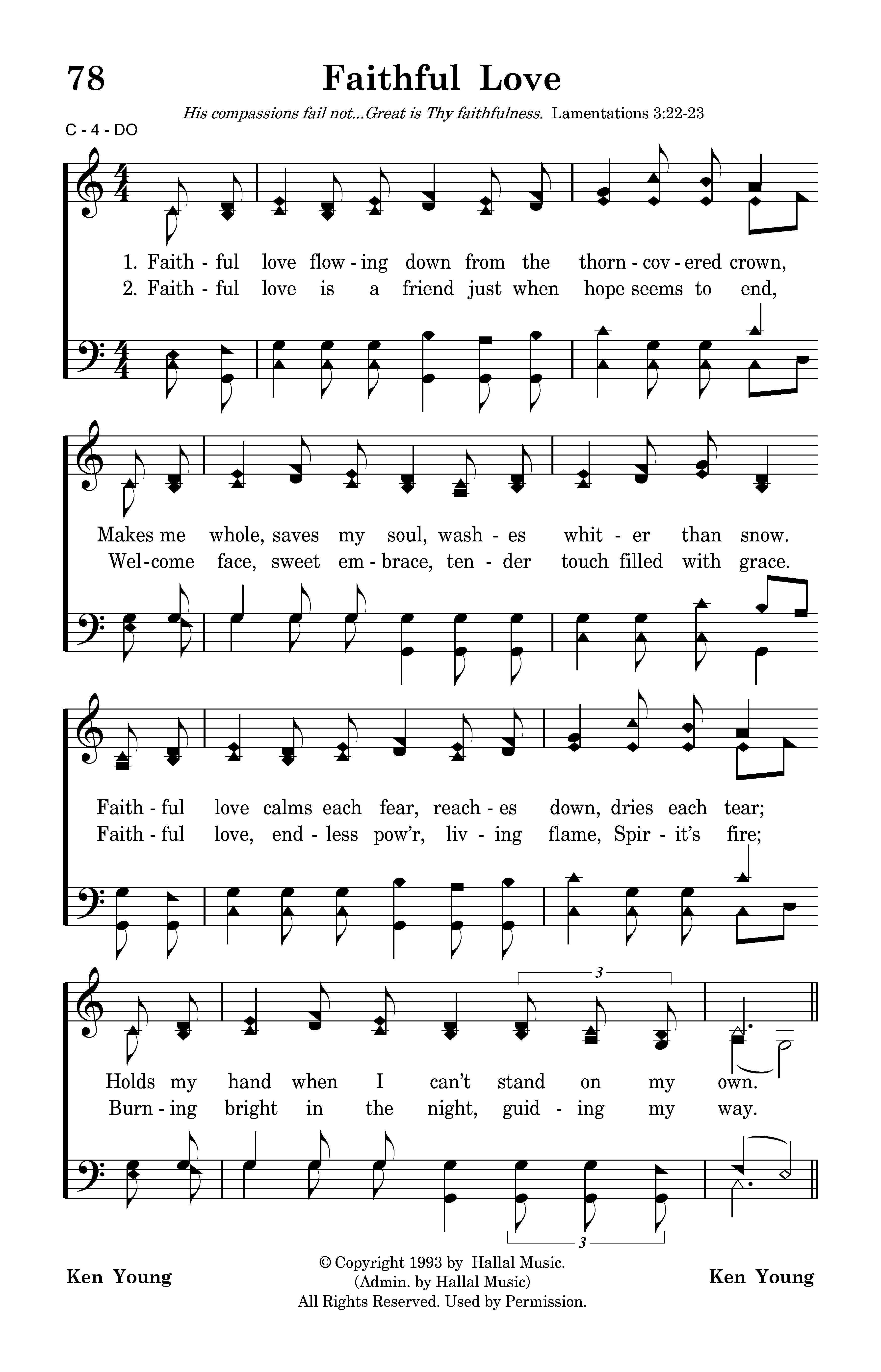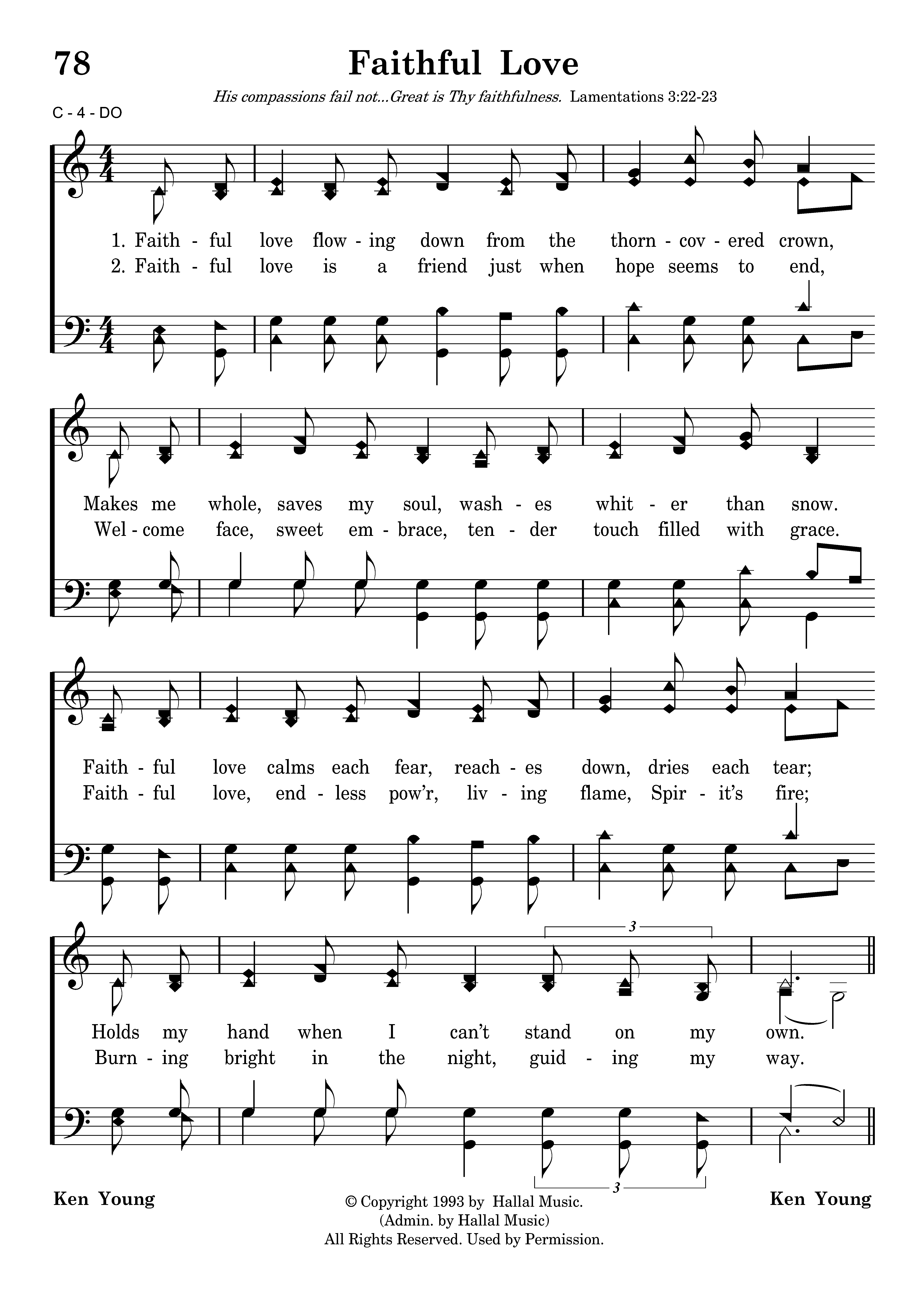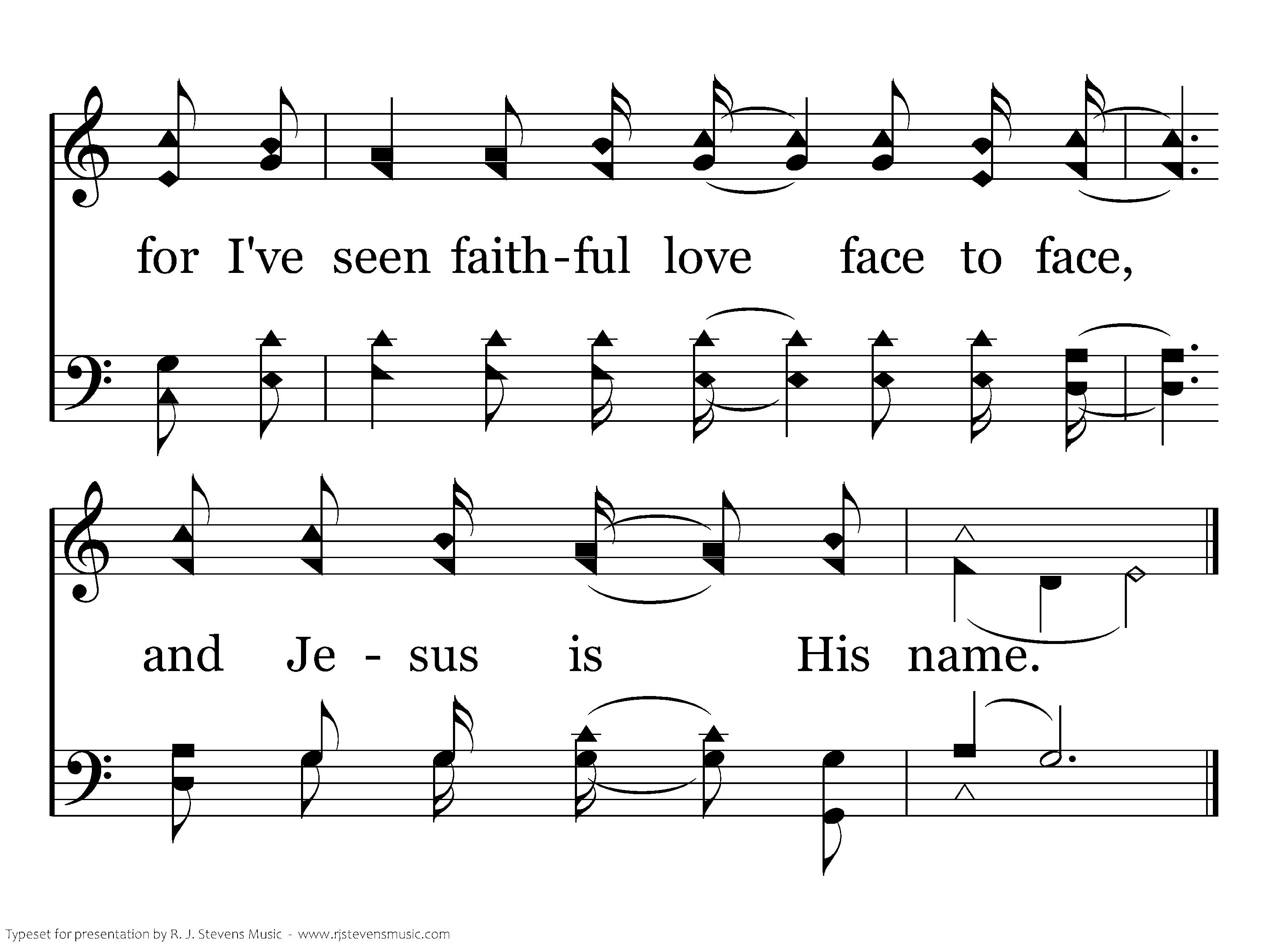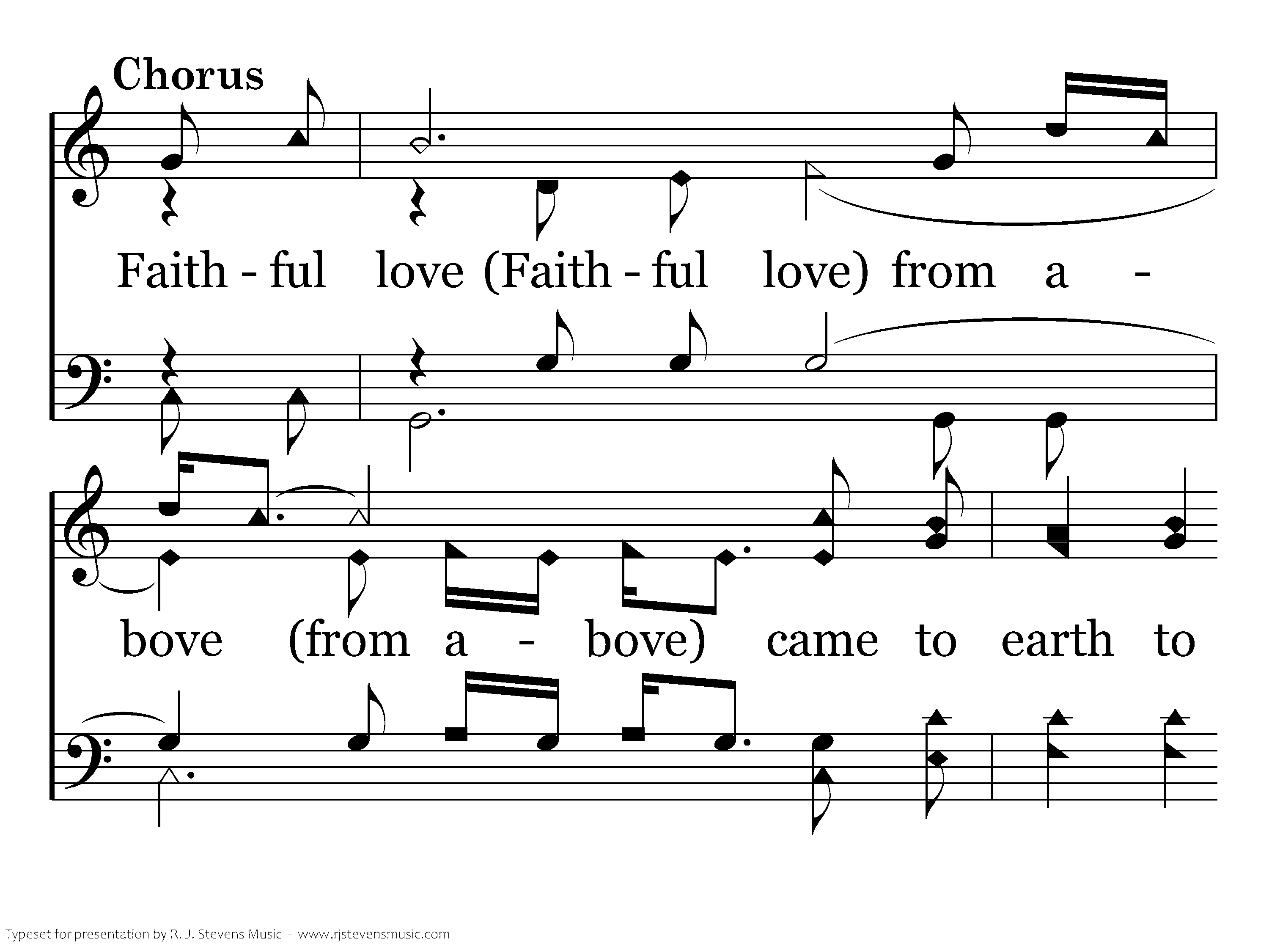 Faithful love flowing down from the thorn-covered crown, Makes me whole, saves my soul, washes whiter than snow; Faithful love calms each fear, reaches down, dries each tear, Holds my hand when I can't stand on my own. Faithful love from above came to earth to show the Father's love; And I'll never be the same, for I've seen faithful love face to face, and Jesus is His name.