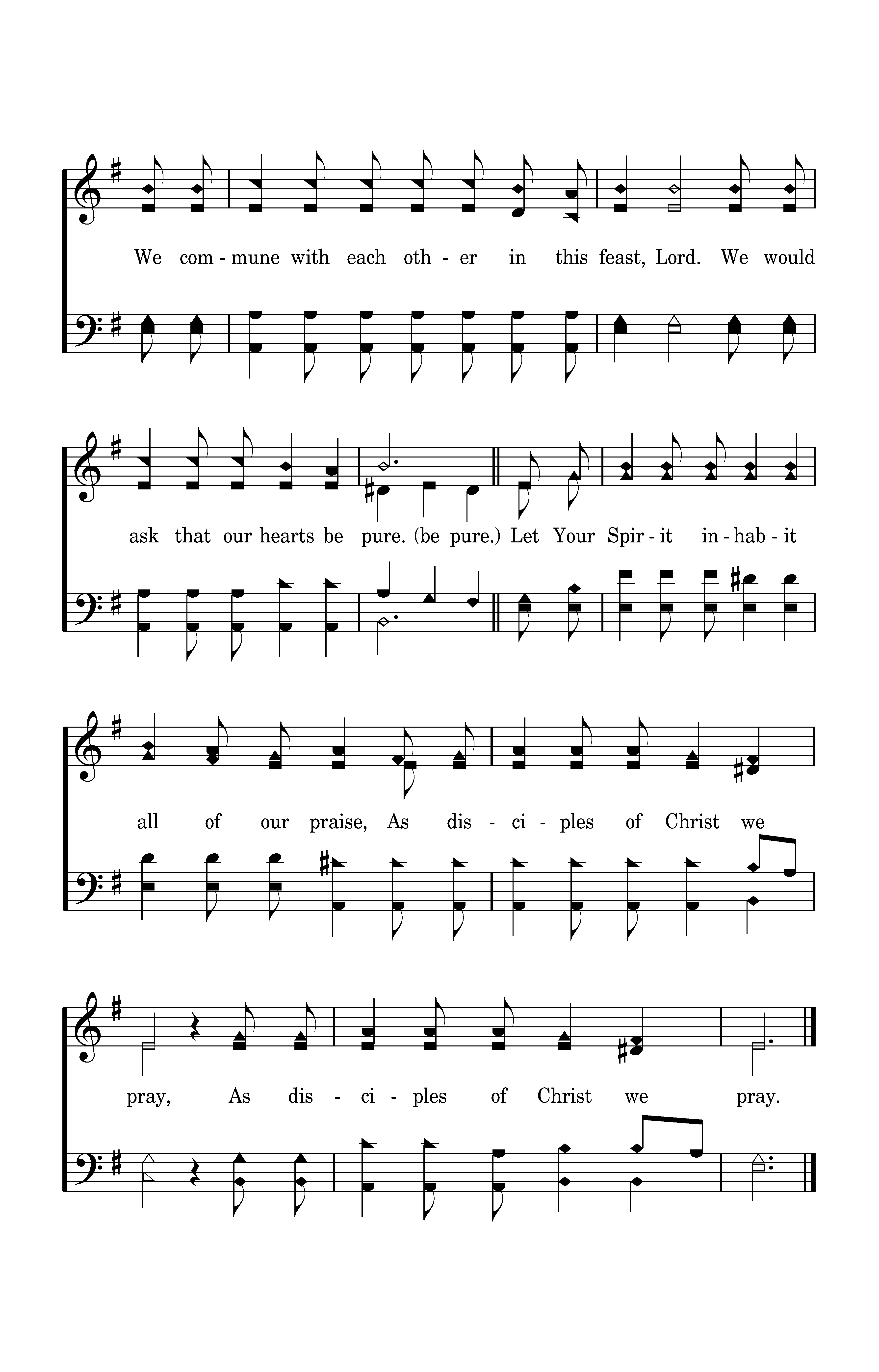 O Lord our God, we come to You now as our minds are turned to Christ our King. May the words that he spoke stay close to our hearts, and His body be a source of strength. May the bread and the wine receive Your blessing, and our heart feel the pain He bore. Let Your Spirit indwell us now as we take, As disciples of Christ we pray. Hallelujah! Hallelujah! Hallelujah! Hallelujah! Hallelujah! Hallelujah! Hallelujah! Hallelujah! We commune with each other in this feast, Lord. We would ask that our hearts be pure. Let Your Spirit inhabit all of our praise, As disciples of Christ we pray, As disciples of Christ we pray.