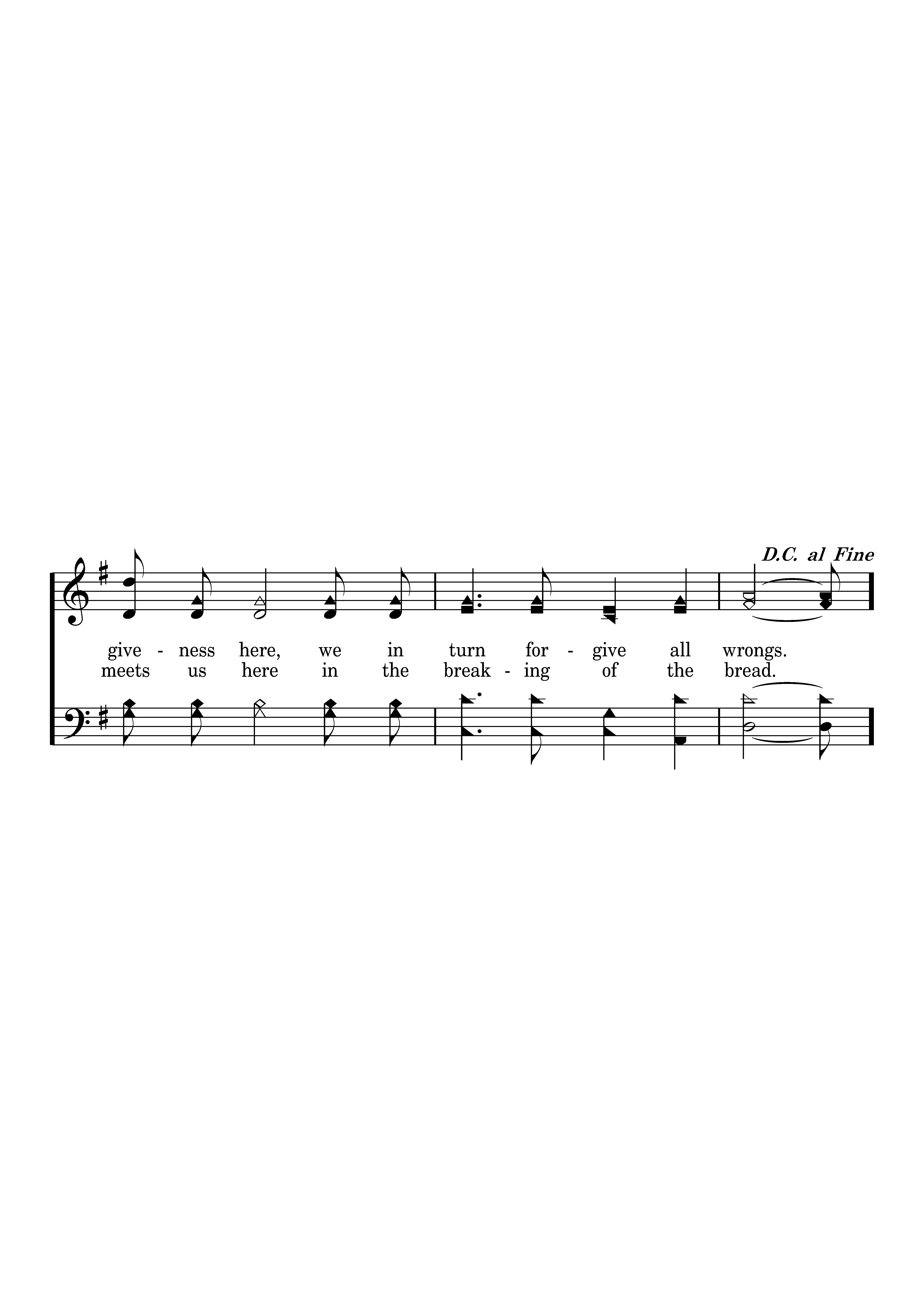 We gather here in Jesus name, His love is burning in our hearts like living flame. For thru the loving Son the Father makes us one. Come take the bread, come drink the cup, come share the Lord. No one is a stranger here, for everyone belongs. Finding our forgiveness here, we in turn forgive all wrongs.