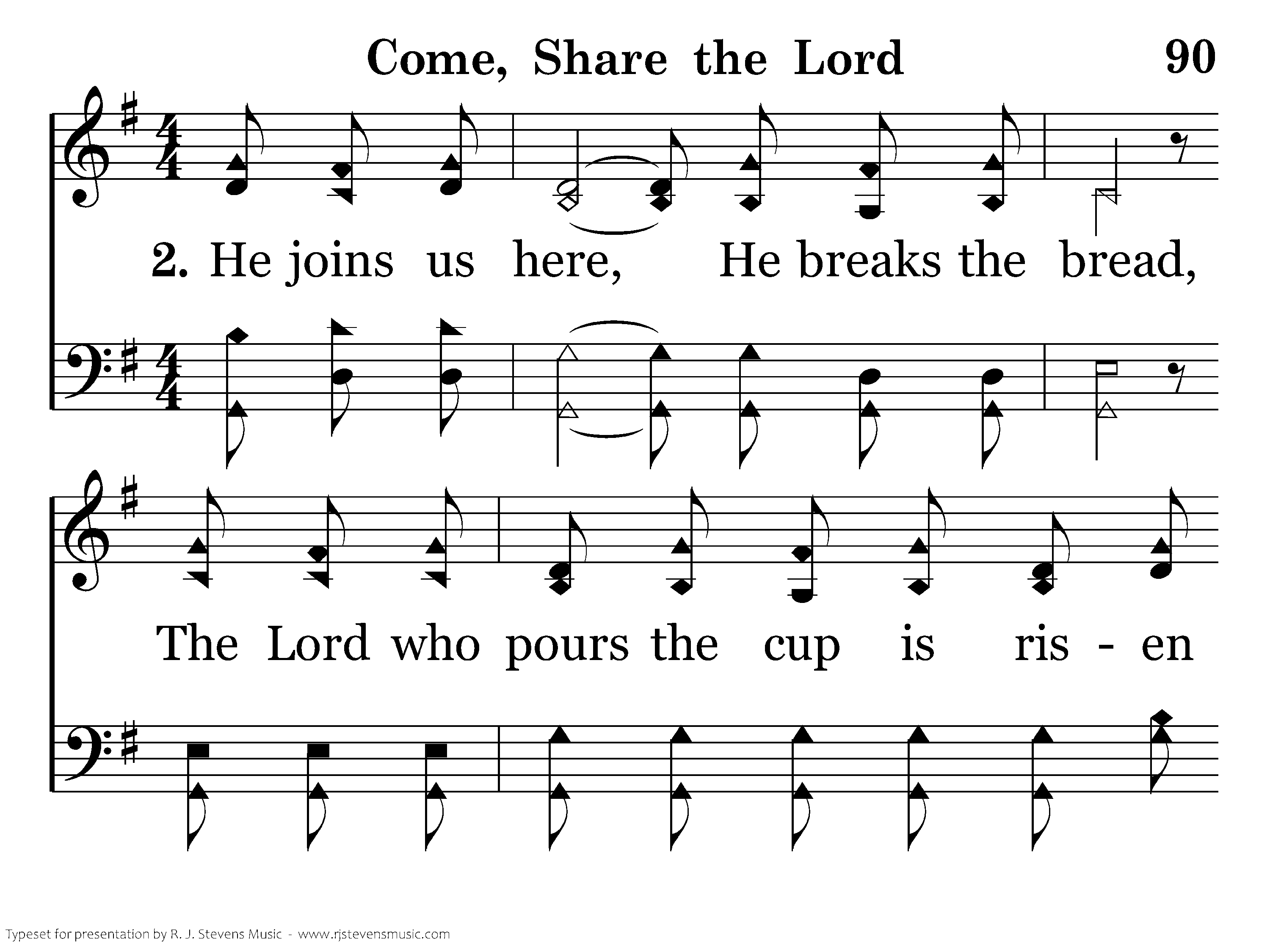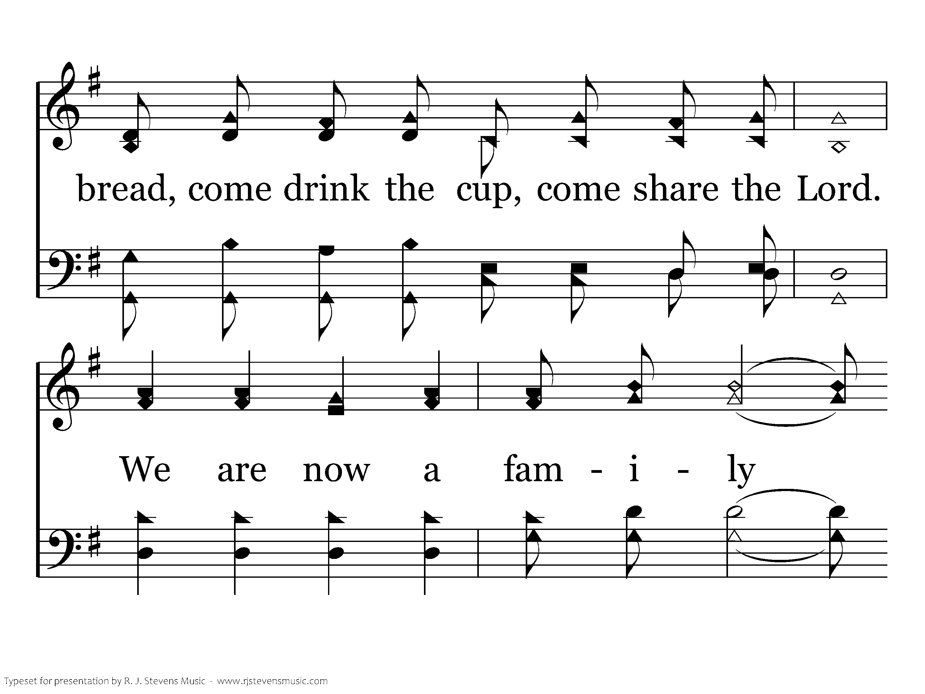 He joins us here, He breaks the bread, The Lord who pours the cup is risen from the dead. The One we love the most is now our gracious host. Come take the bread, come drink the cup, come share the Lord. We are now a family of which the Lord is head. Tho' unseen He meets us here in the breaking of the bread.