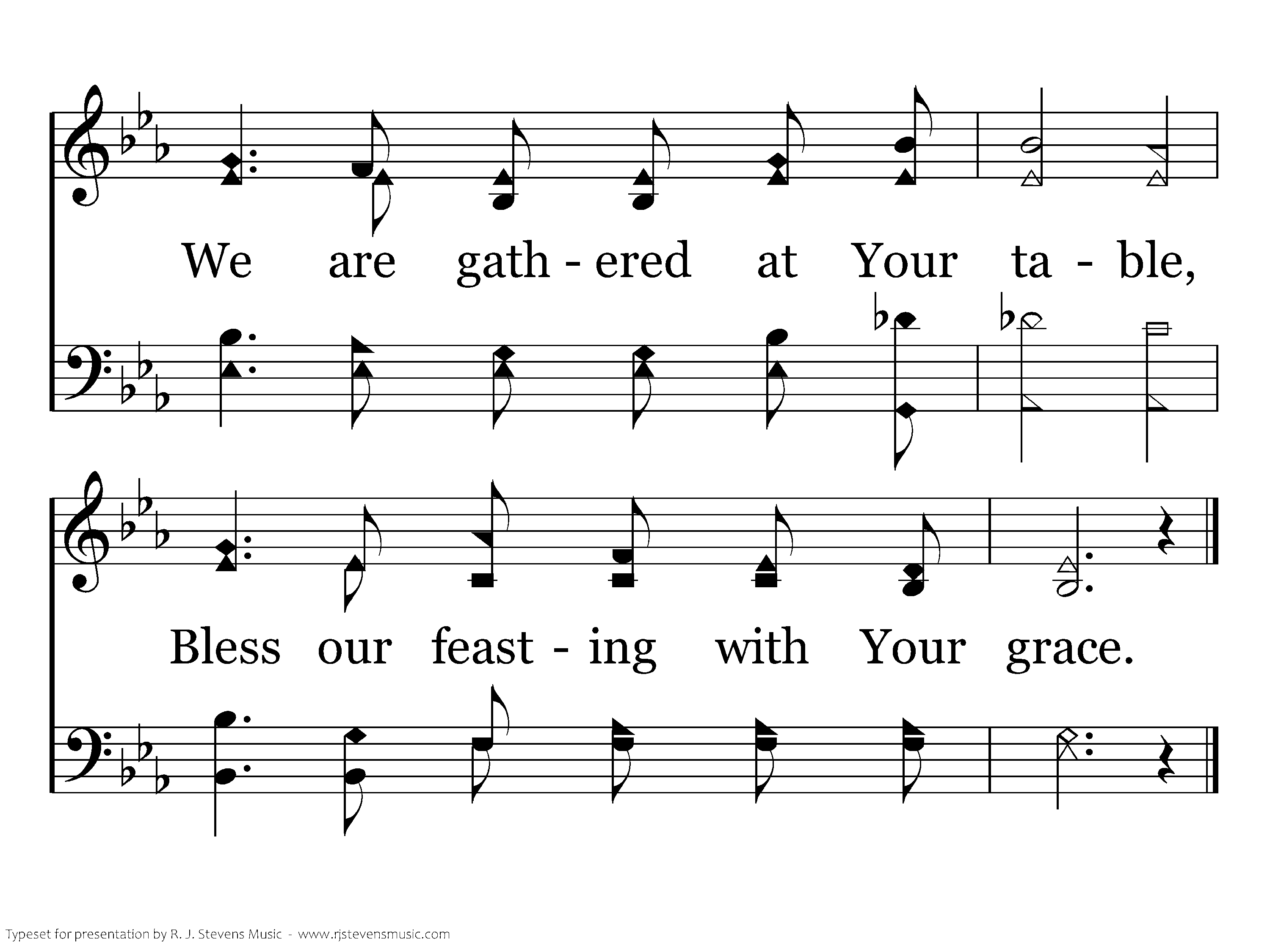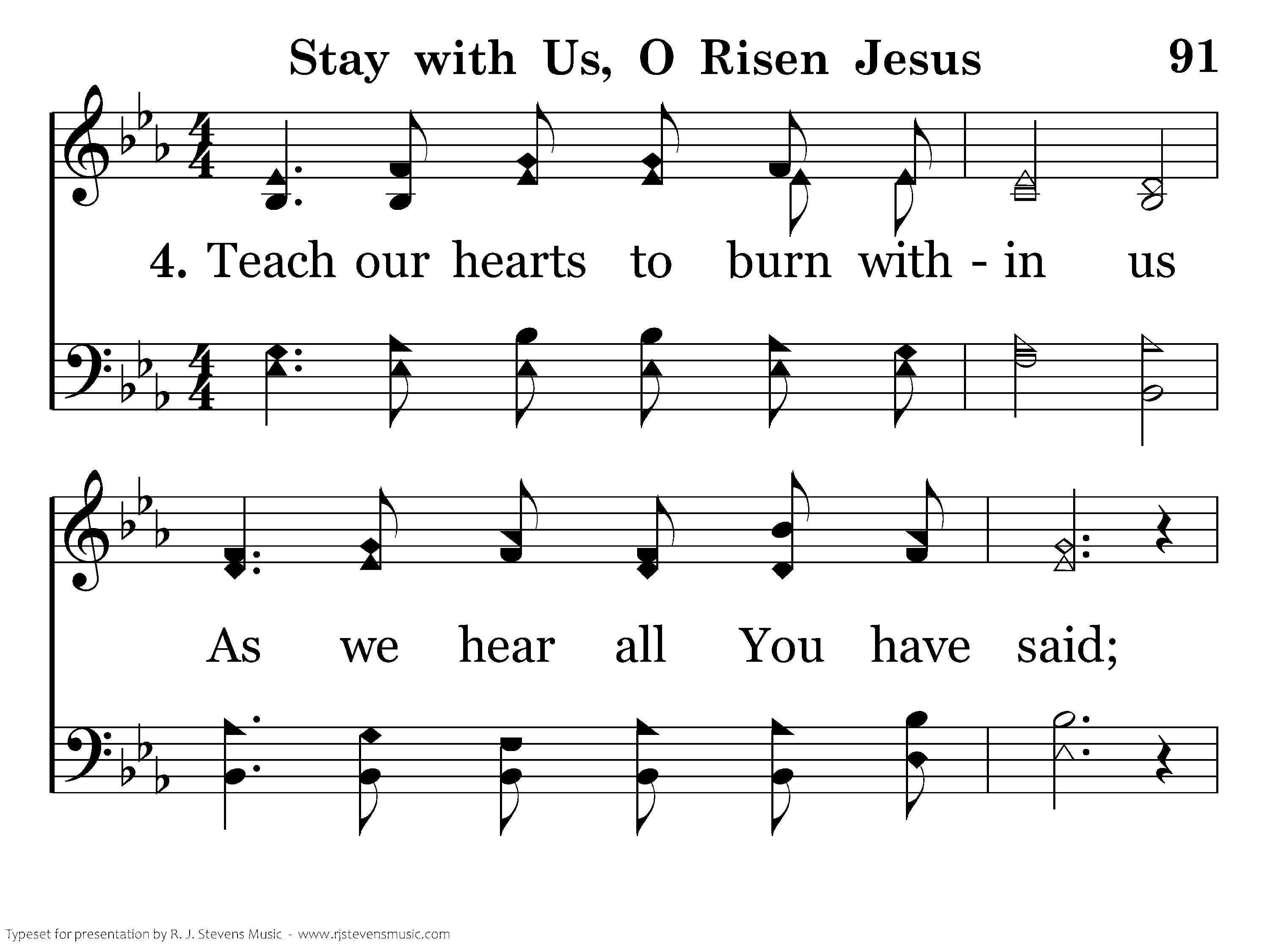 Stay with us, O risen Jesus; Go no farther than this place; We are gathered at Your table, bless our feasting with Your grace.