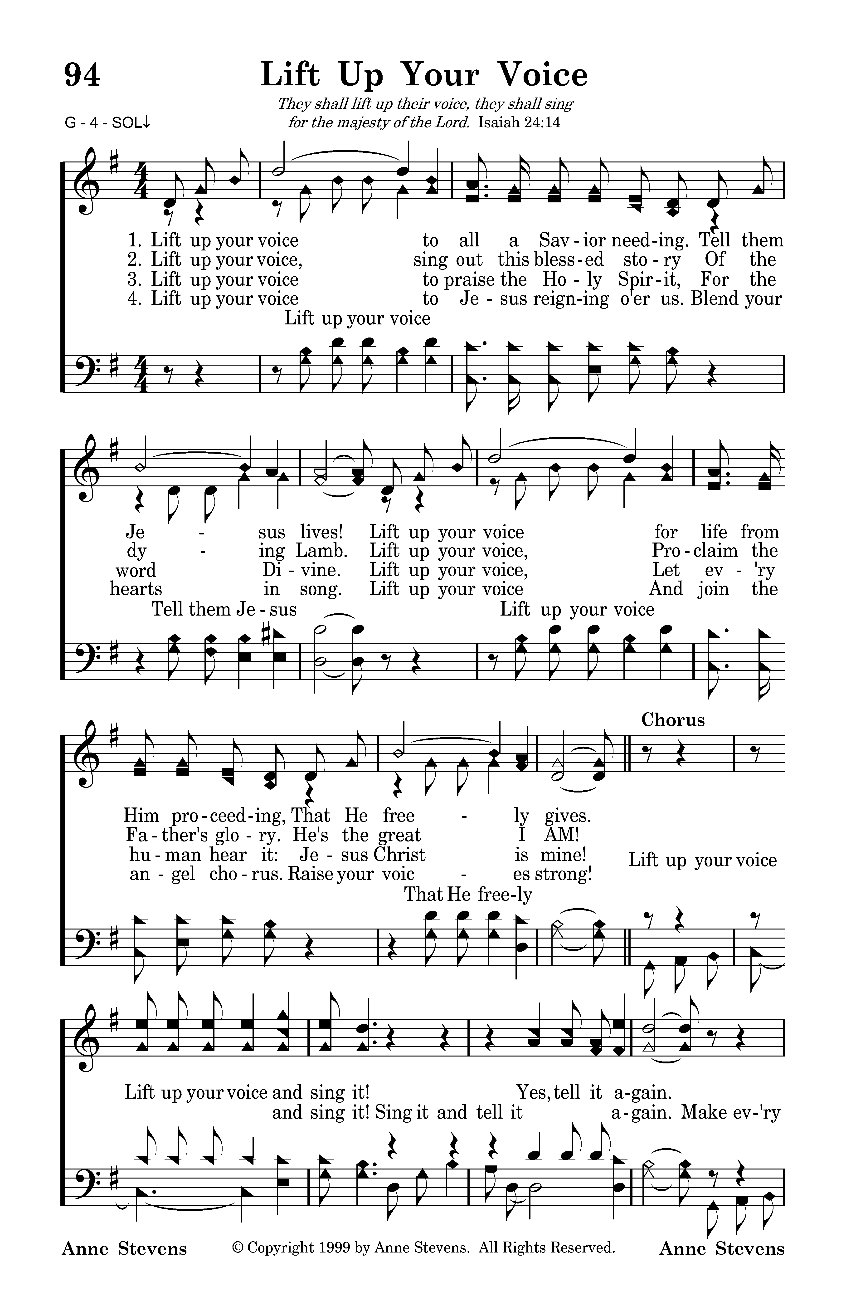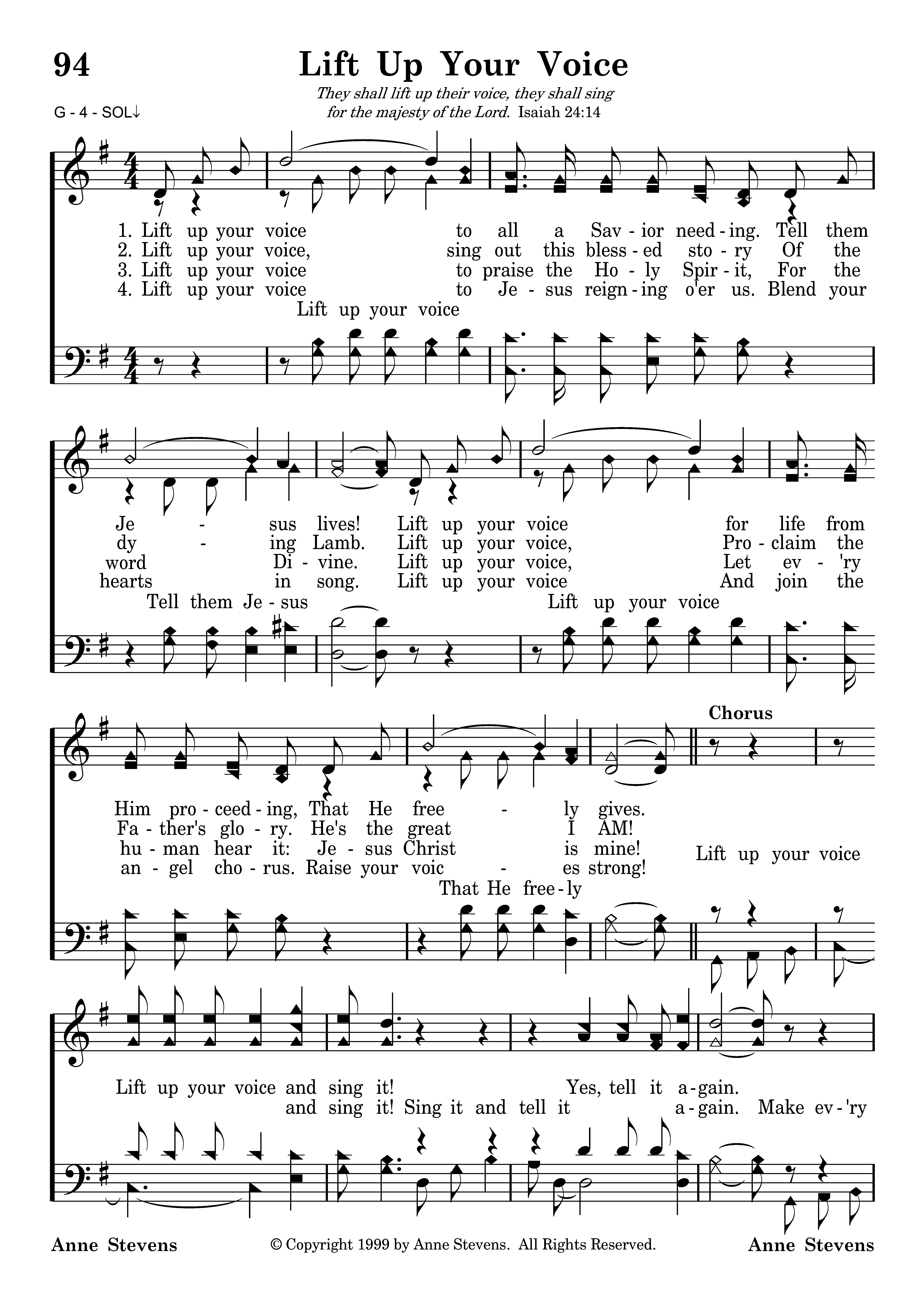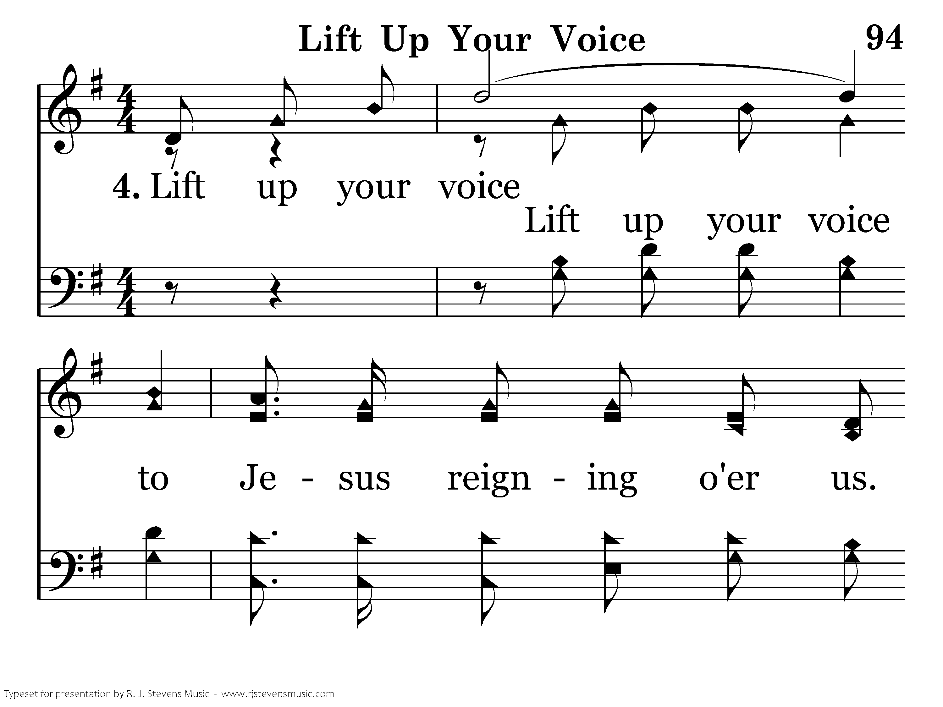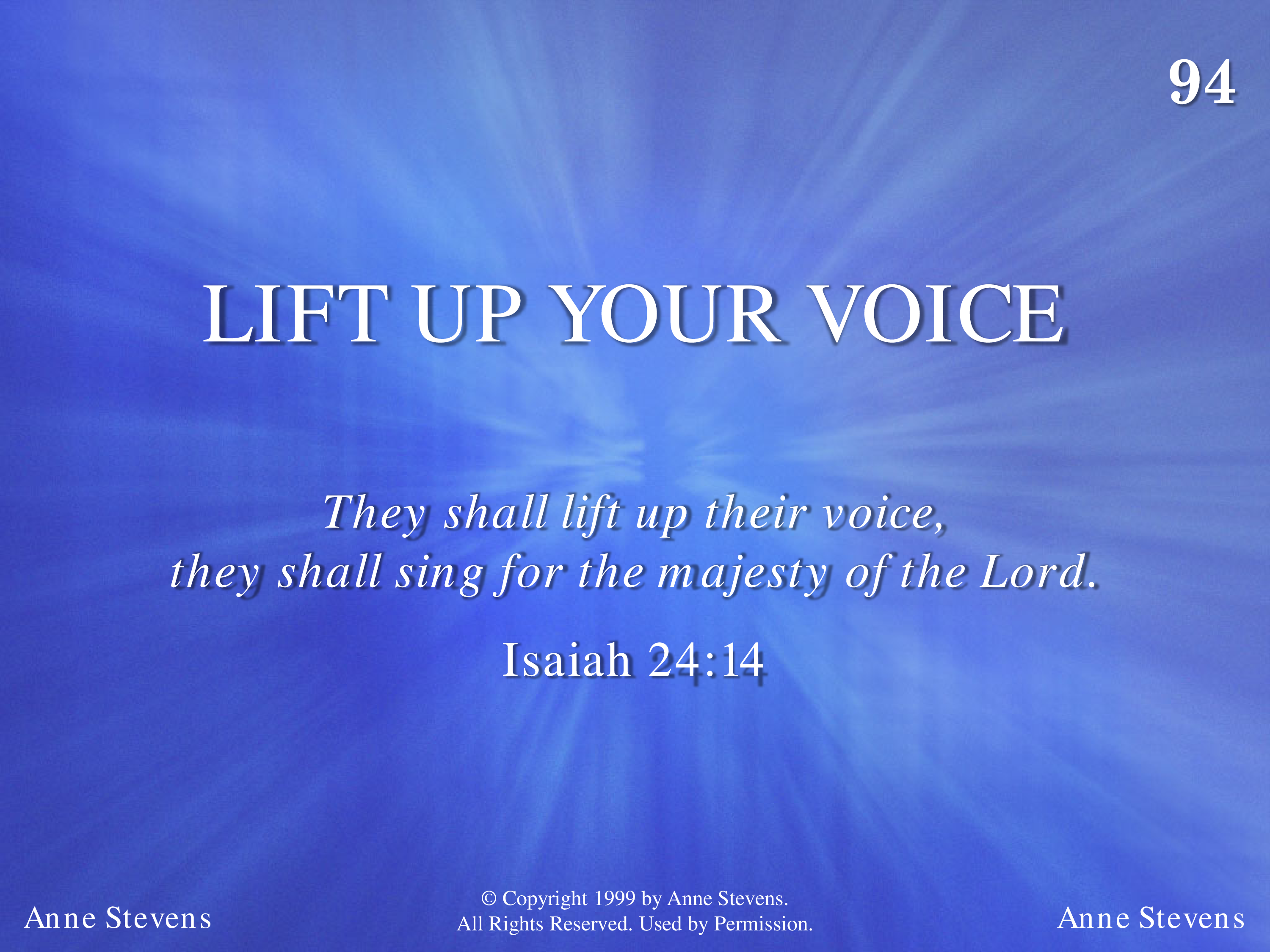 Lift up your voice to Jesus reigning o'er us. Blend your hearts in song. Lift up your voice And join the angel chorus. Raise your voices strong!