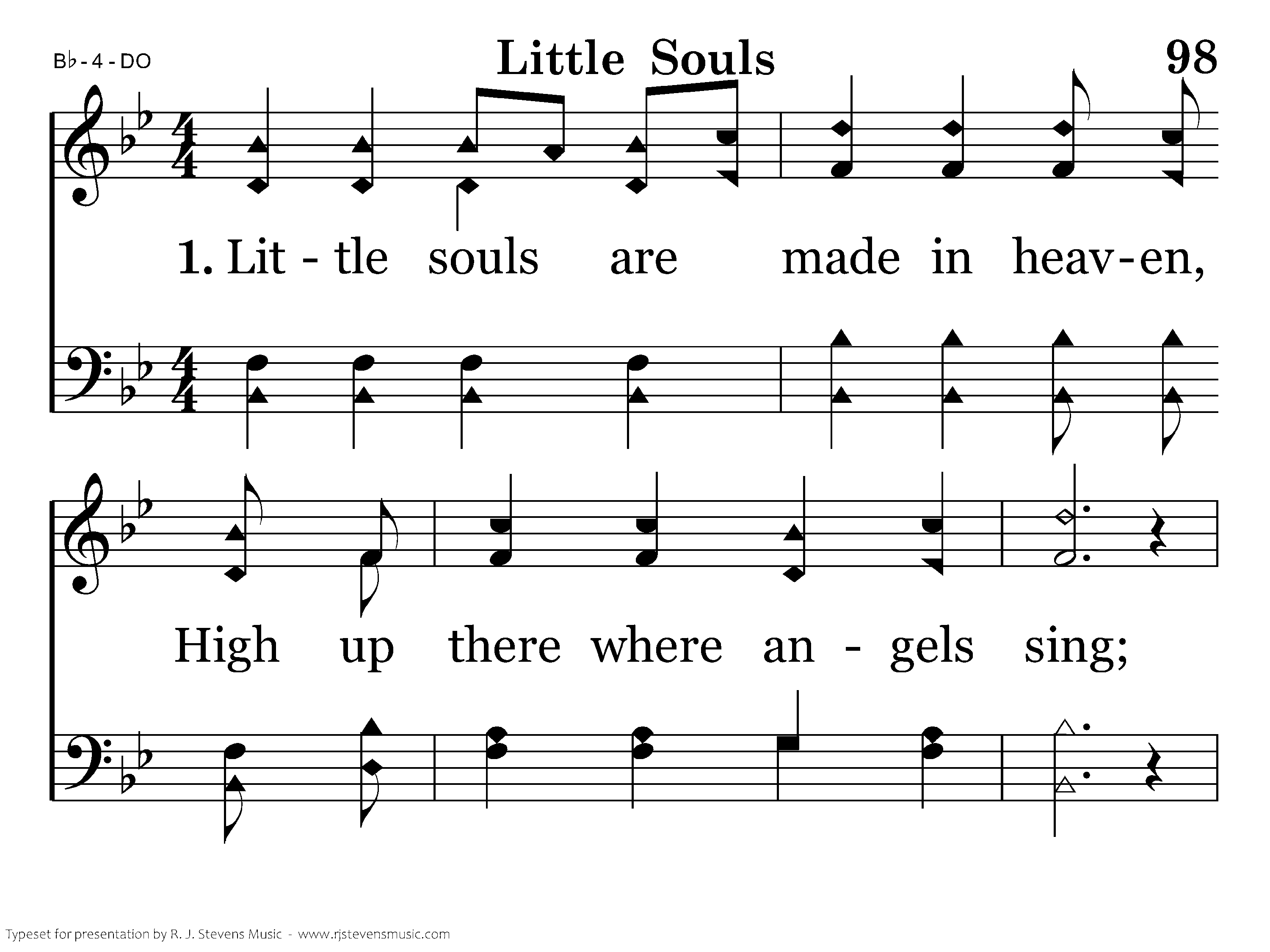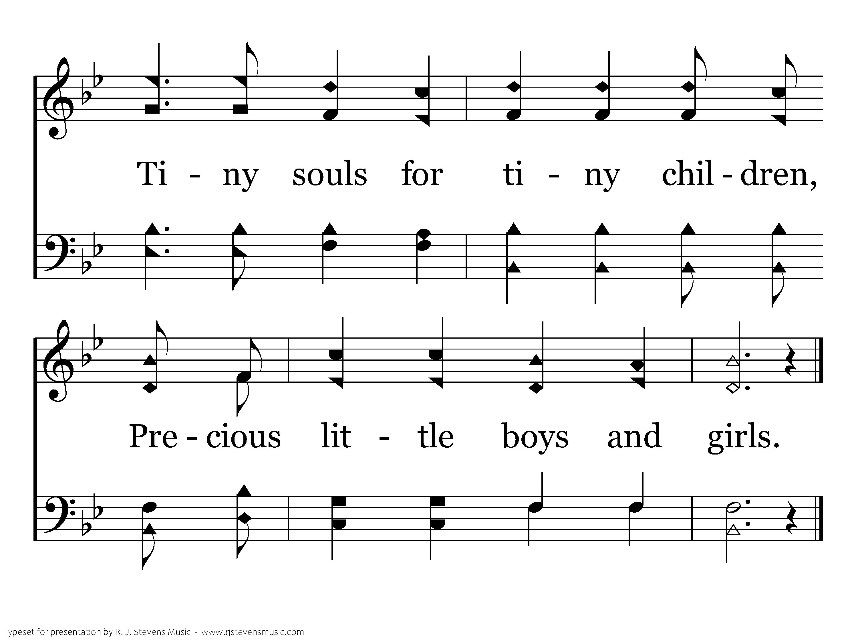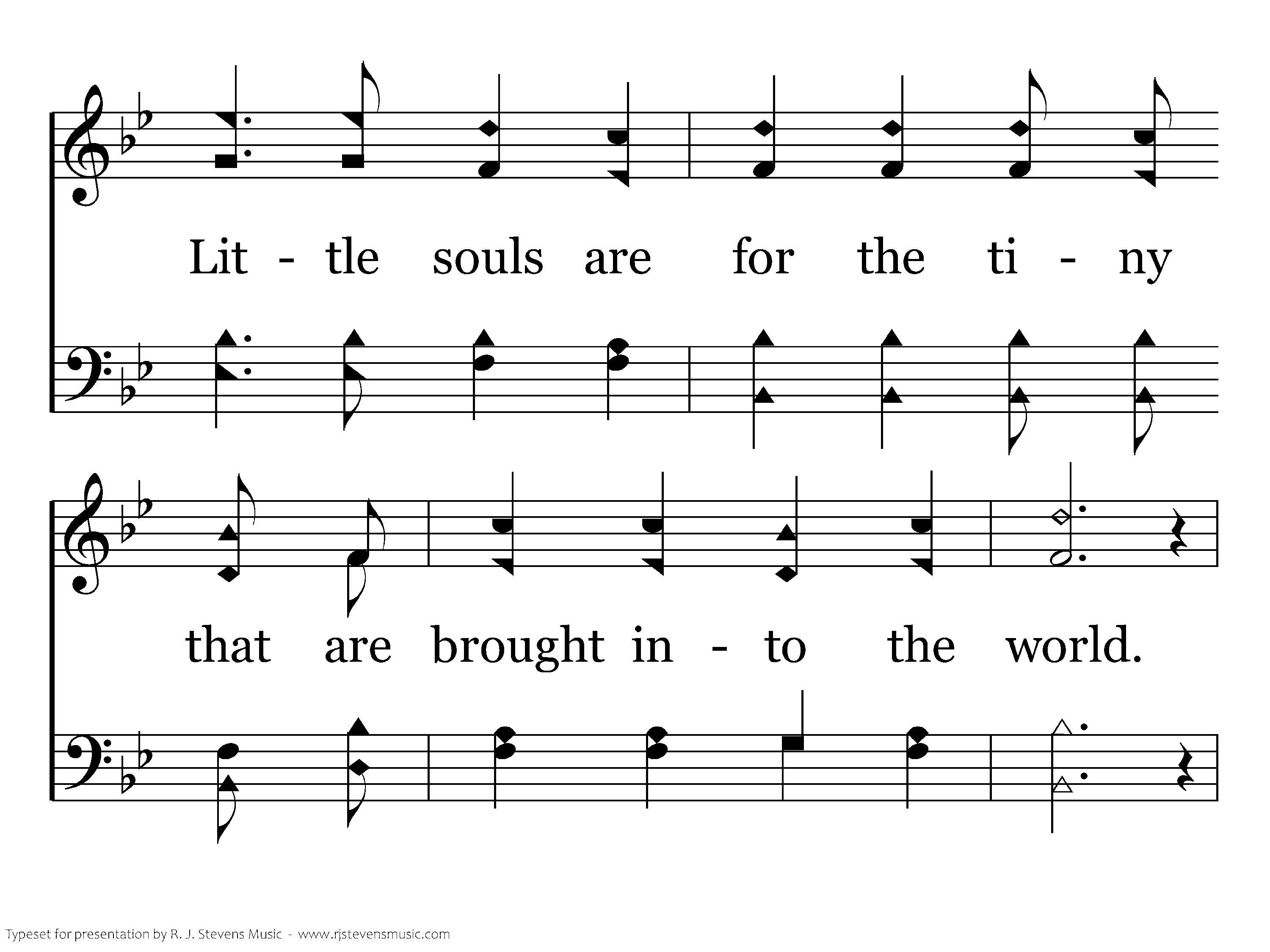Little souls are made in heaven, High up there where angels sing; Where the angels gather 'round to praise and glorify their King. Little souls are for the tiny that are brought into the world. Tiny souls for tiny children, Precious little boys and girls.