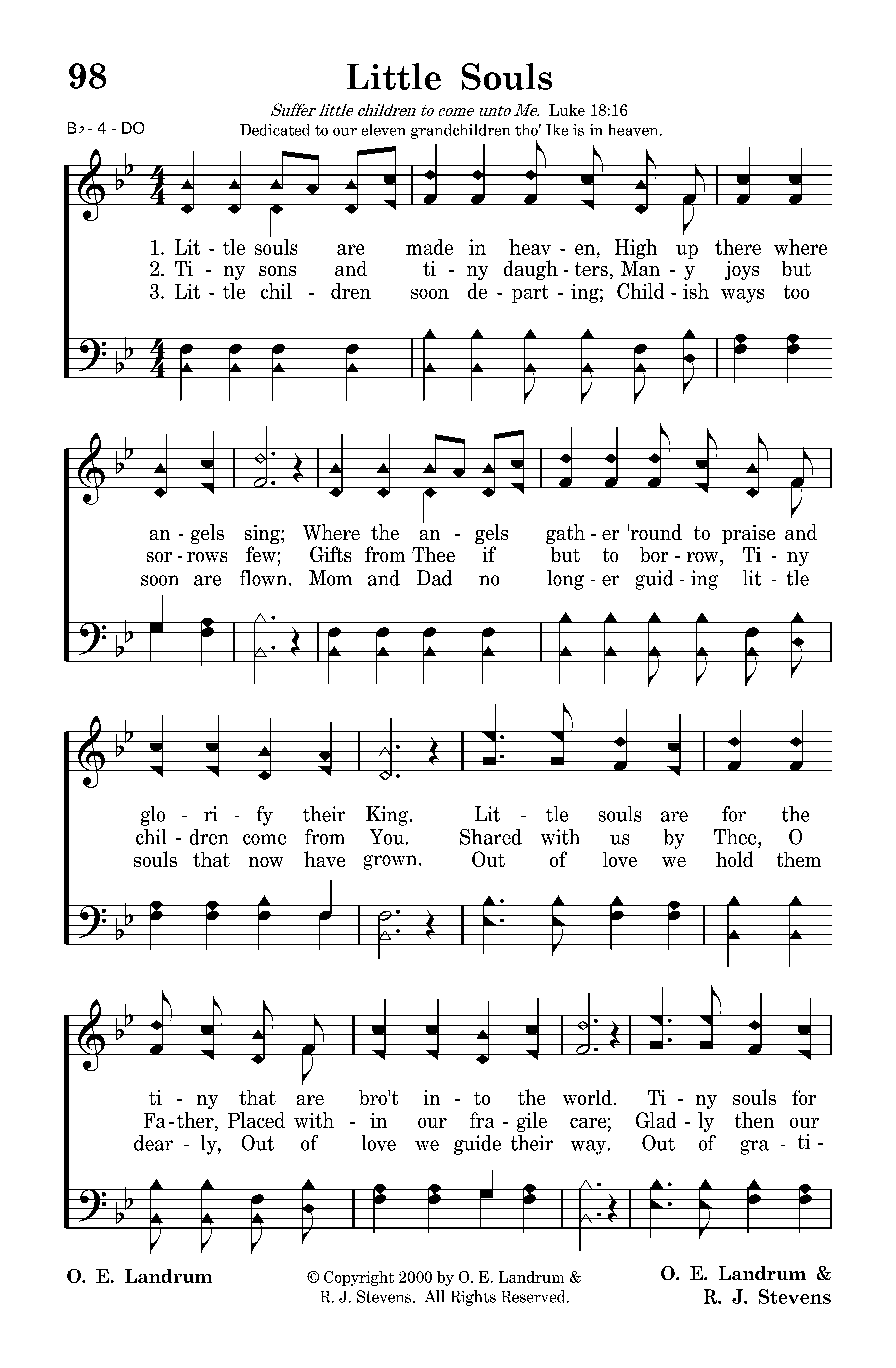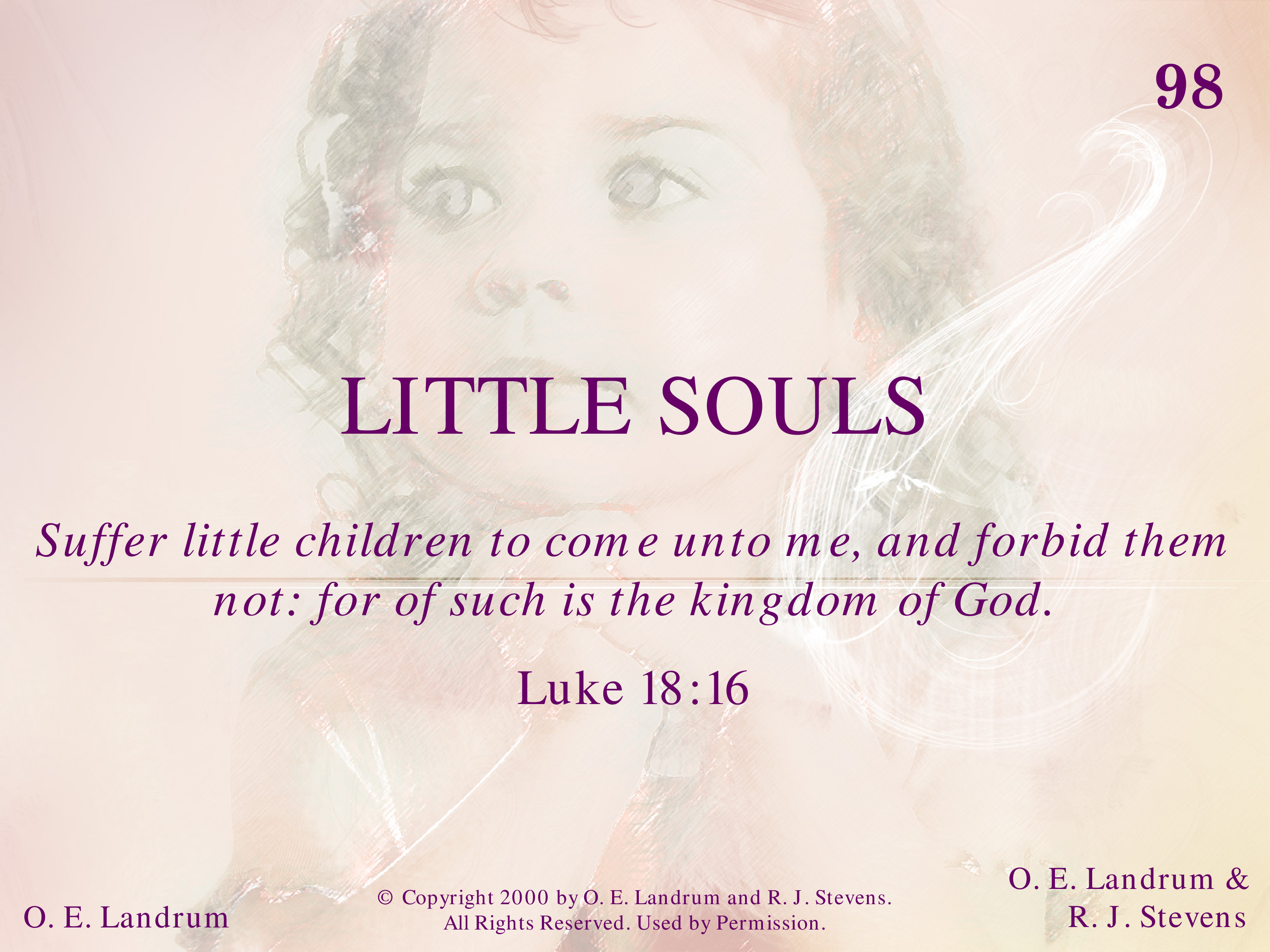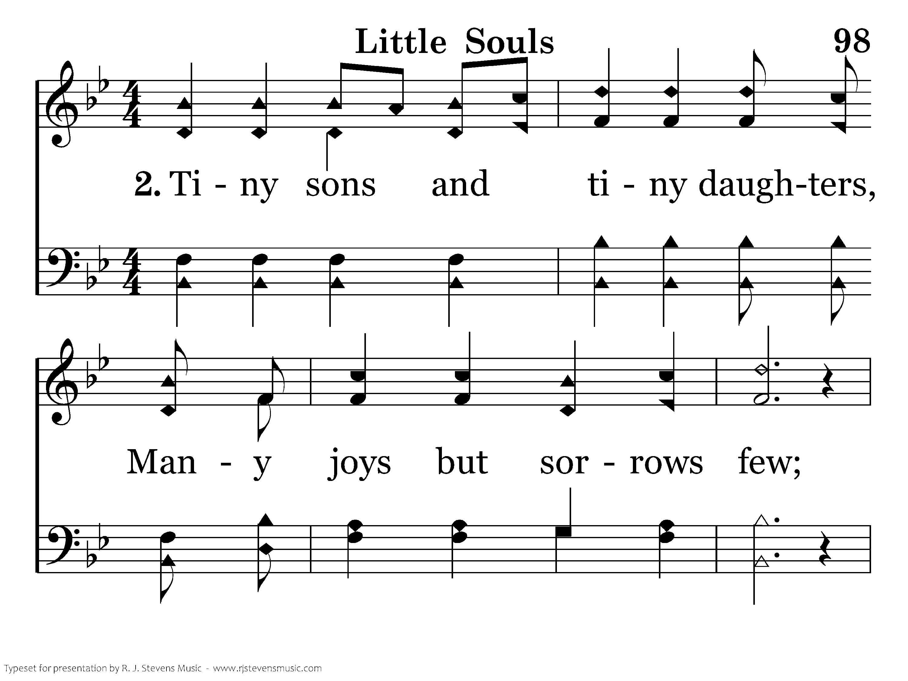 Little souls are made in heaven, High up there where angels sing; Where the angels gather 'round to praise and glorify their King. Little souls are for the tiny that are brought into the world. Tiny souls for tiny children, Precious little boys and girls.