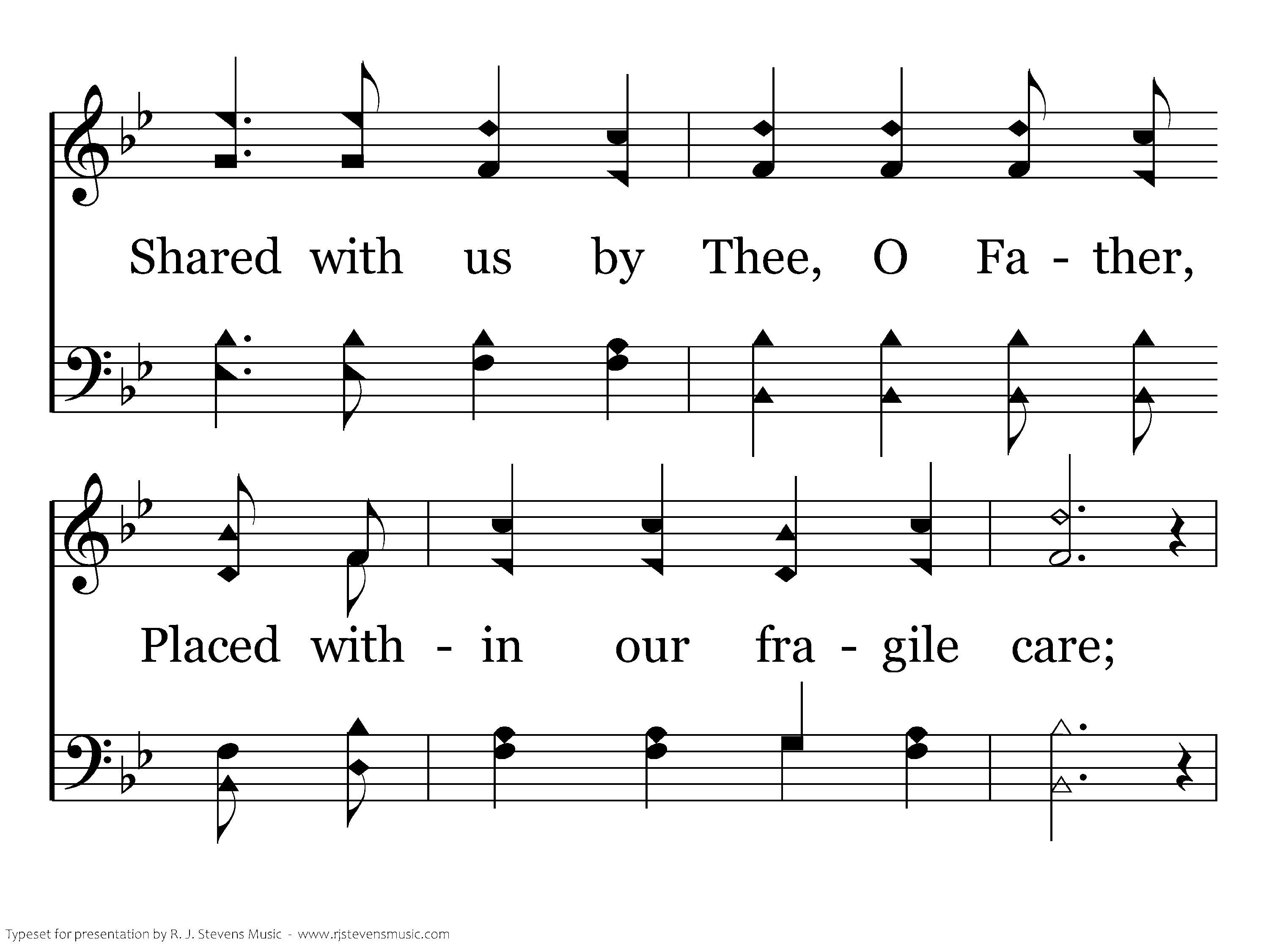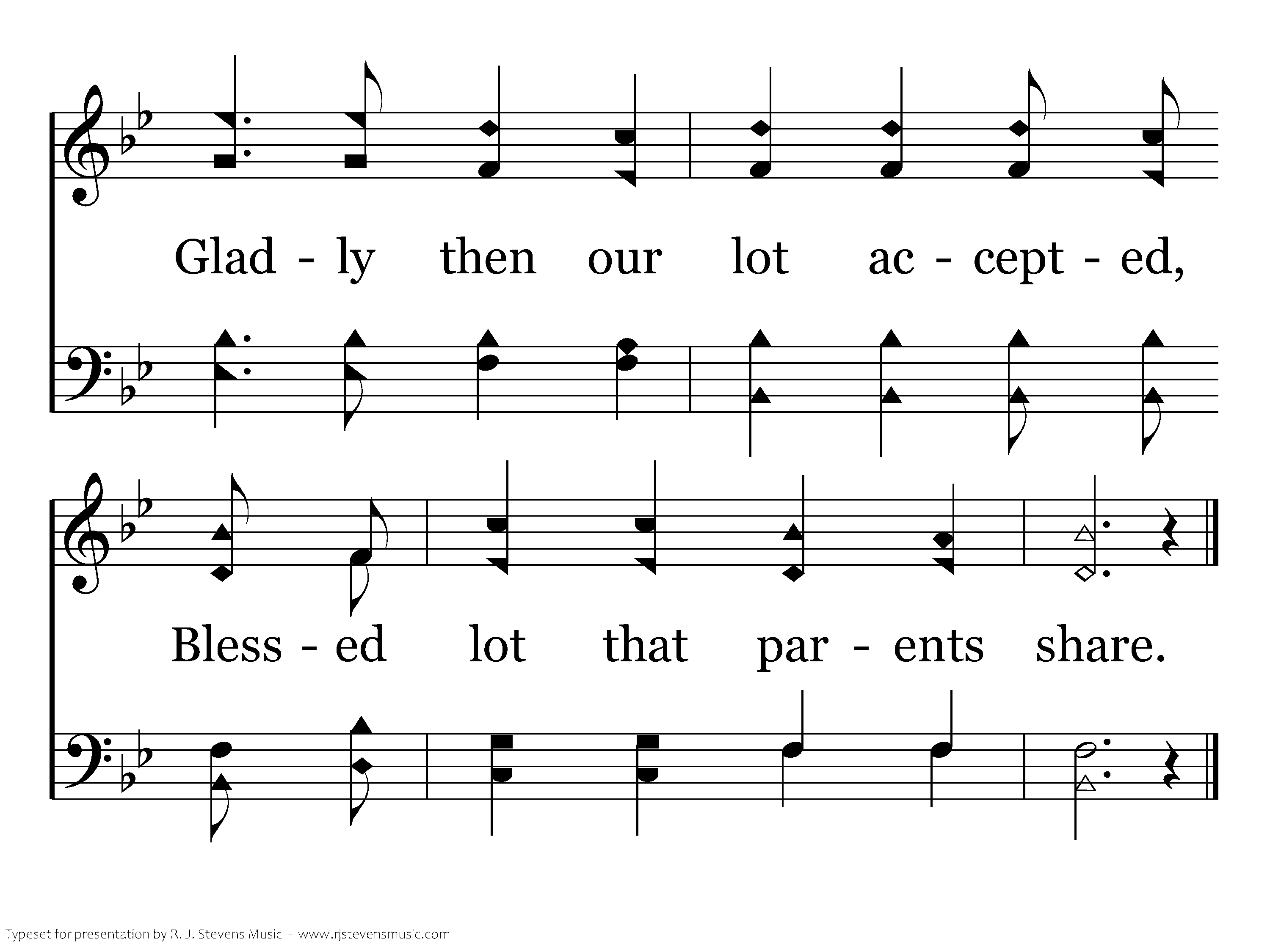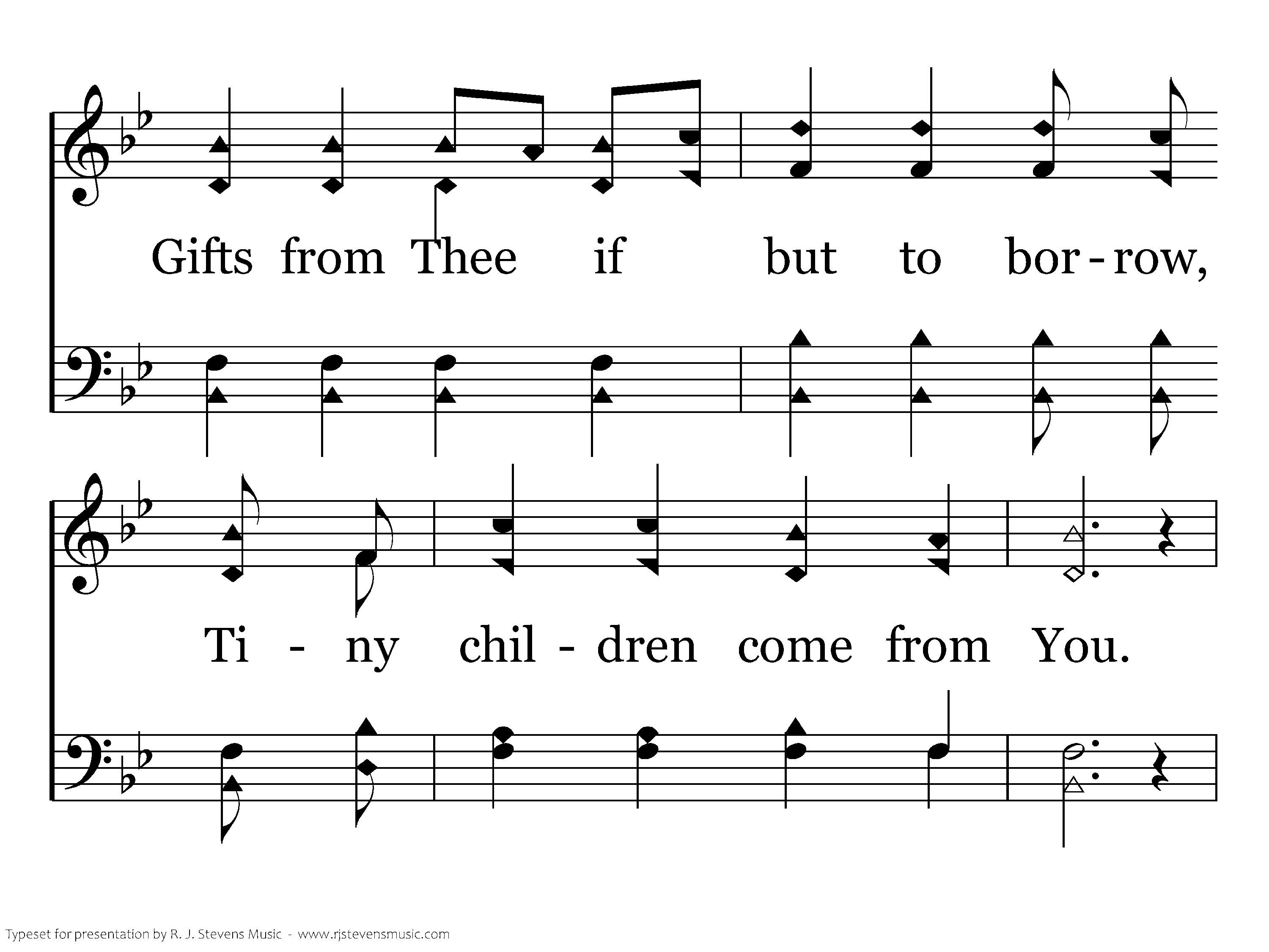 Tiny sons and tiny daughters, Many joys but sorrows few; Gifts from Thee if but to borrow, Tiny children come from You. Shared with us by Thee, O Father, Placed within our fragile care; Gladly then our lot accepted, Blessed lot that parents share.