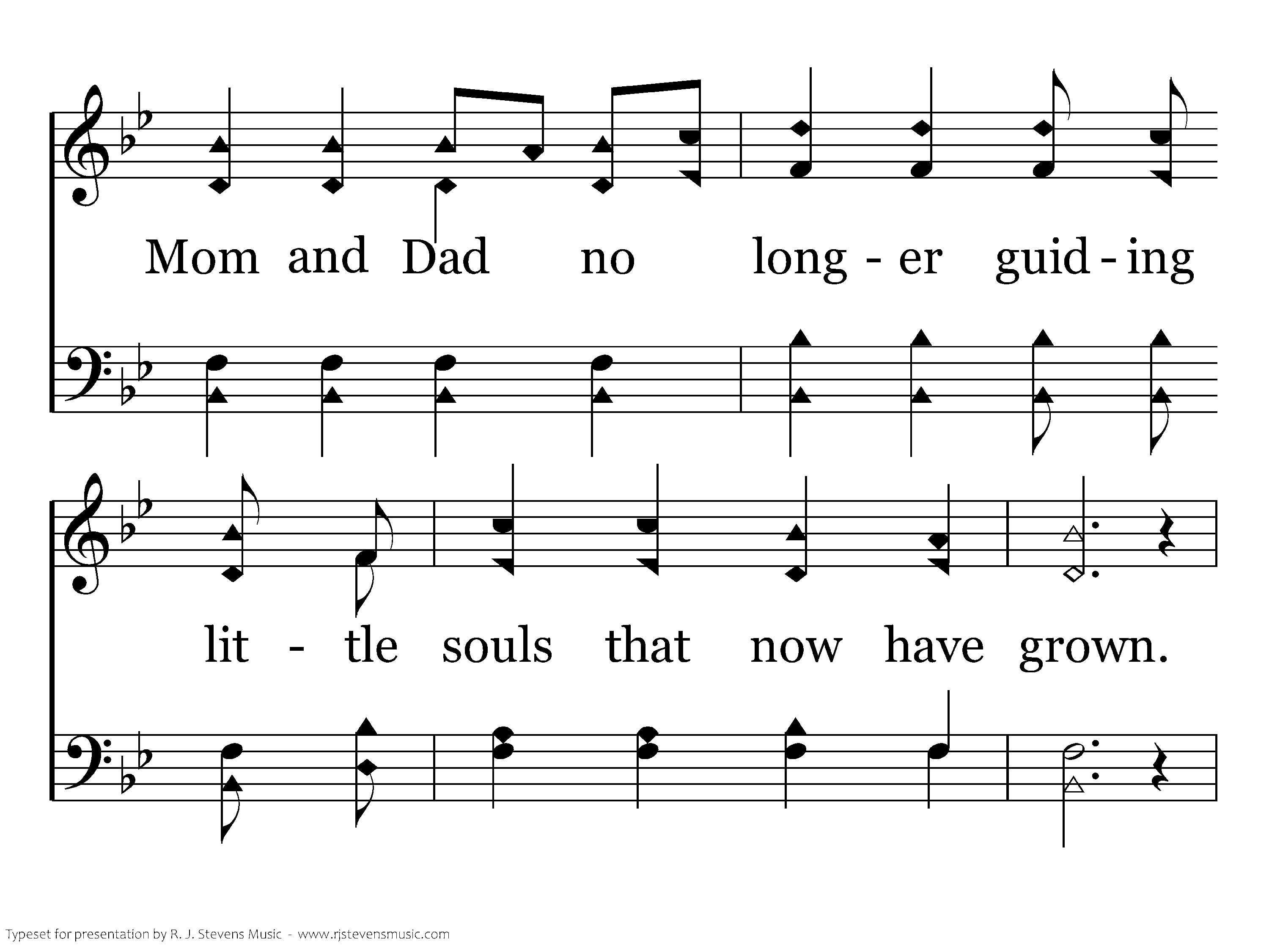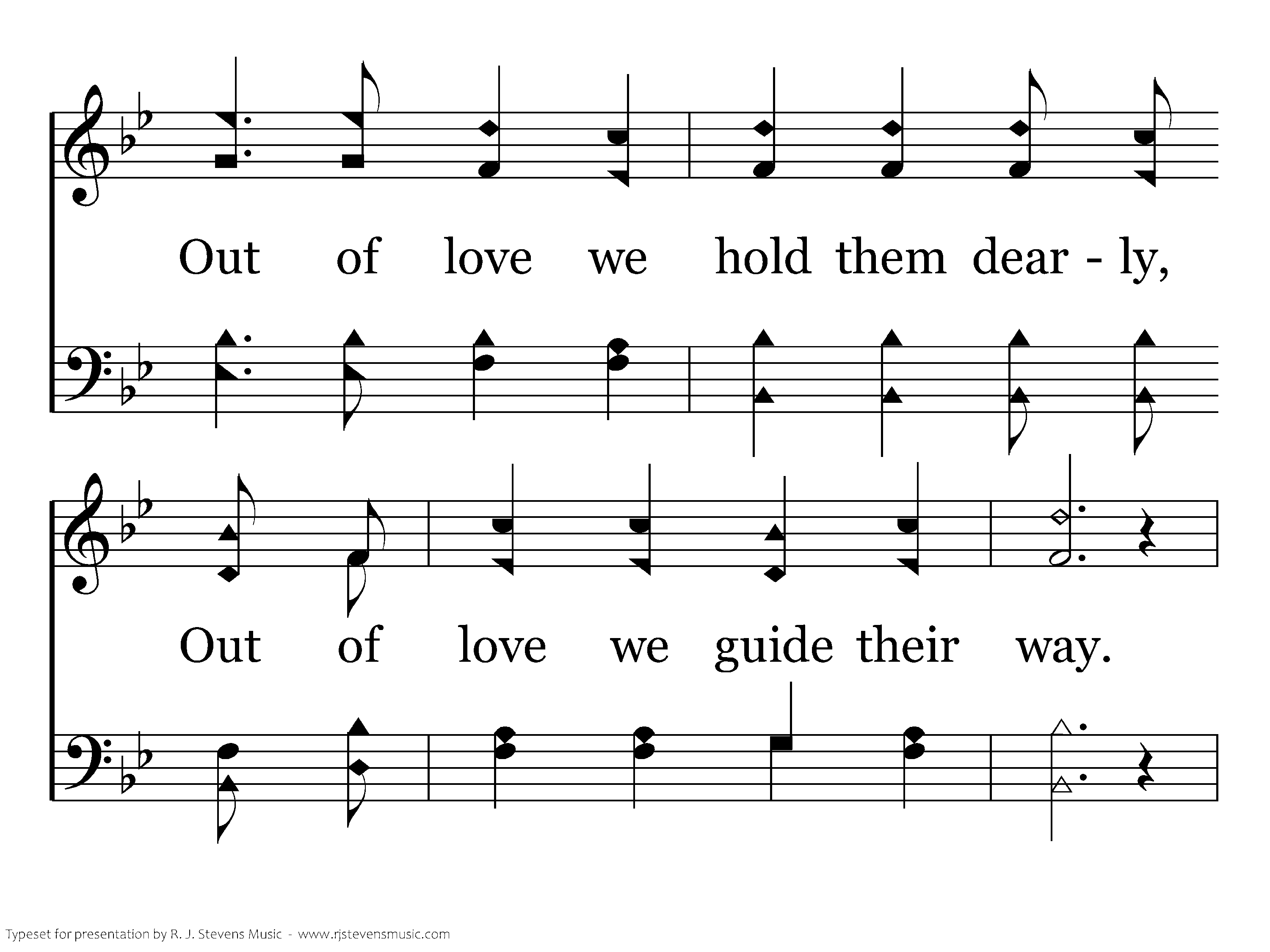 Little children soon departing; Childish ways too soon are flown. Mom and Dad no longer guiding little souls that now have grown. Out of love we hold them dearly, Out of love we guide their way. Out of gratitude we praise Thee, Lord, and honor Thee each day.