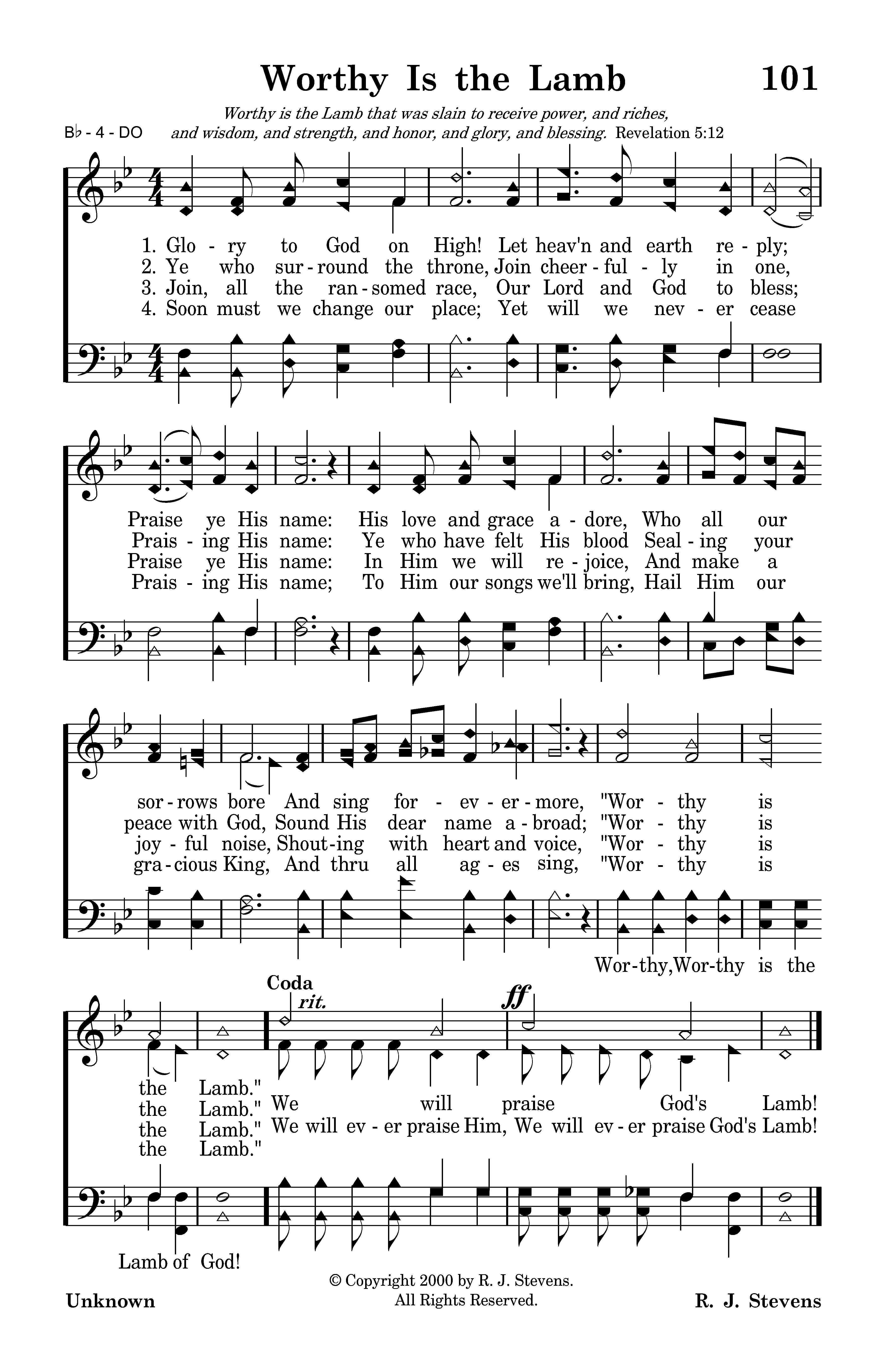 Glory to God on High! Let heav'n and earth reply; Praise ye His name: His love and grace adore, Who all our sorrows bore And sing forever more, "Worthy is the Lamb."