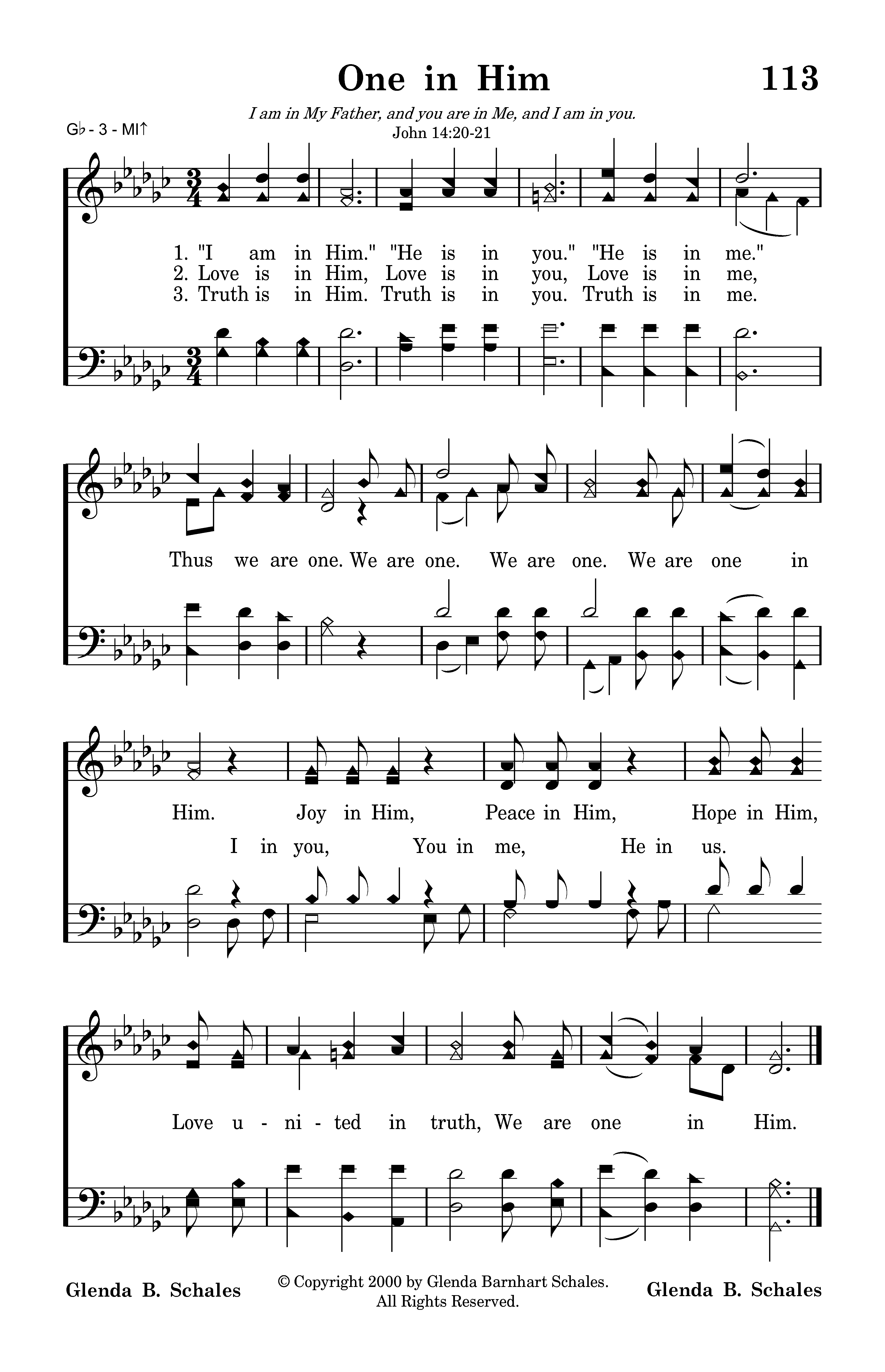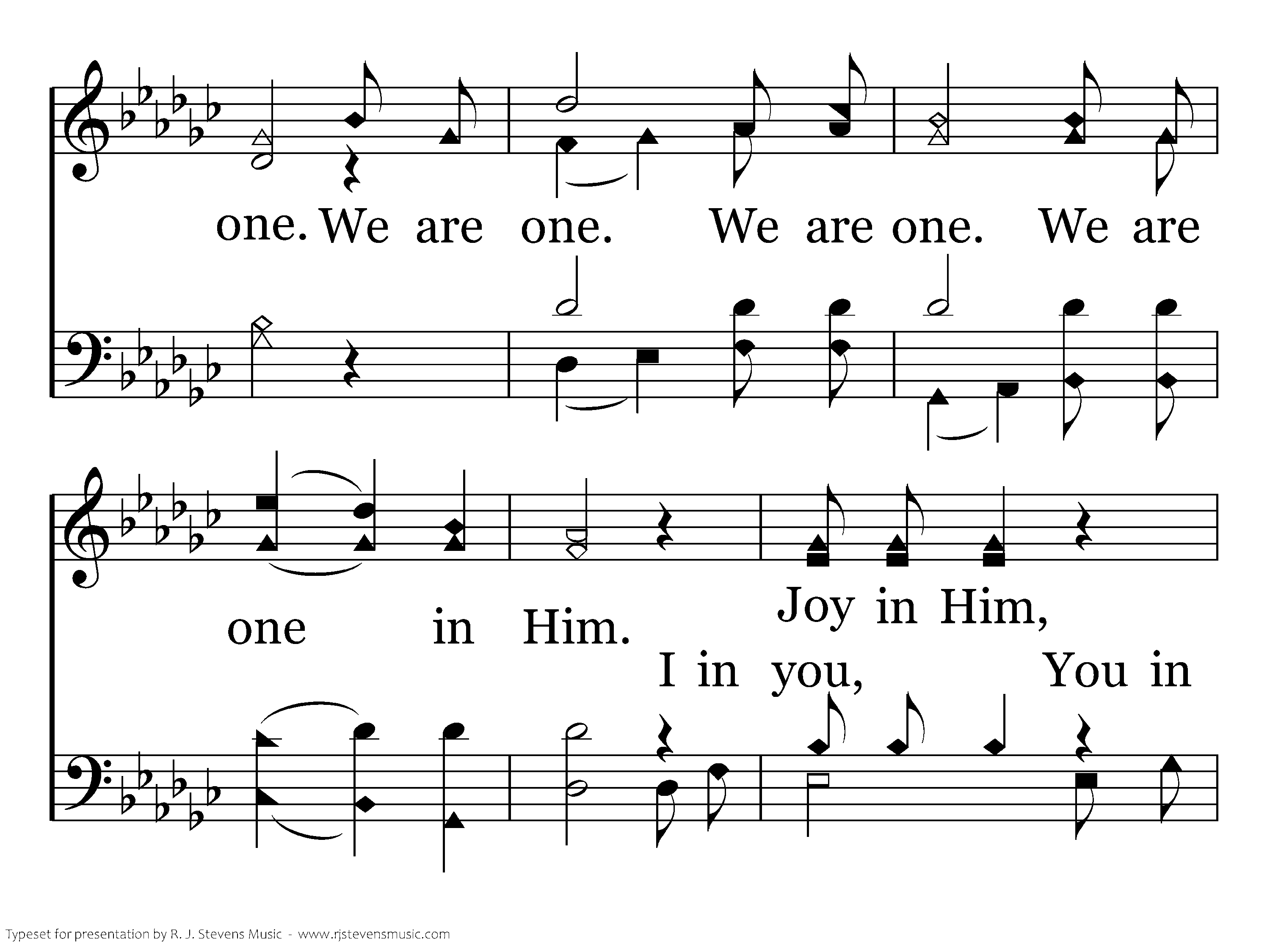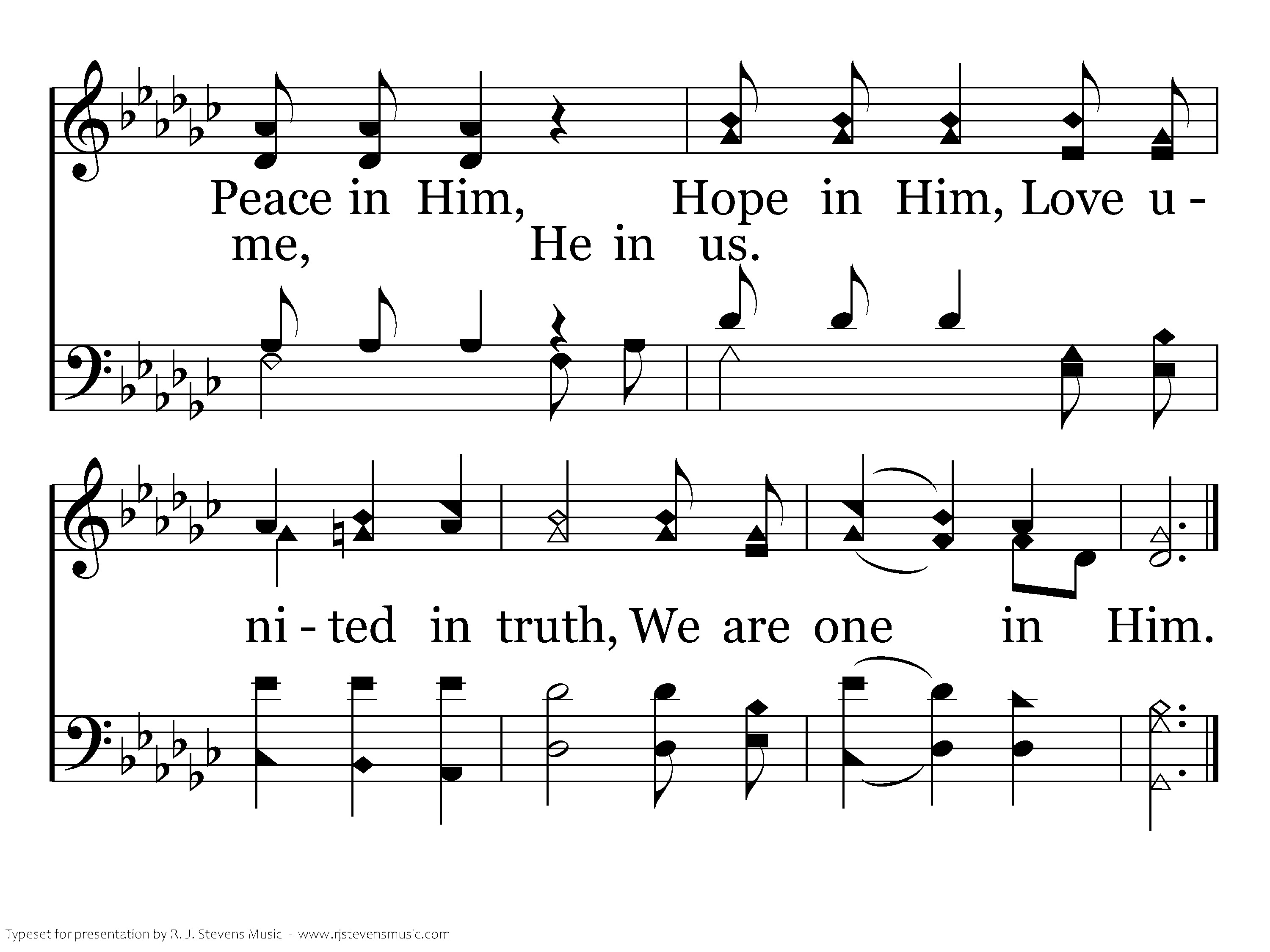 Truth is in Him. Truth is in you. Truth is in me. Thus we are one. We are one. We are one. We are one in Him. I in you, Joy in Him, You in me, Peace in Him, He in us. Hope in Him, Love united in truth, We are one in Him.