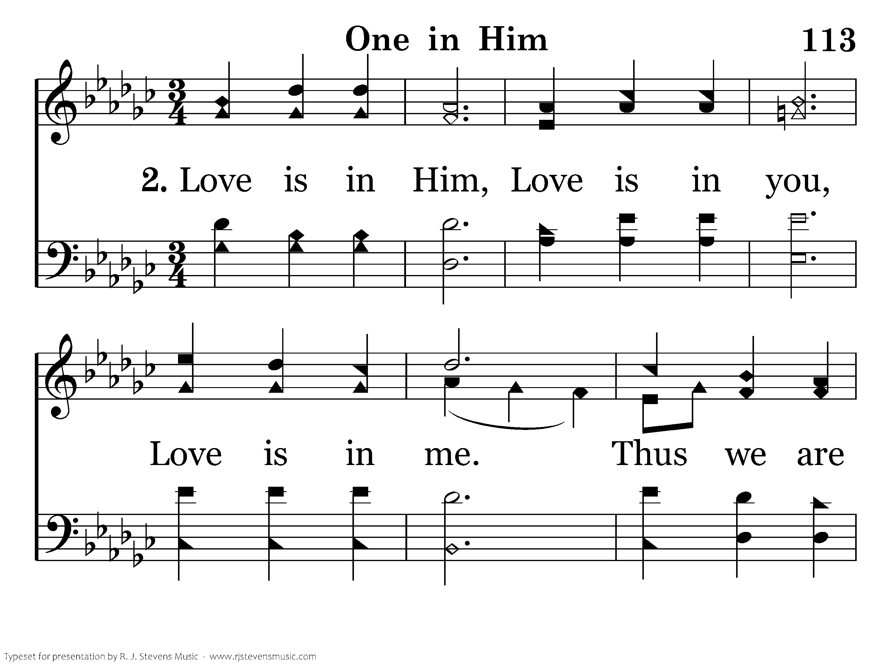 Love is in Him, Love is in you, Love is in me. Thus we are one. We are one. We are one. We are one in Him. I in you, Joy in Him, You in me, Peace in Him, He in us. Hope in Him, Love united in truth, We are one in Him.