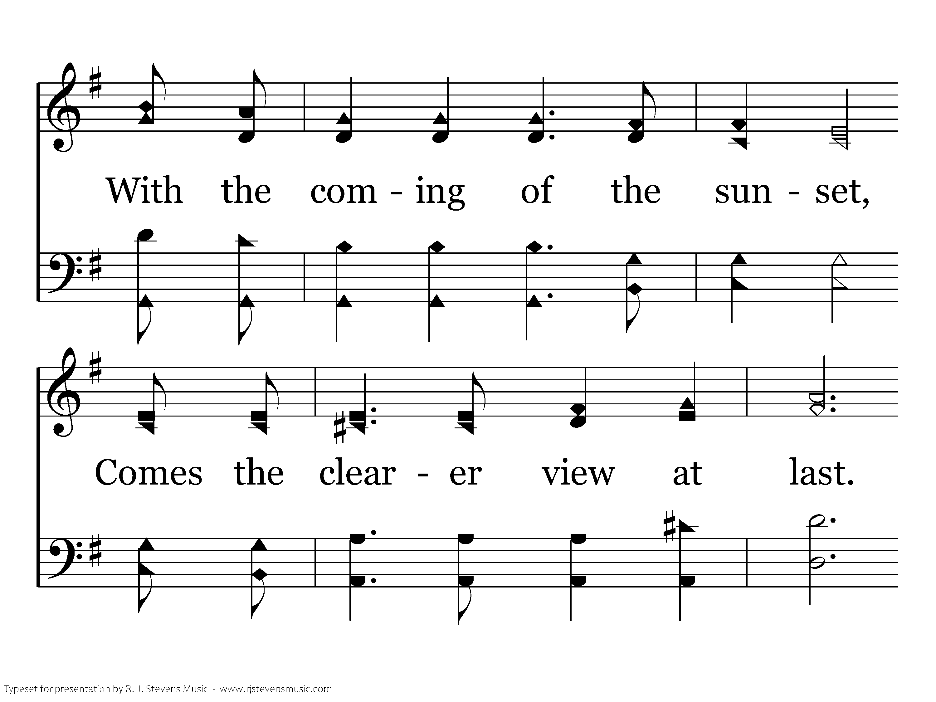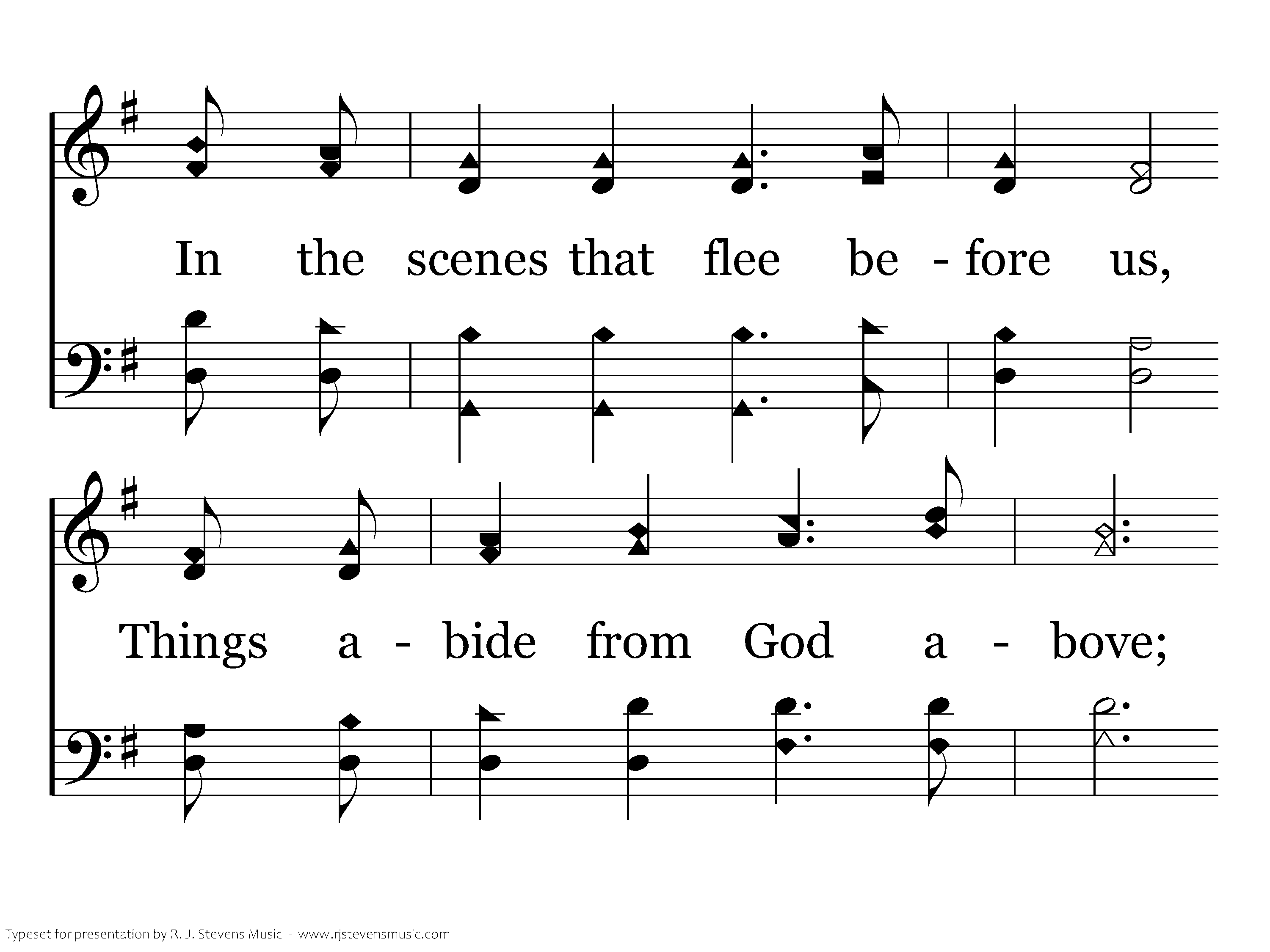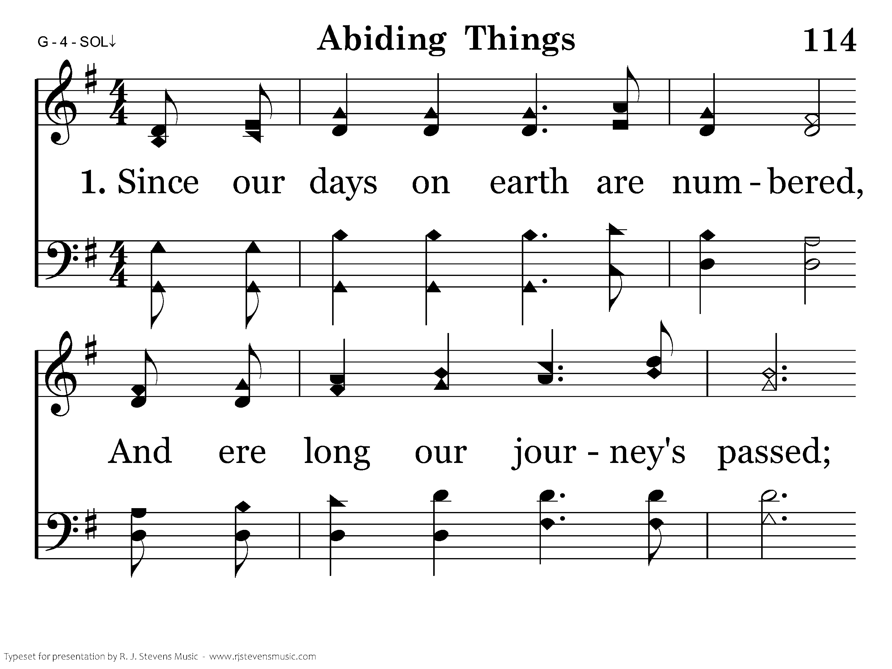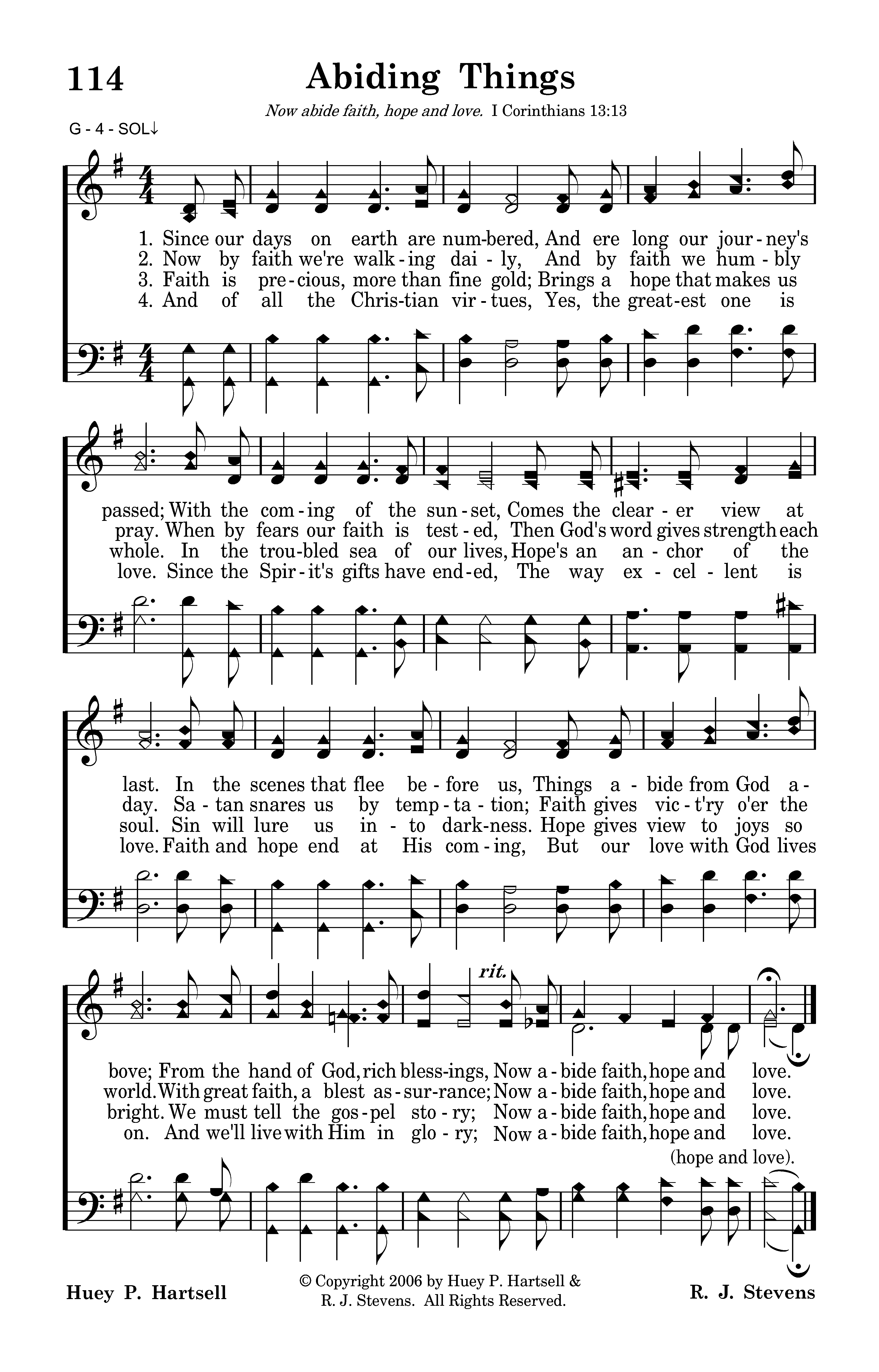 Since our days on earth are numbered, And ere long our journey's passed; With the coming of the sunset, Comes the clearer view at last. In the scenes that flee before us, Things abide from God above; From the hand of God, rich blessings, Now abide faith, hope, and love.