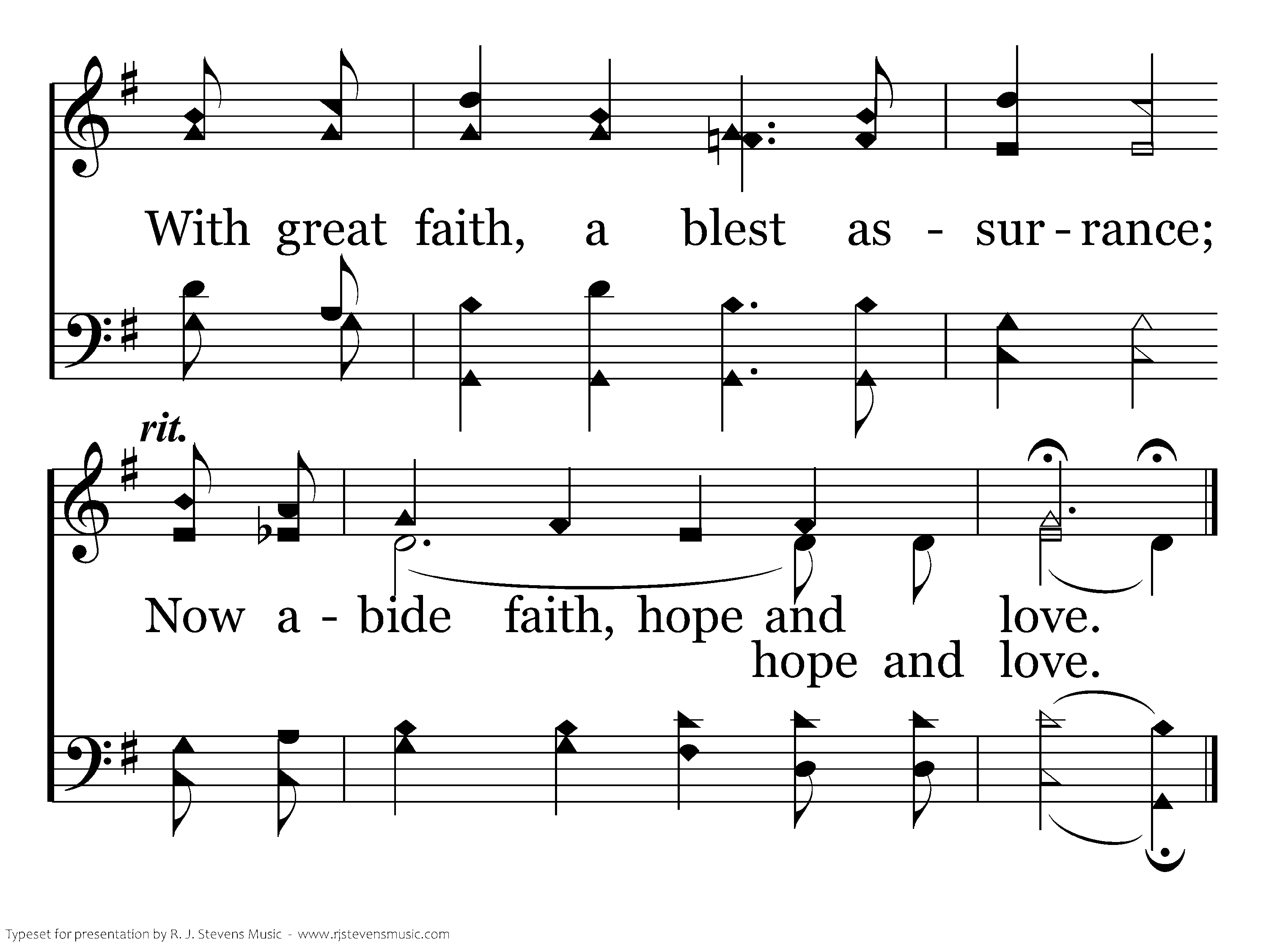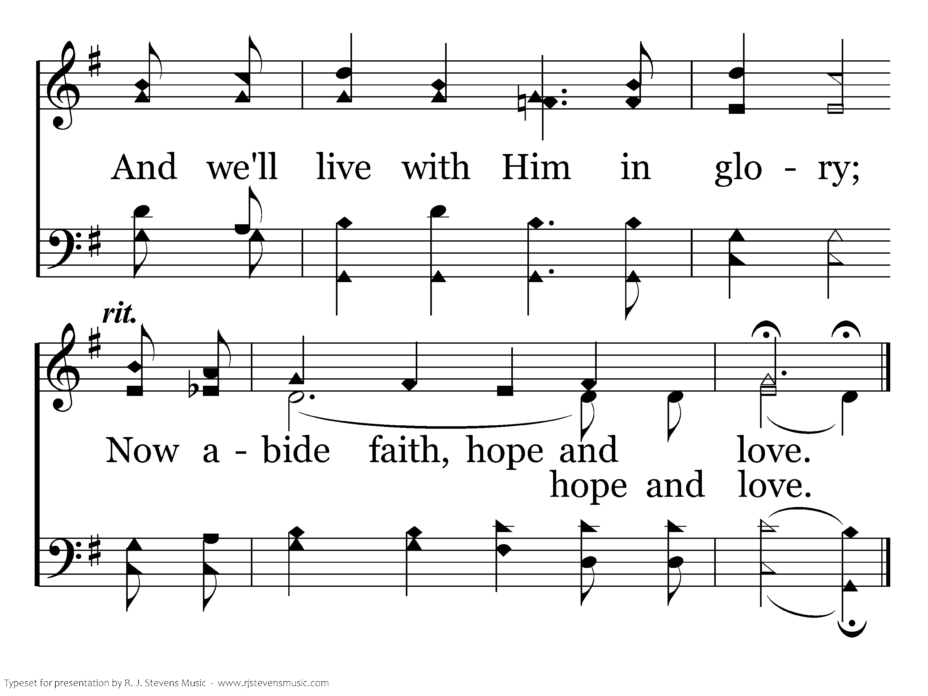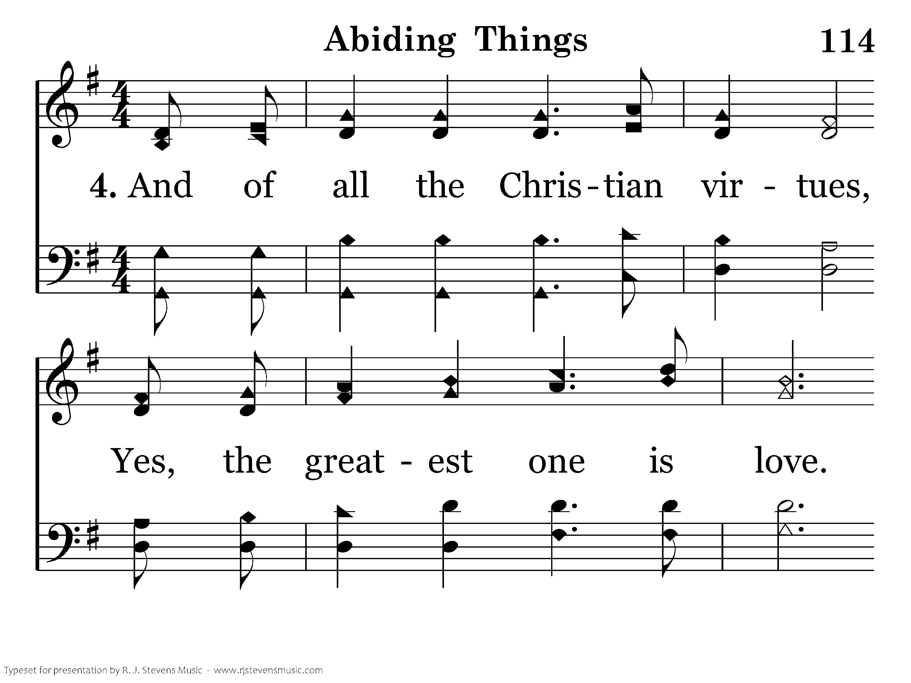 And of all the Christian virtues, Yes, the greatest one is love. Since the Spirit's gifts have ended, The way excellent is love. Faith and hope end at His coming, But our love with God lives on. And we'll live with Him in glory; Now abide faith, hope and love.