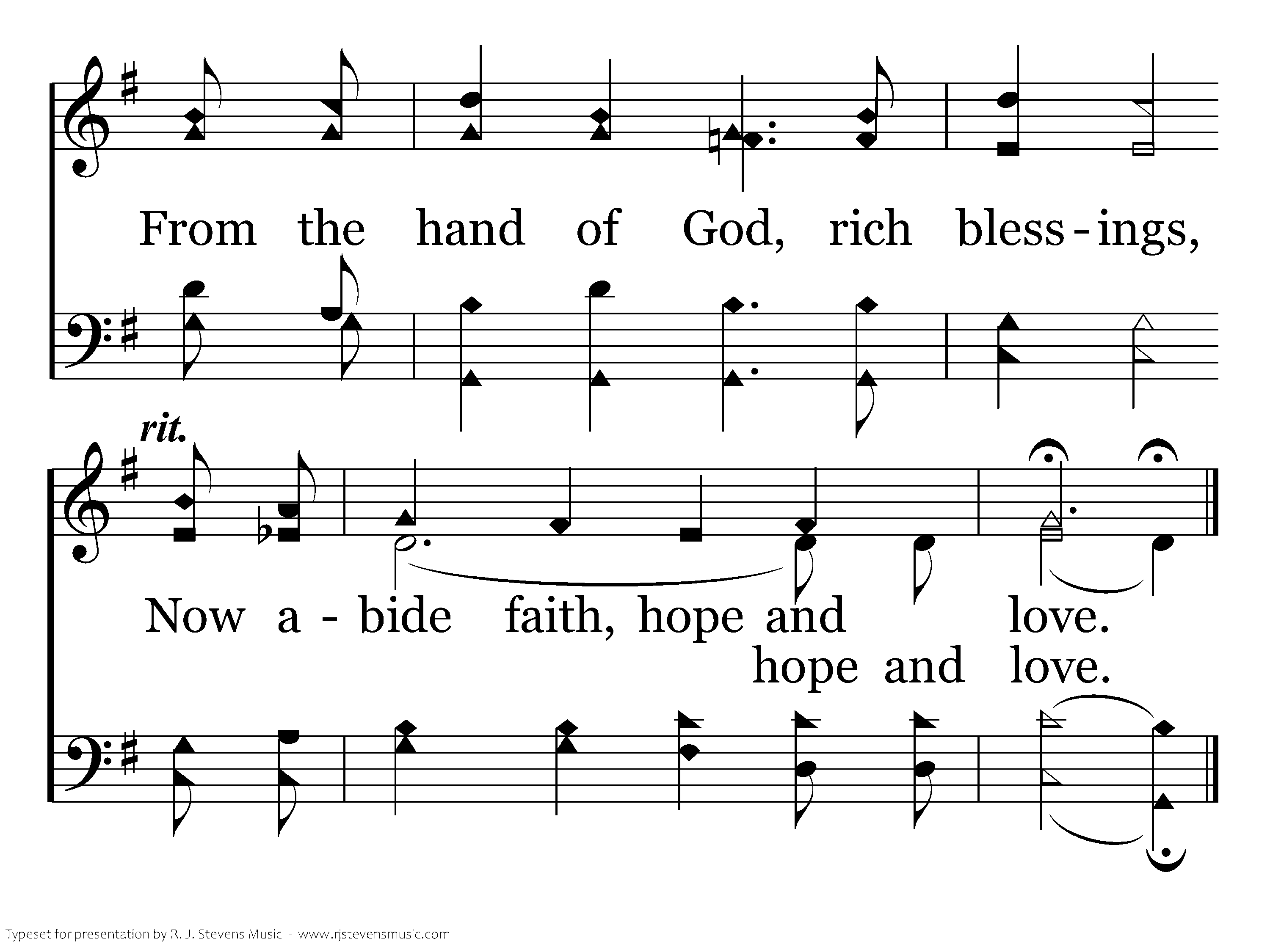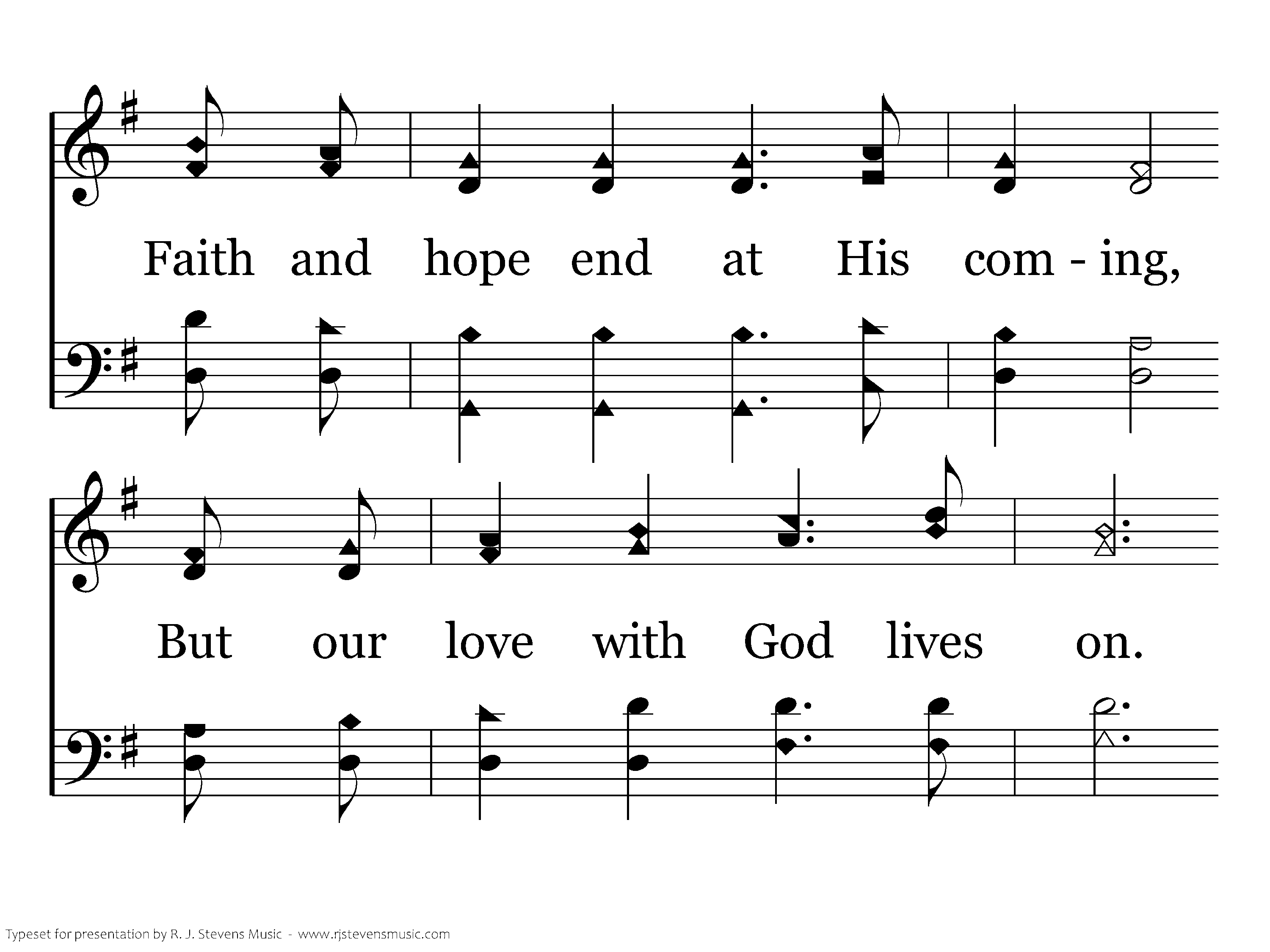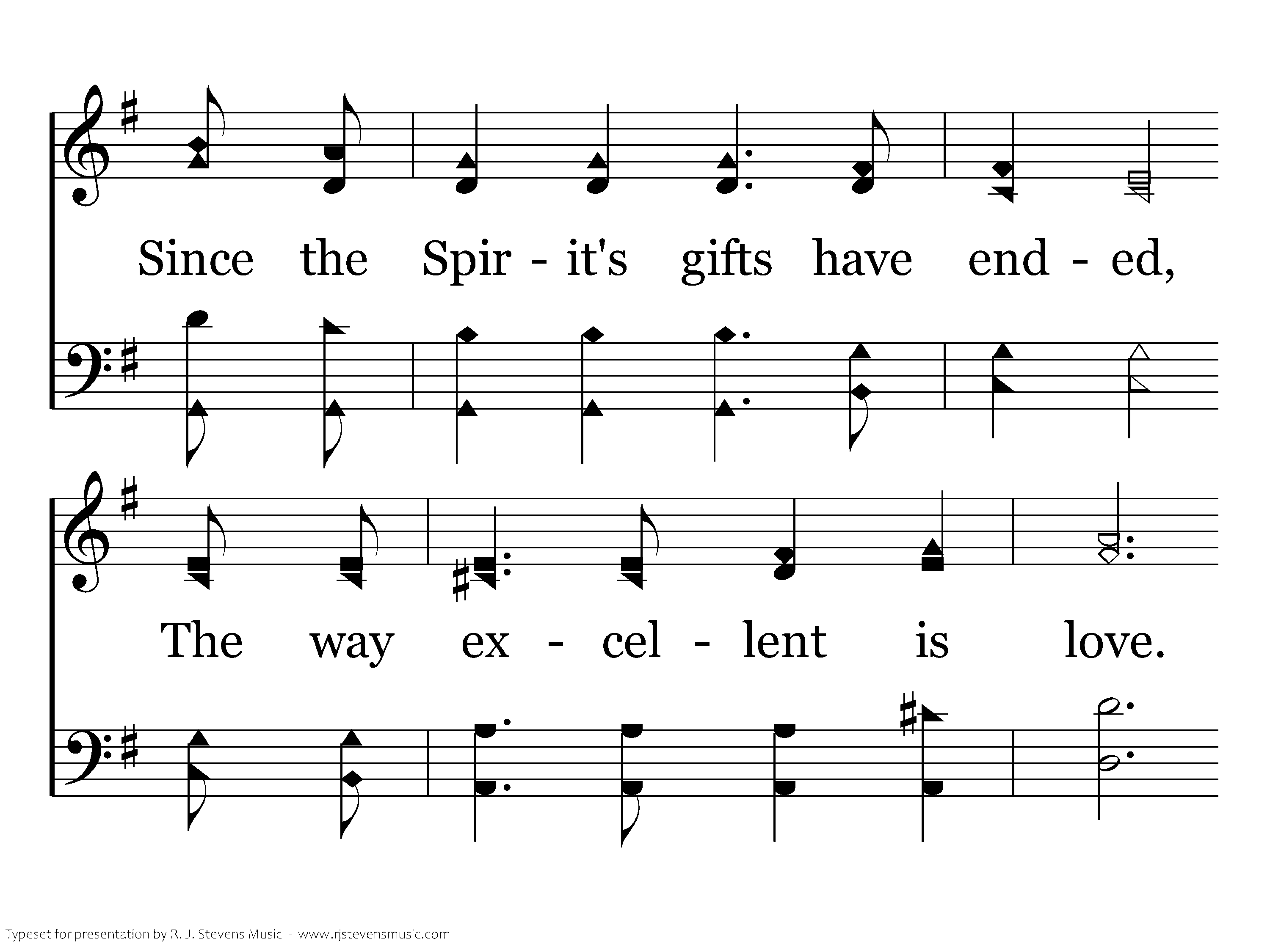 And of all the Christian virtues, Yes, the greatest one is love. Since the Spirit's gifts have ended, The way excellent is love. Faith and hope end at His coming, But our love with God lives on. And we'll live with Him in glory; Now abide faith, hope and love.