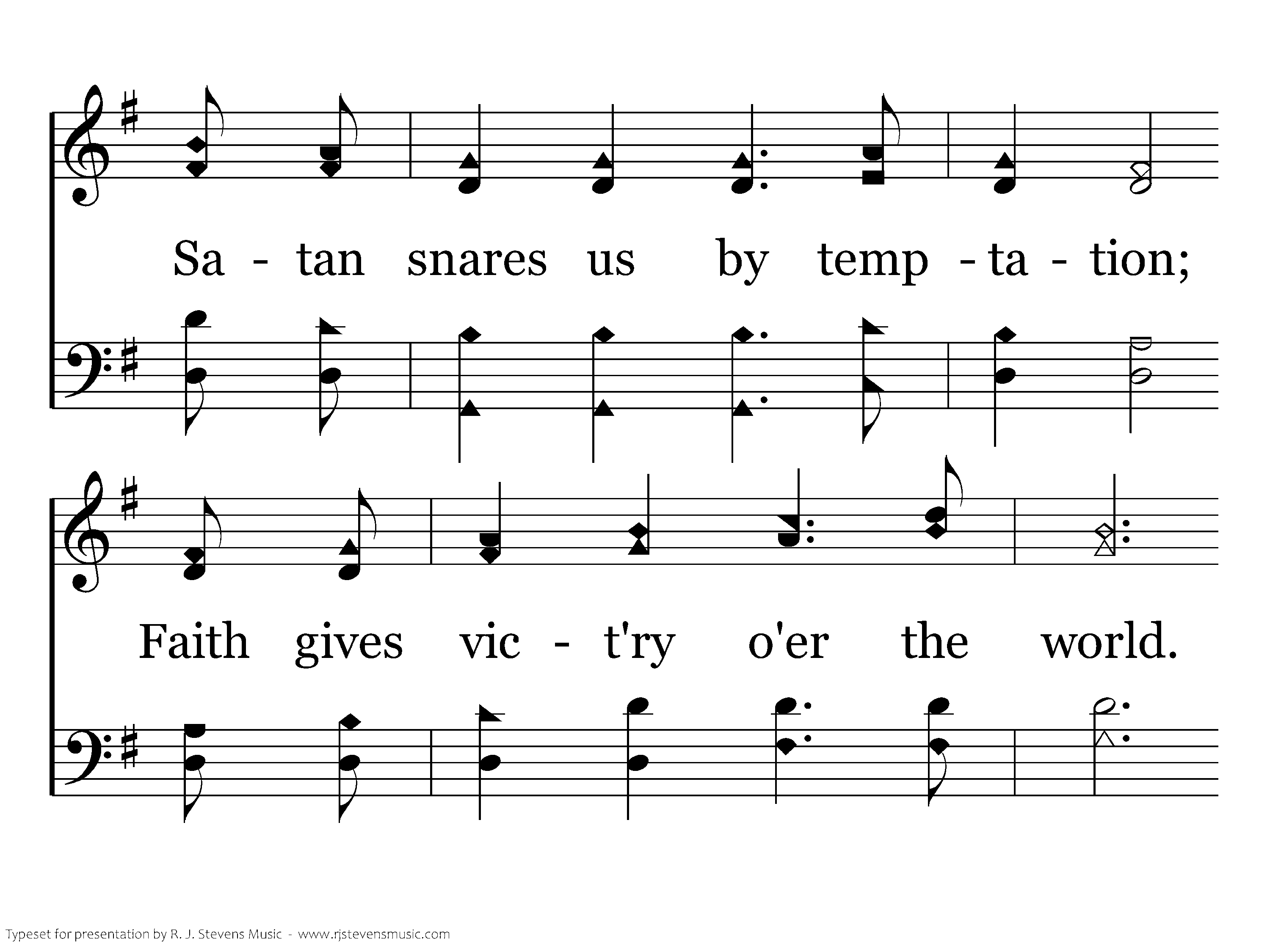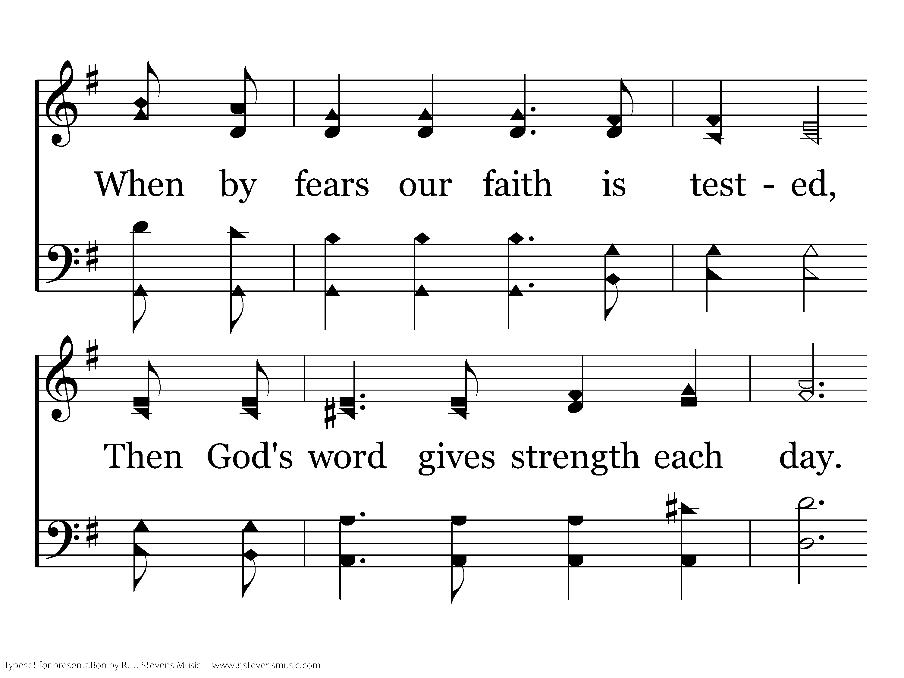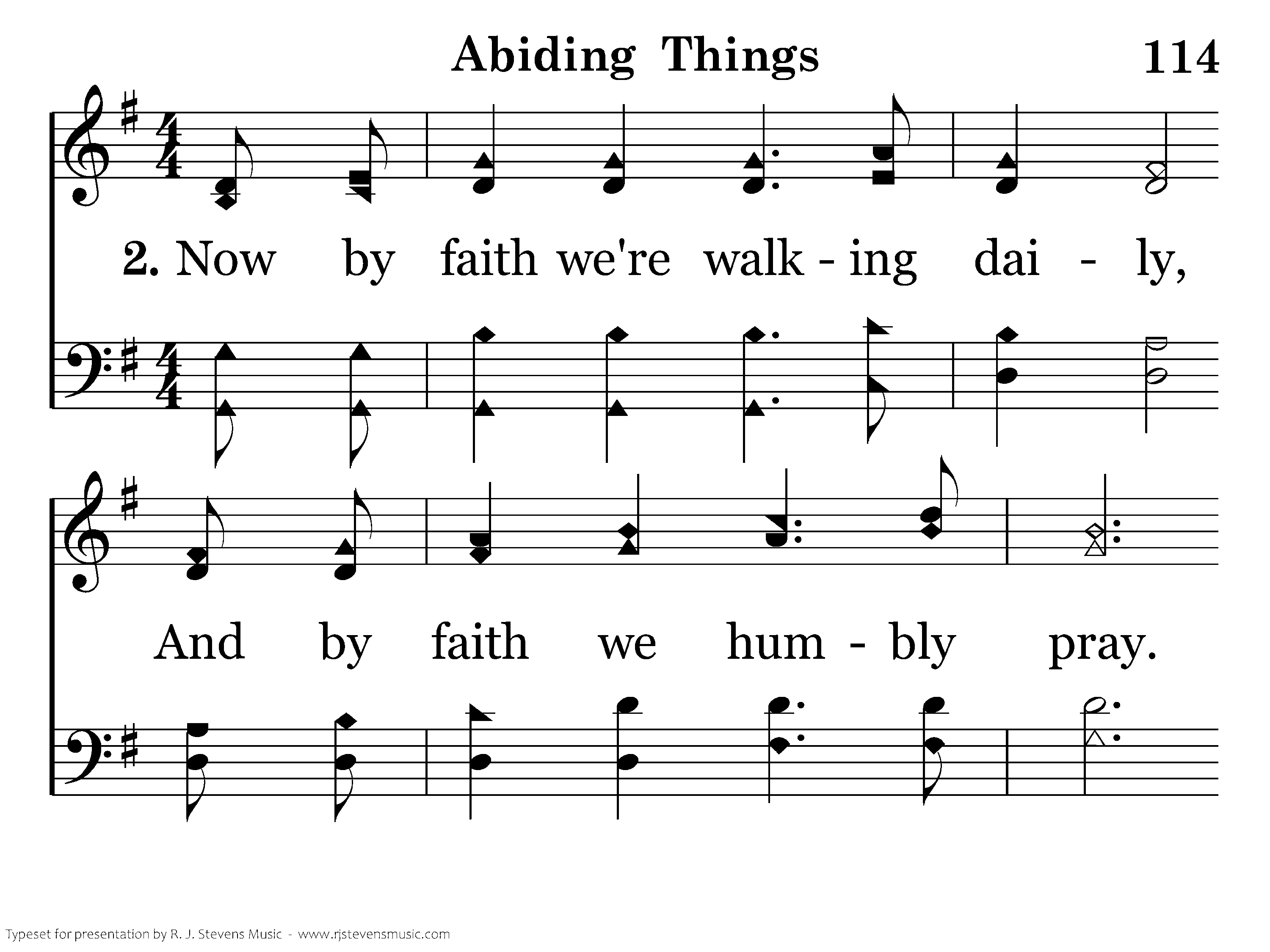 Now by faith we're walking daily, And by faith we humbly pray. When by fears our faith is tested, then God's word gives strength each day. Satan snares us by temptation; Faith gives victory o'er the world. With great faith, a blest assurance; Now abide faith, hope, and love.