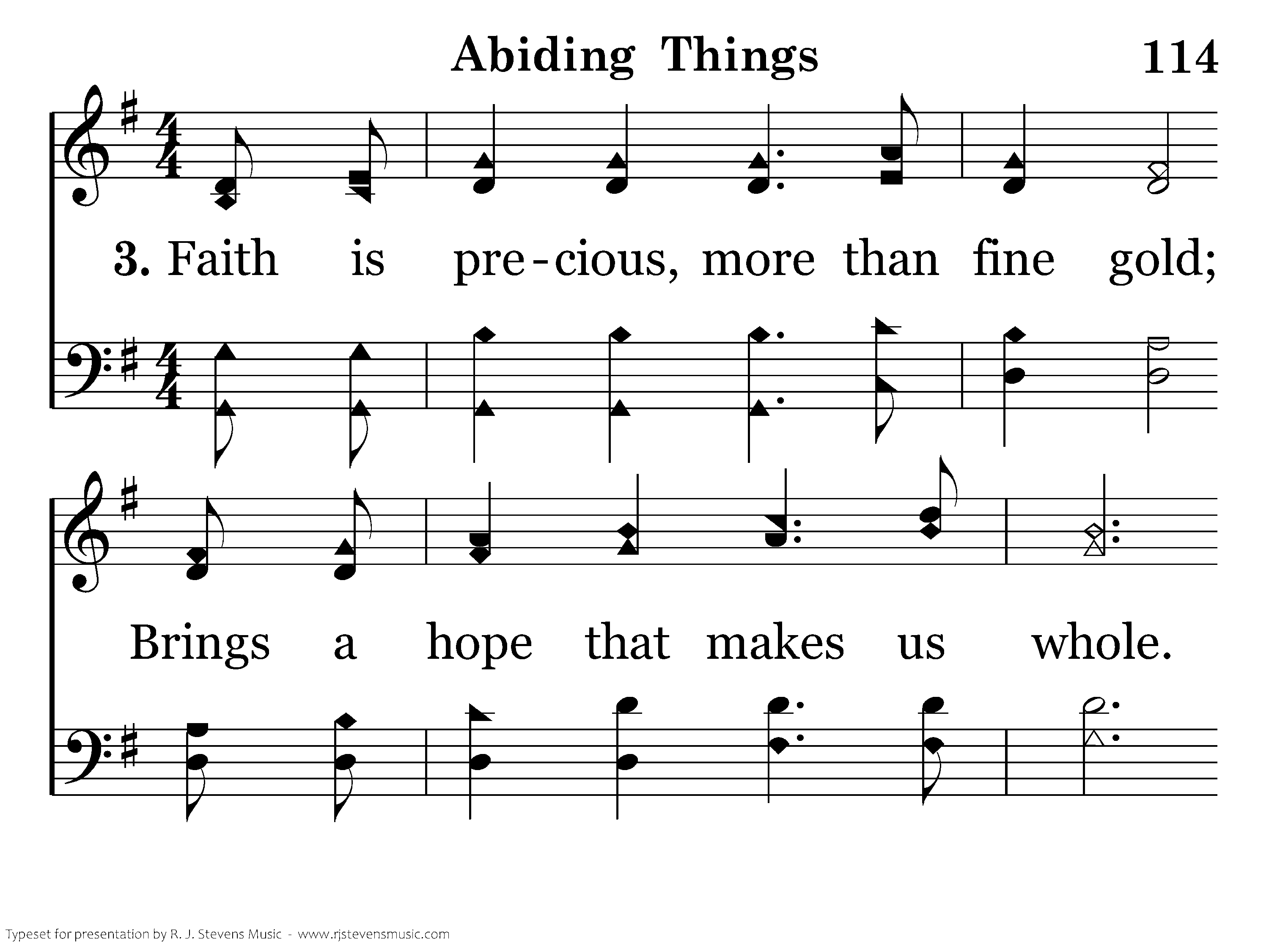 Faith is precious, more than fine gold; Brings a hope that makes us whole. In the troubled sea of our lives, Hope's an anchor of the soul. Sin will lure us into darkness. Hope gives view to joys so bright. We must tell the gospel story; Now abide faith, hope and love.