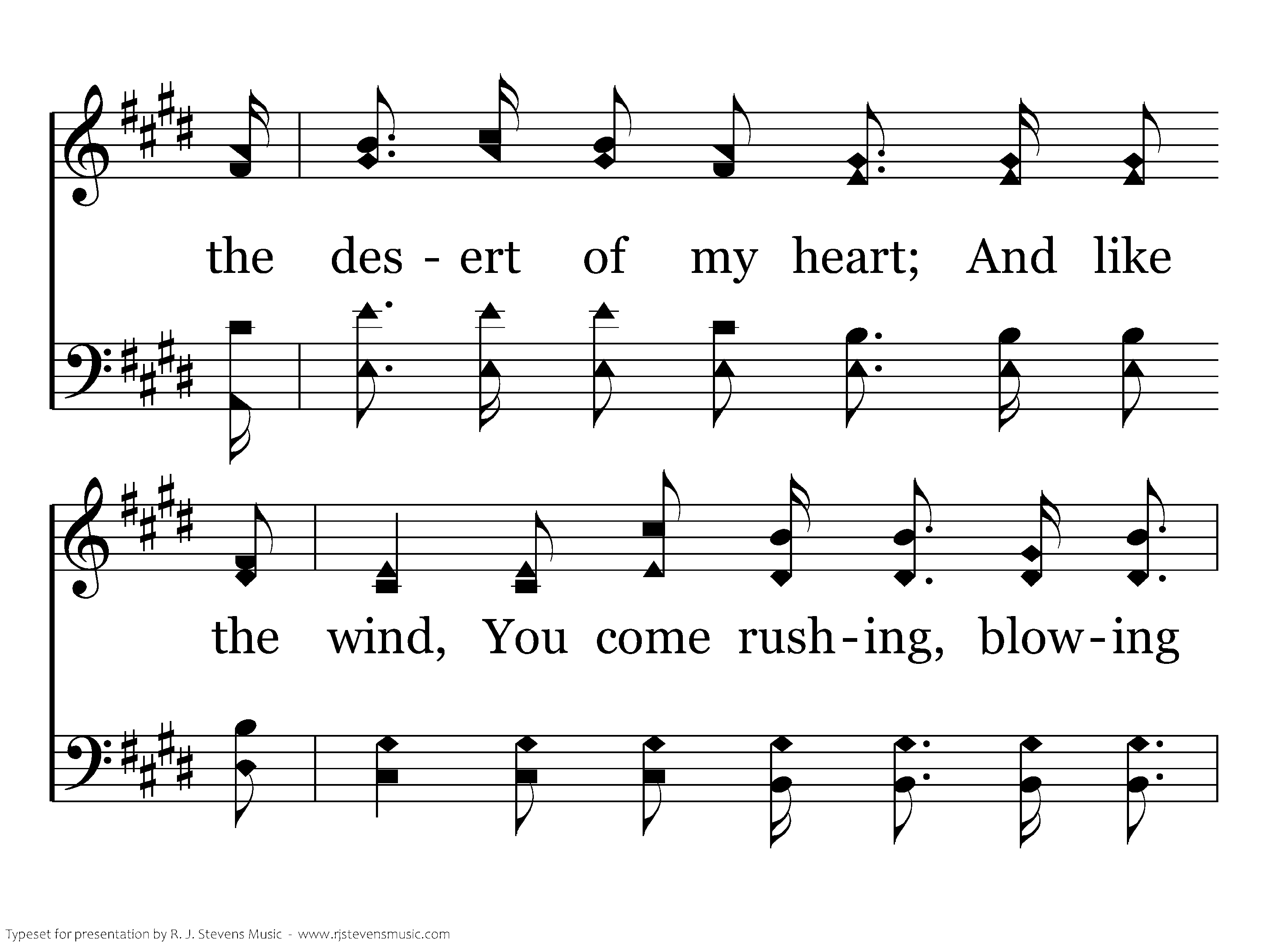 Like a river you come flooding thru the desert of my heart; And like the wind, You come rushing, blowing life thru every part; And like the snow, You're falling on me with the blood of Your own Son; And like the sun, You come shining, making darkness run.