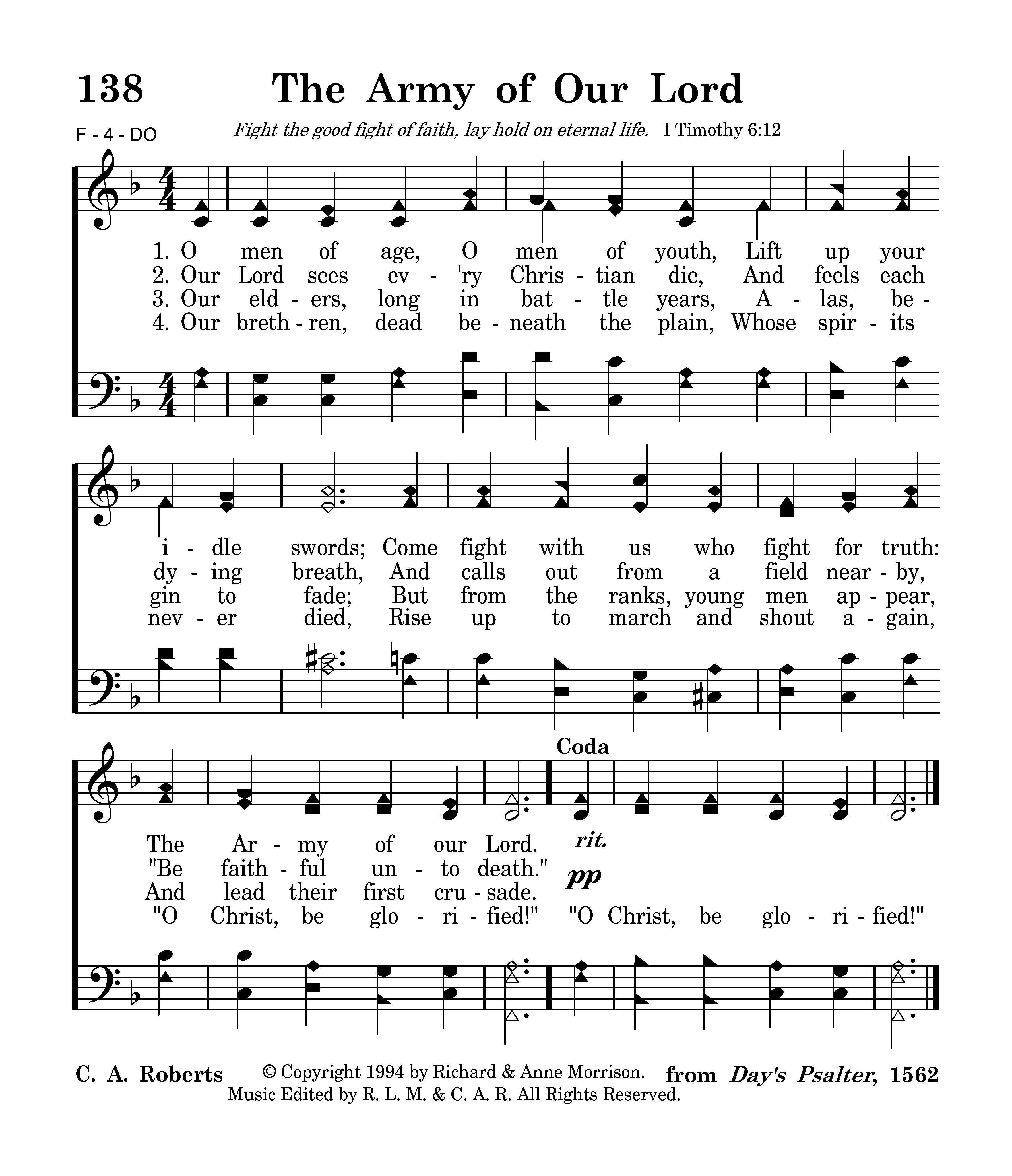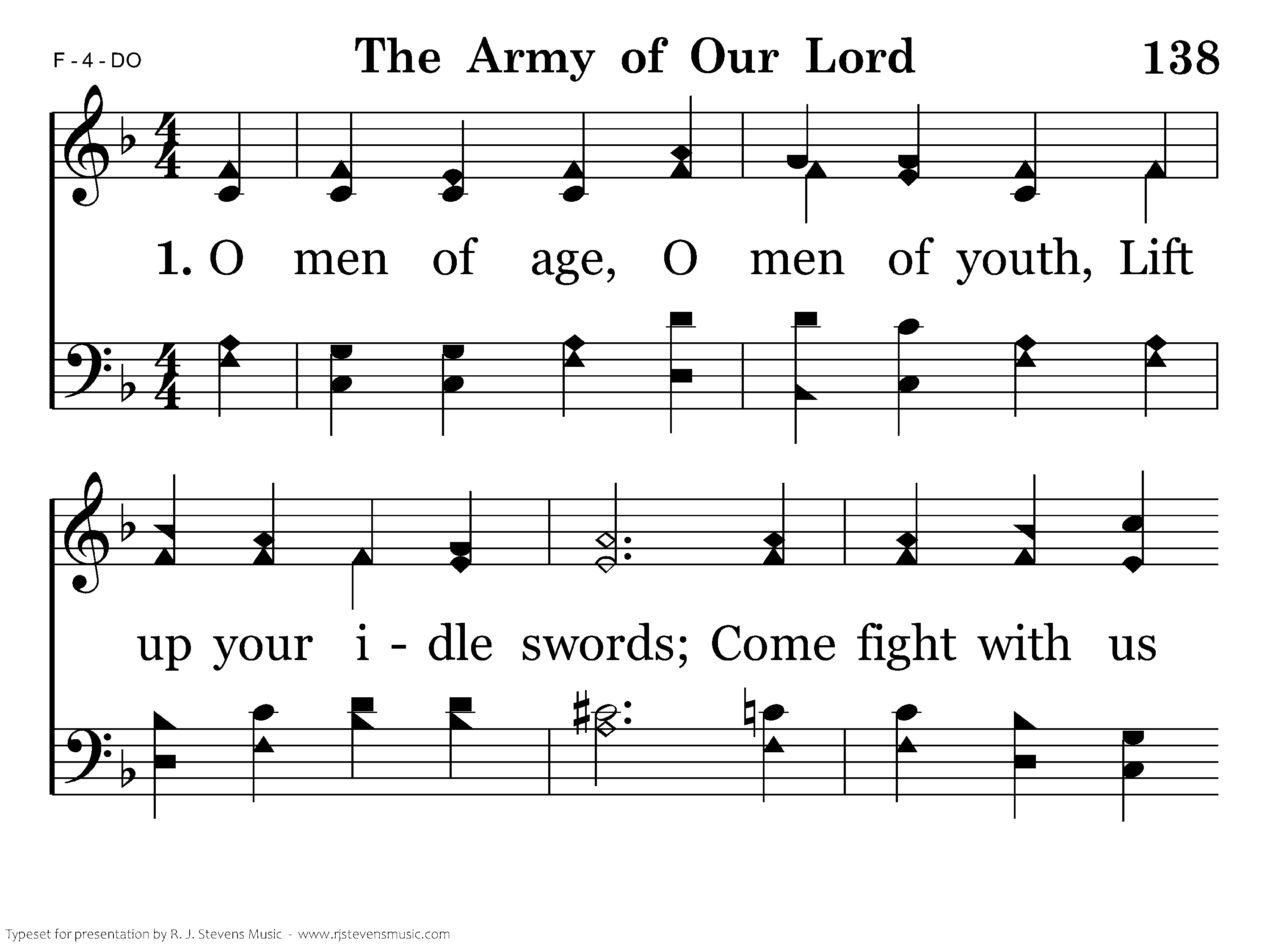 O men of age, O men of youth, Lift up your idle swords; Come fight with us who fight for truth: The Army of our Lord.