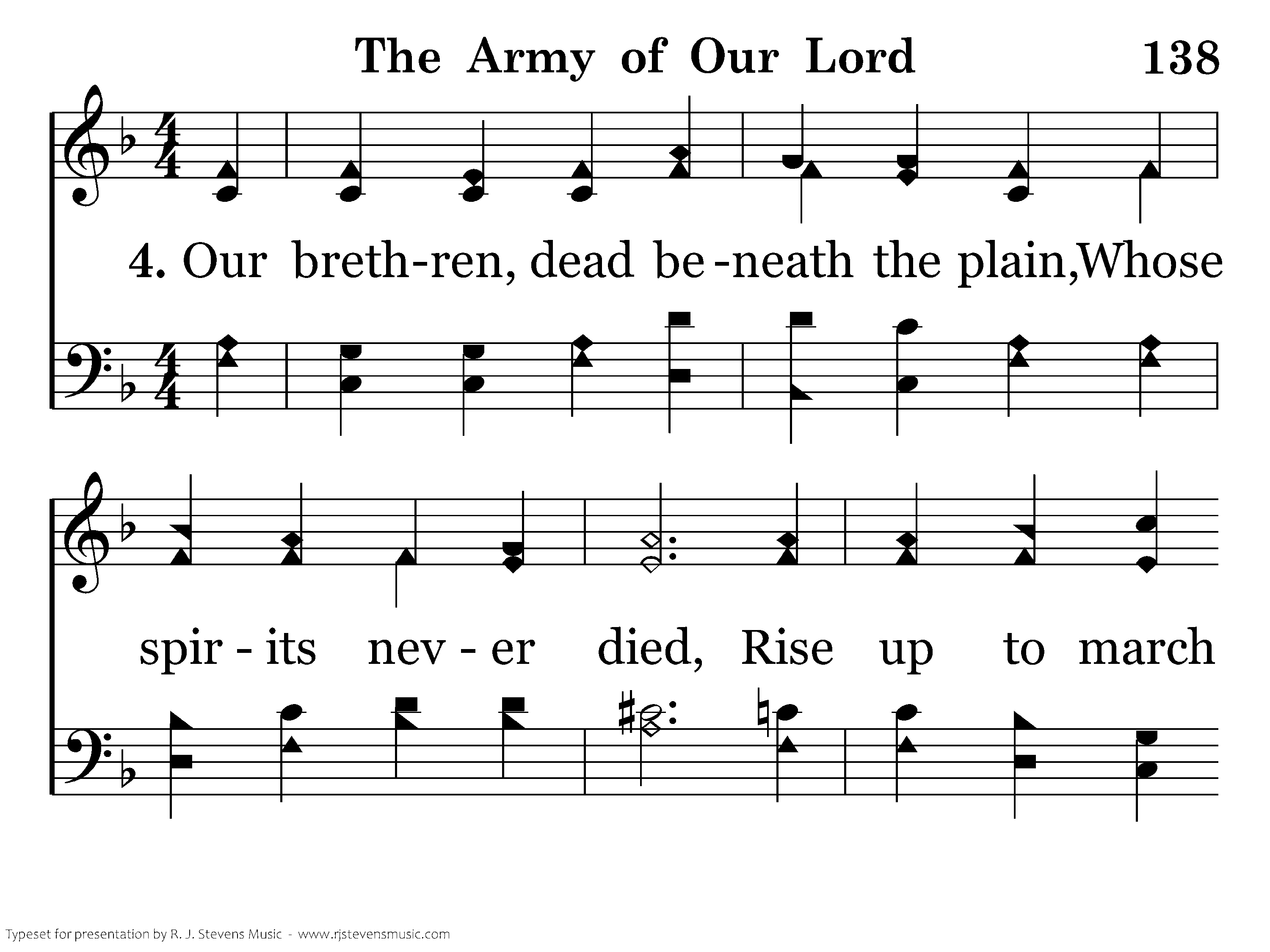 Our brethren, dead beneath the plain, Whose spirits never died, Rise up to march and shout again, "O Christ, be glorified!" "O Christ, be glorified!"