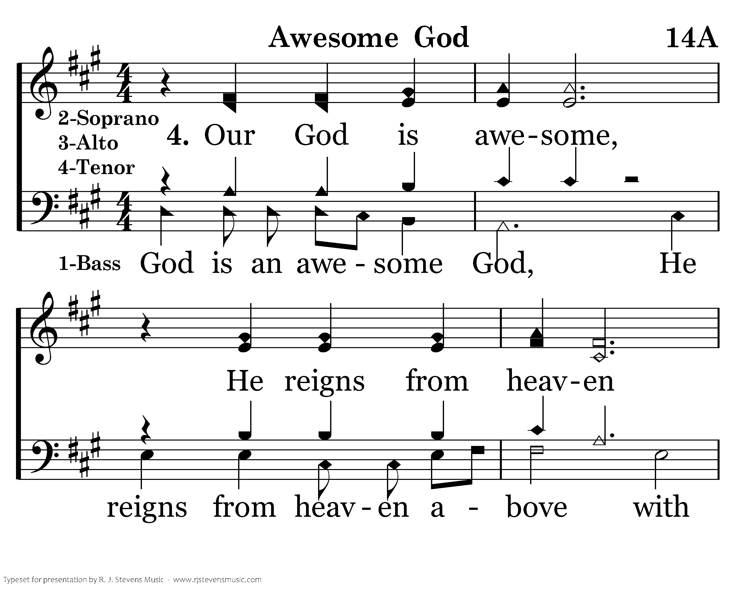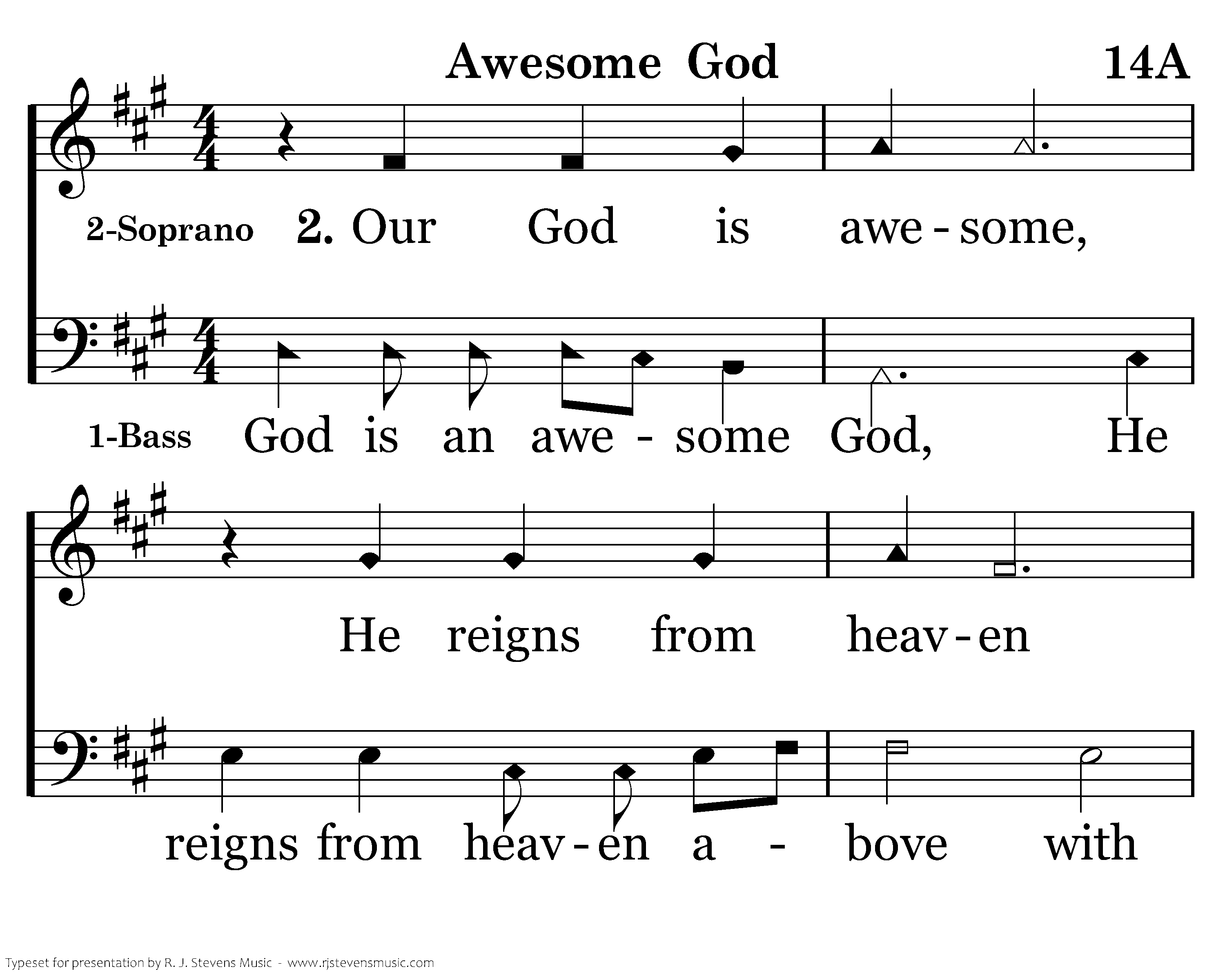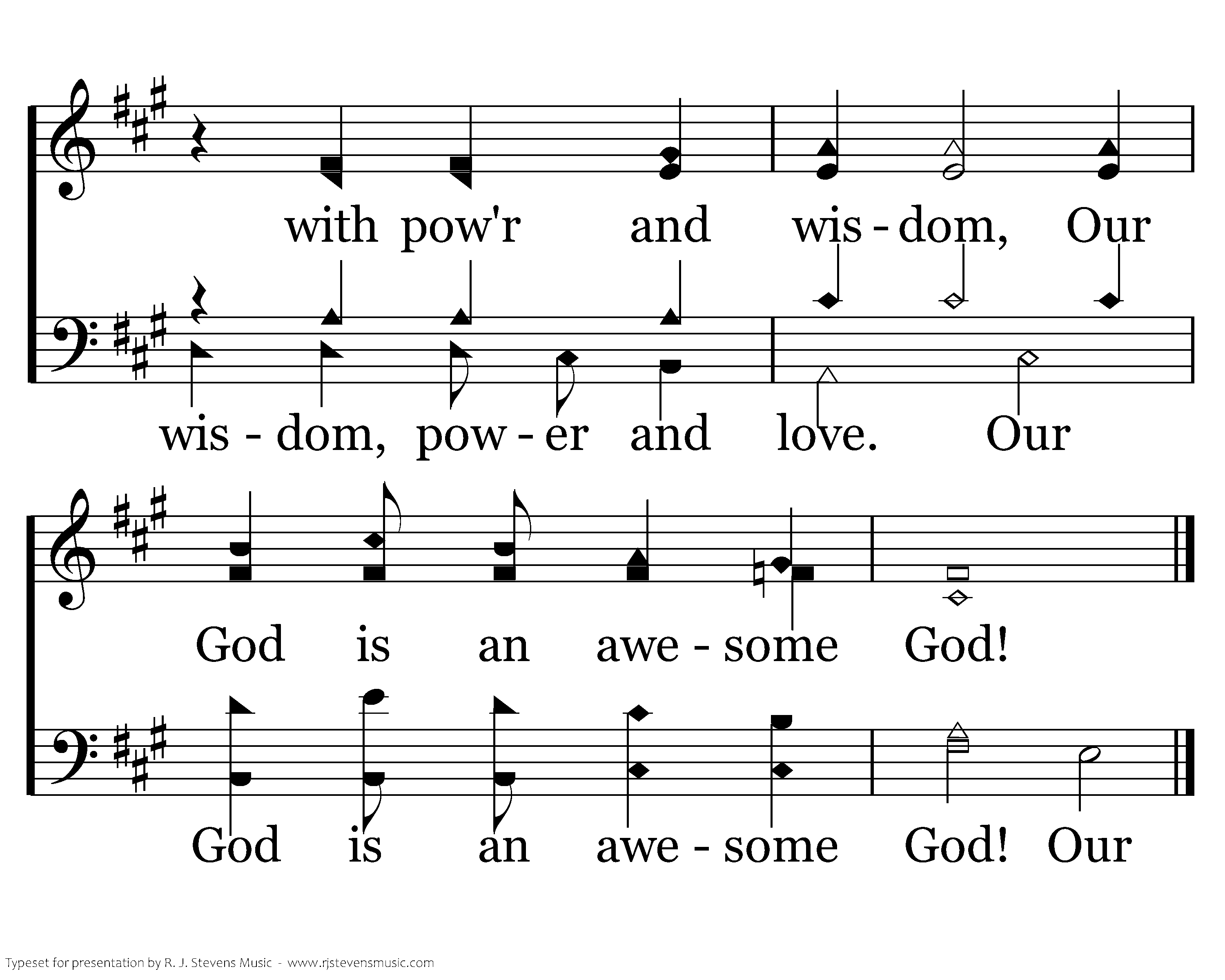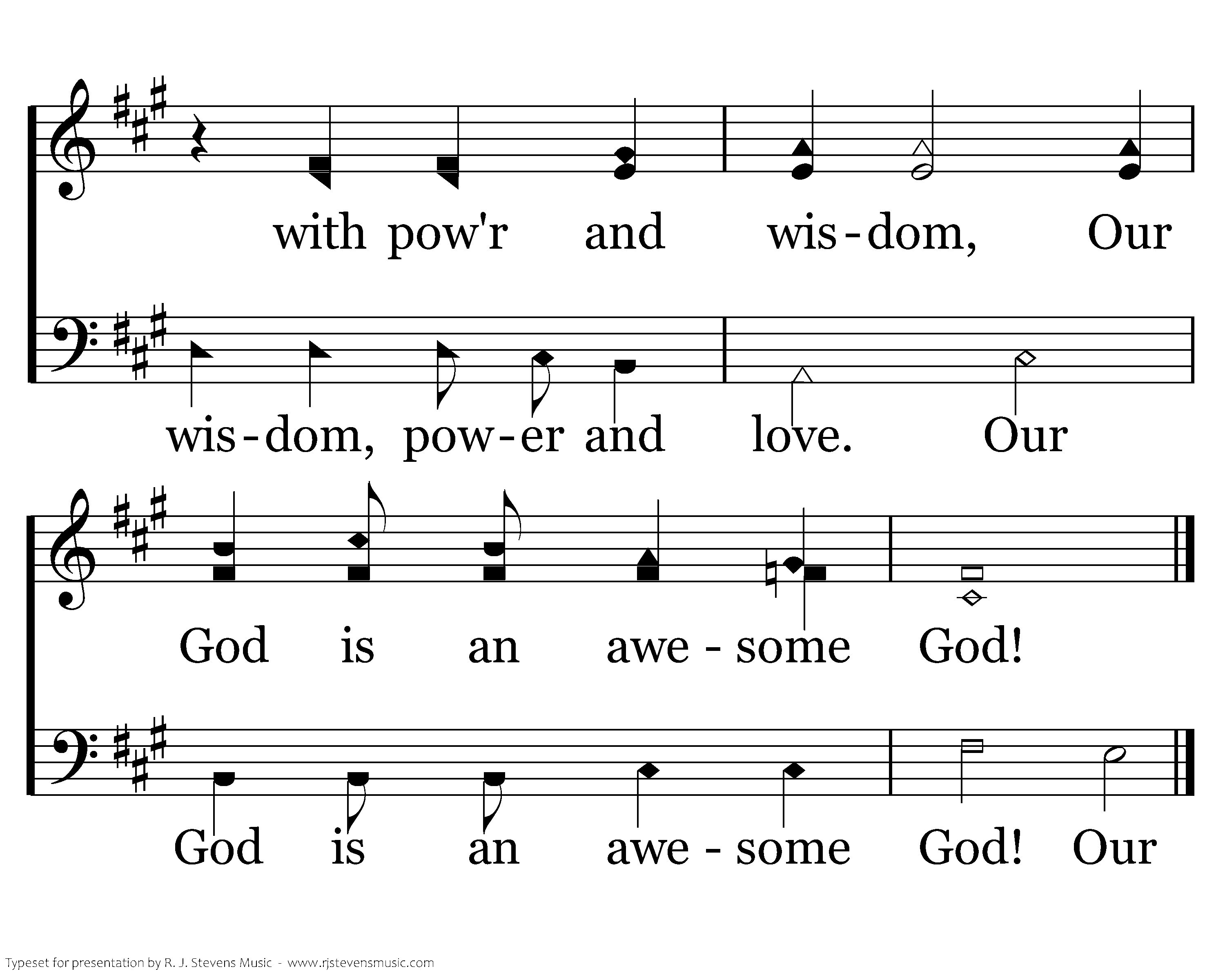Our God is an awesome God; He reigns from heaven above with wisdom, pow'r and love. Our God is an awesome God! God! Our God is an awe-some God! Our God is an awesome God! God is an awesome God, He reigns from heaven above with wisdom pow'r and love Our pow'r and love. Our God is an awesome God is an awesome God! Our Our Our Our God is is awesome, He reigns from heaven with pow'r and wisdom, Our God is an awesome God! God is an awesome God, He reigns from heaven above with wisdom, power and love. Our God is an awesome God! Our God!