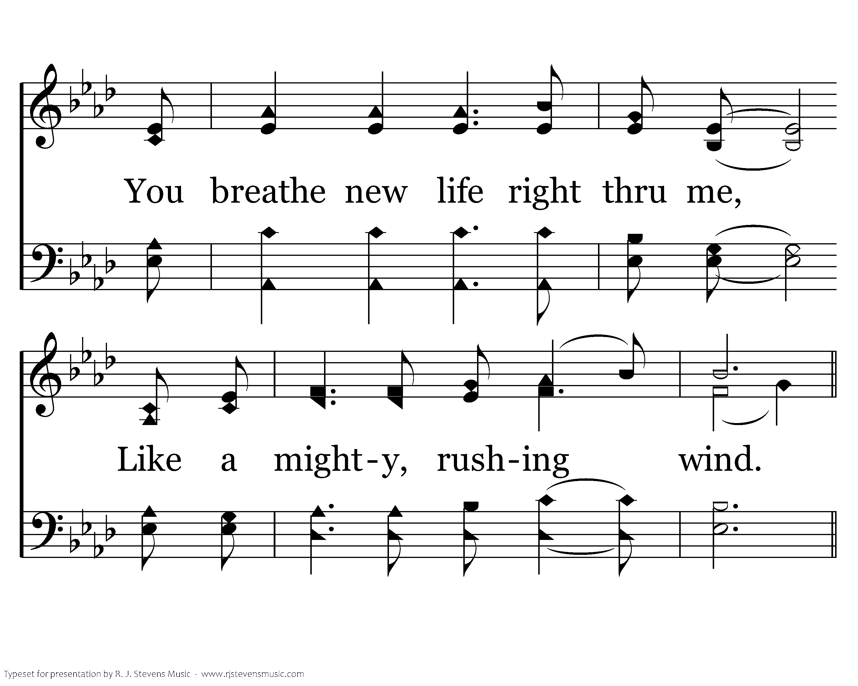 I feel Your arms around me, As the pow'r of Your healing begins; You breathe new life right thru me, Like a mighty, rushing wind.
