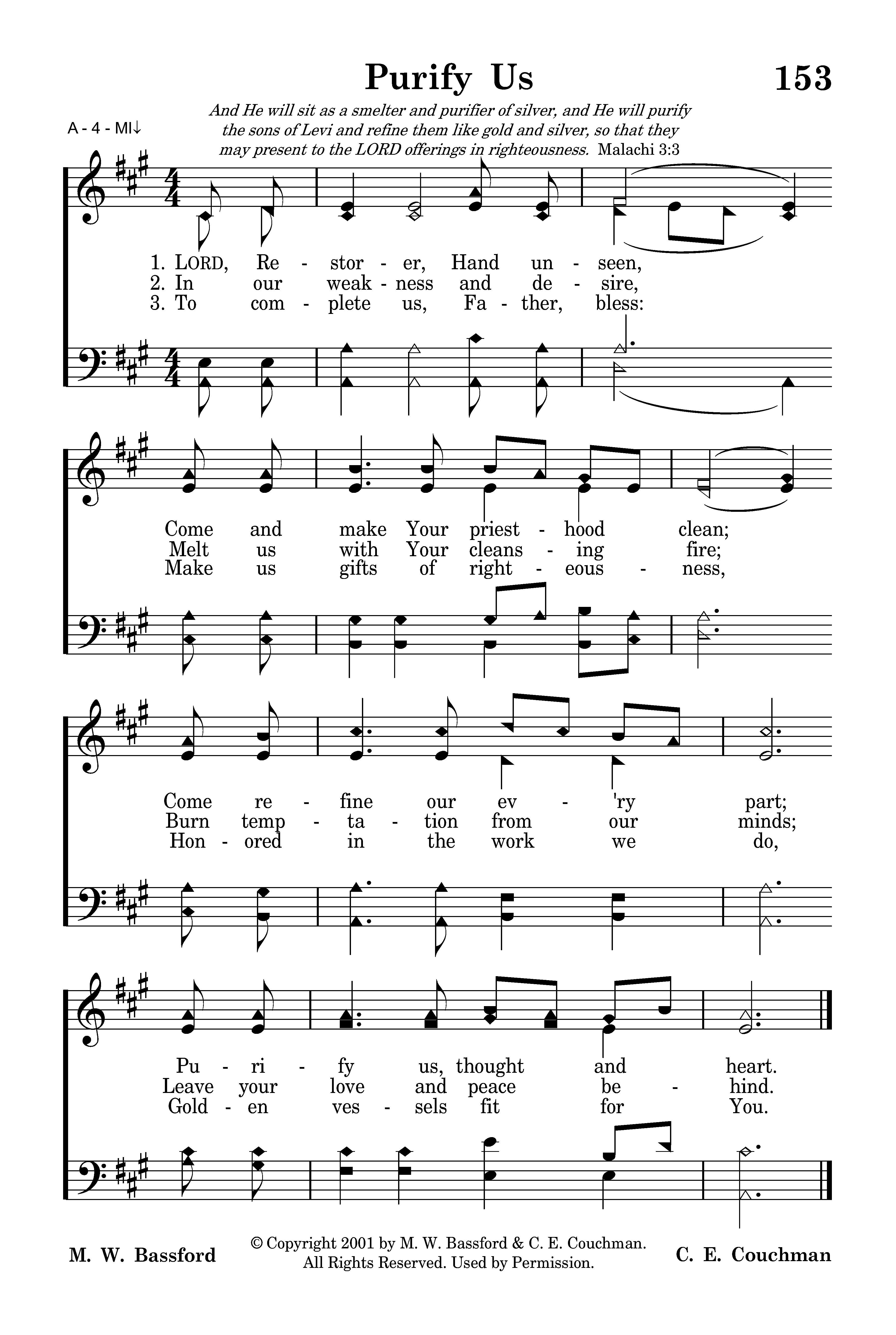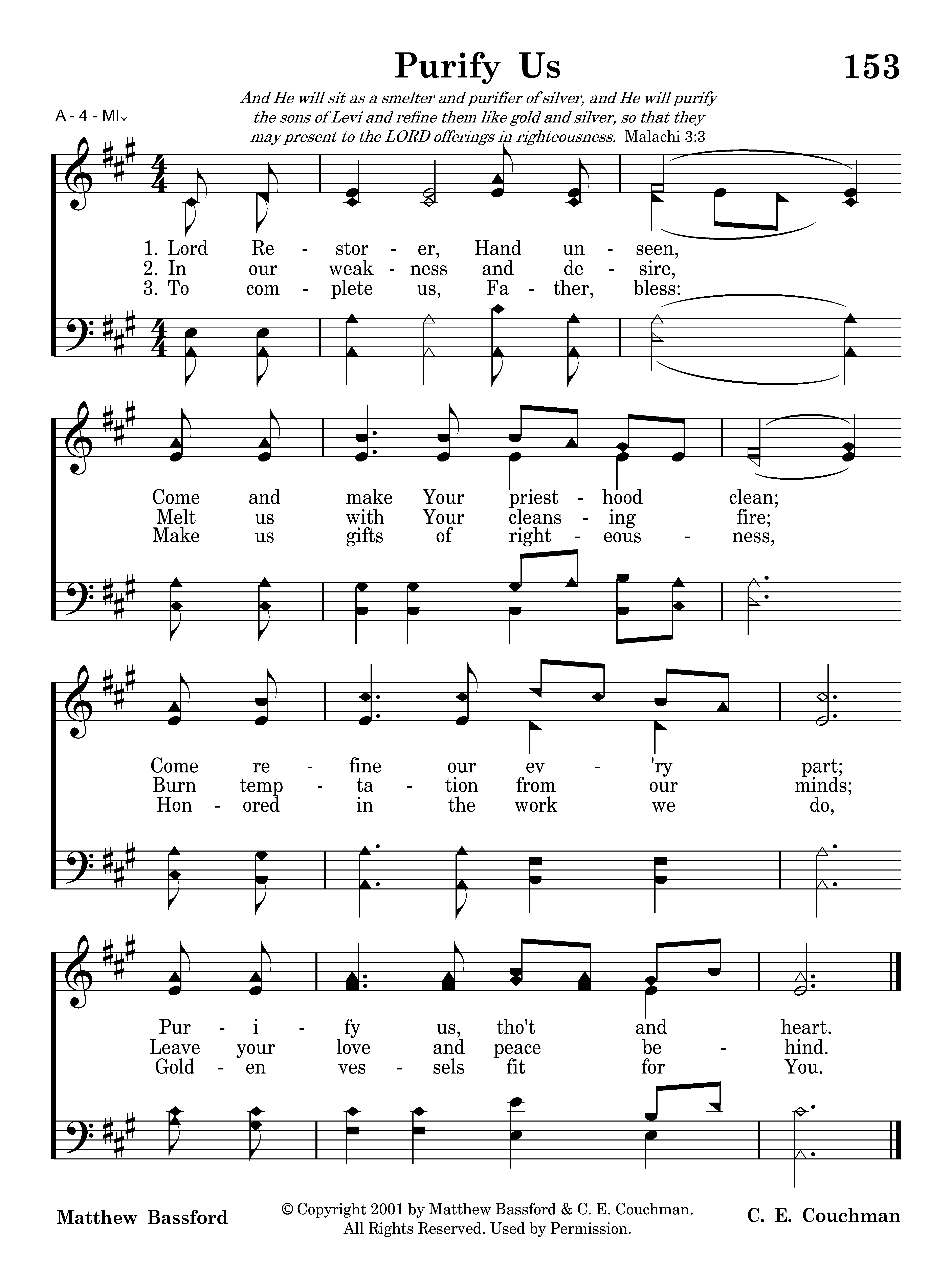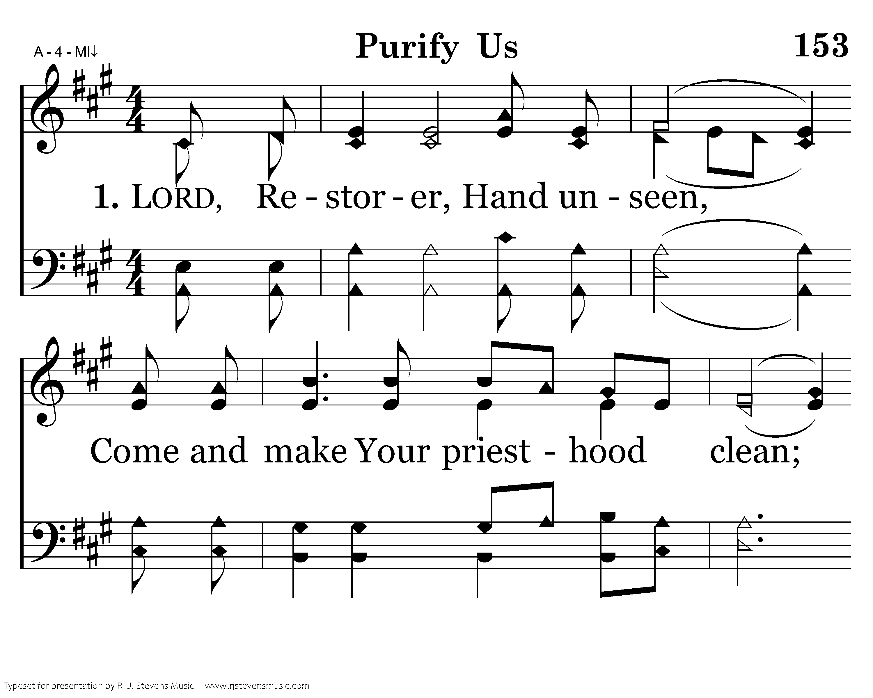 Lord Restorer, Hand unseen, Come and make Your priesthood clean; Come refine our every part; Purify us, thought and heart.