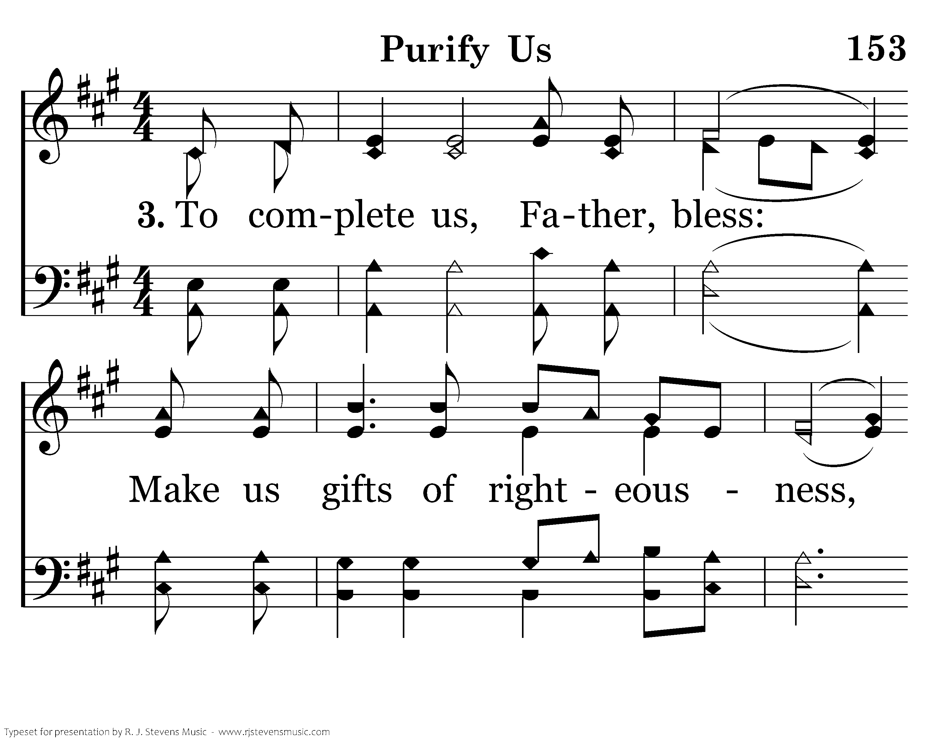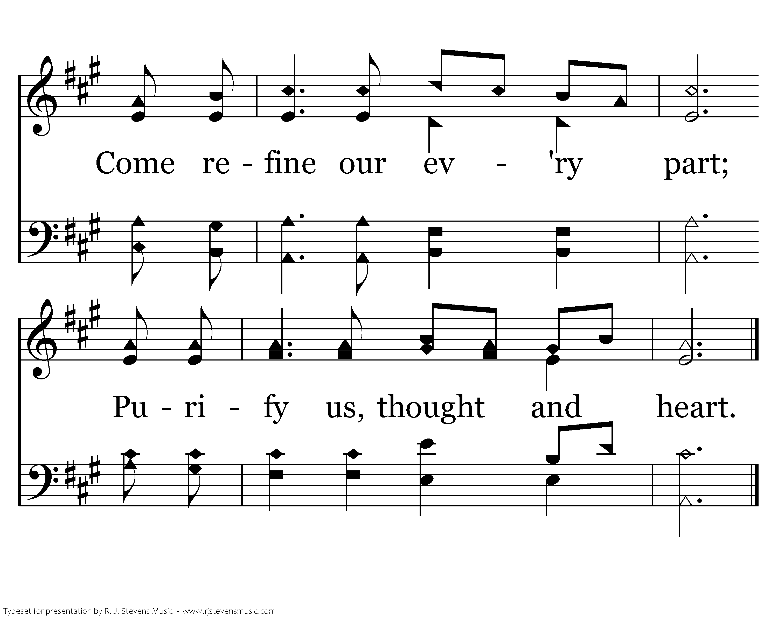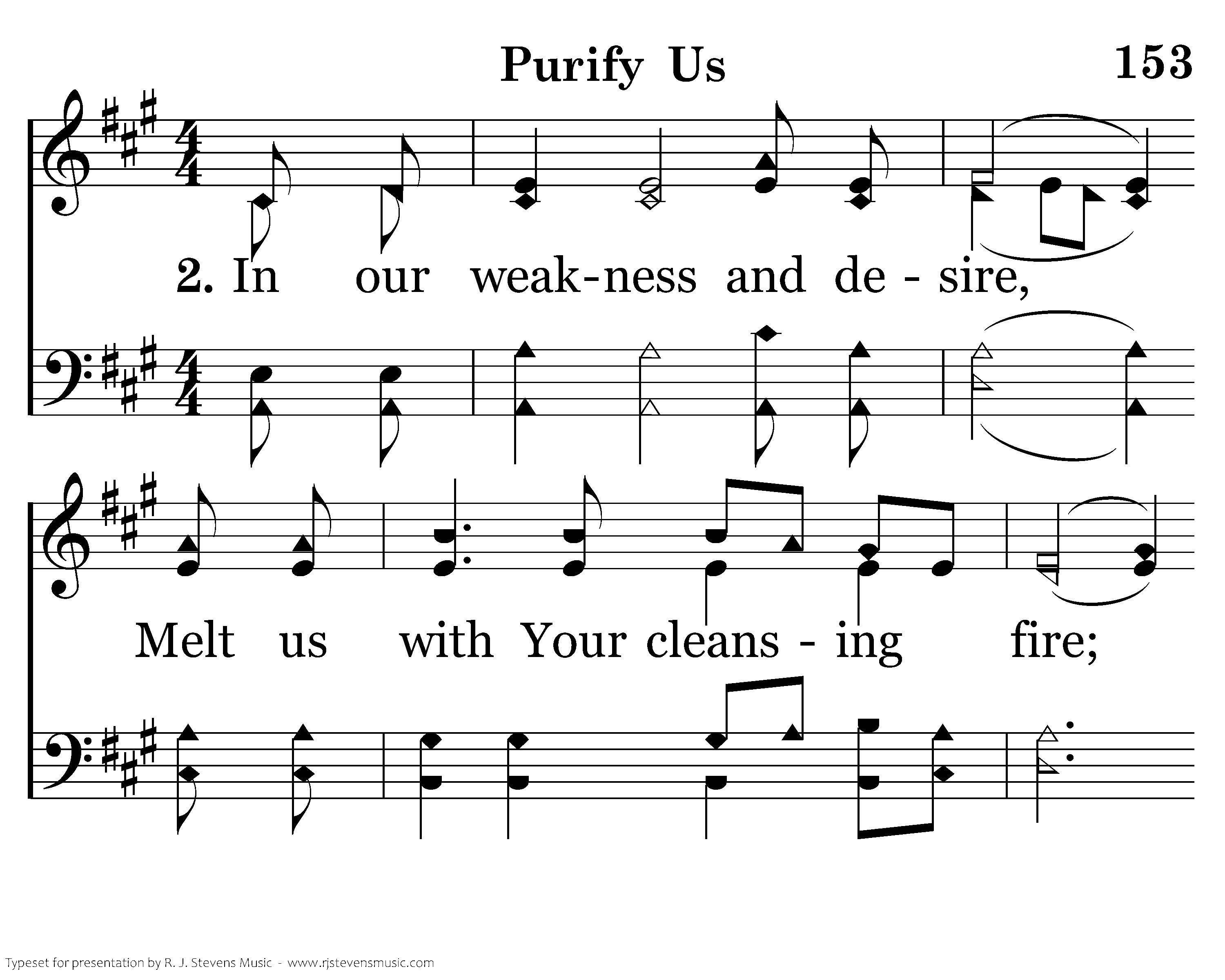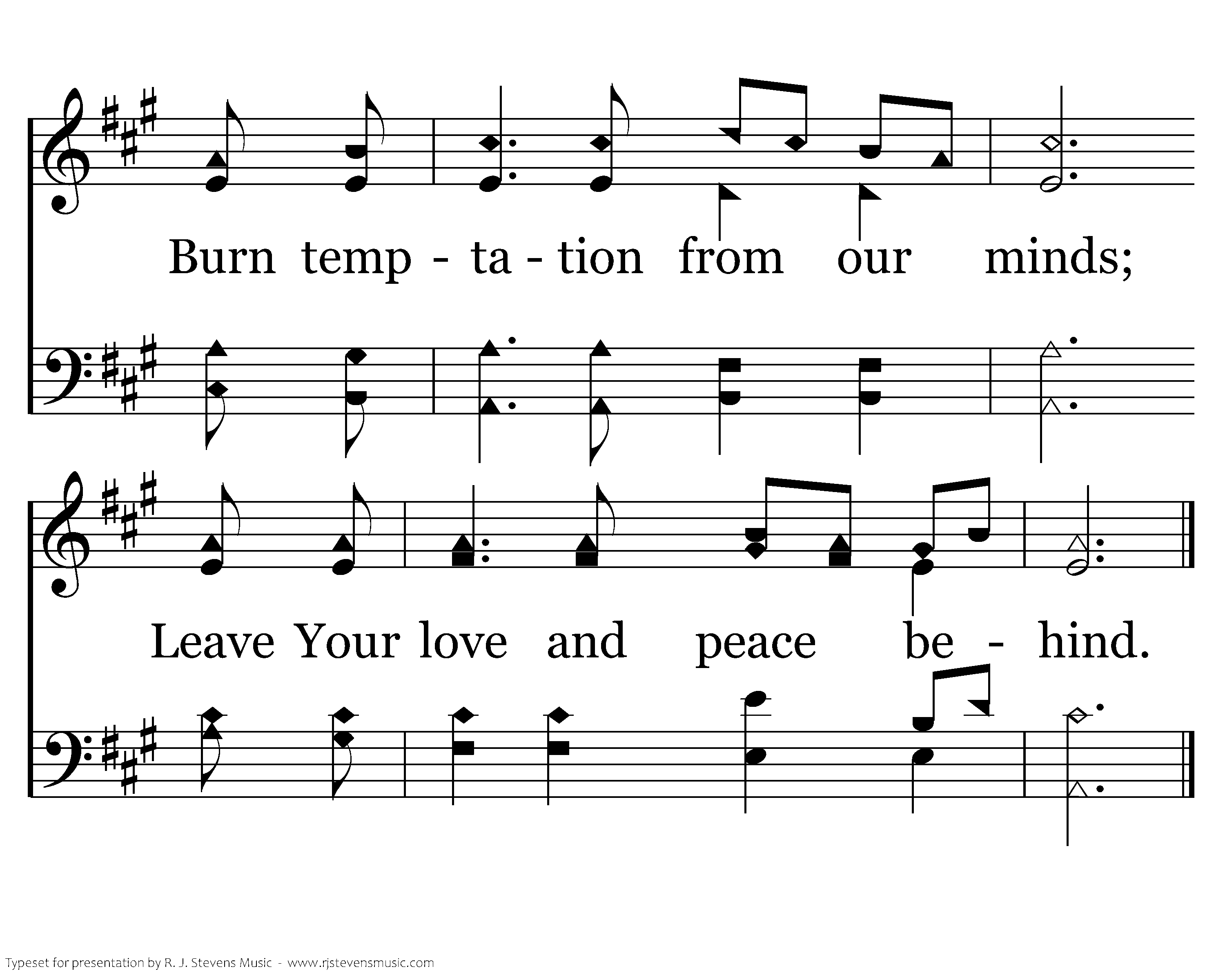 In our weakness and desire, Melt us with Your cleansing fire; Burn temptation from our minds; Leave your love and peace be-hind.