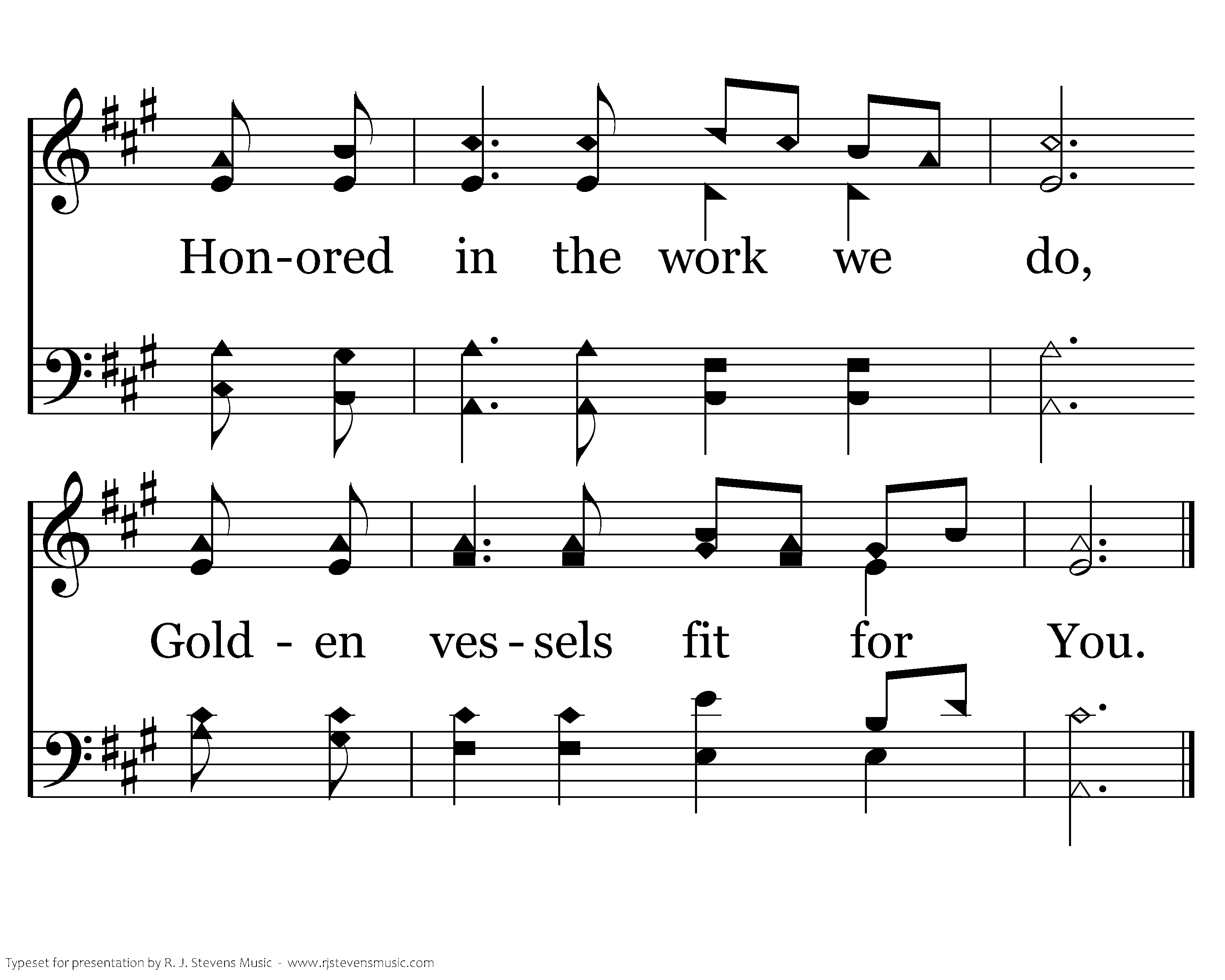 To complete us, Father, bless: Make us gifts of righteousness, Honored in the work we do, Golden vessels fit for You.