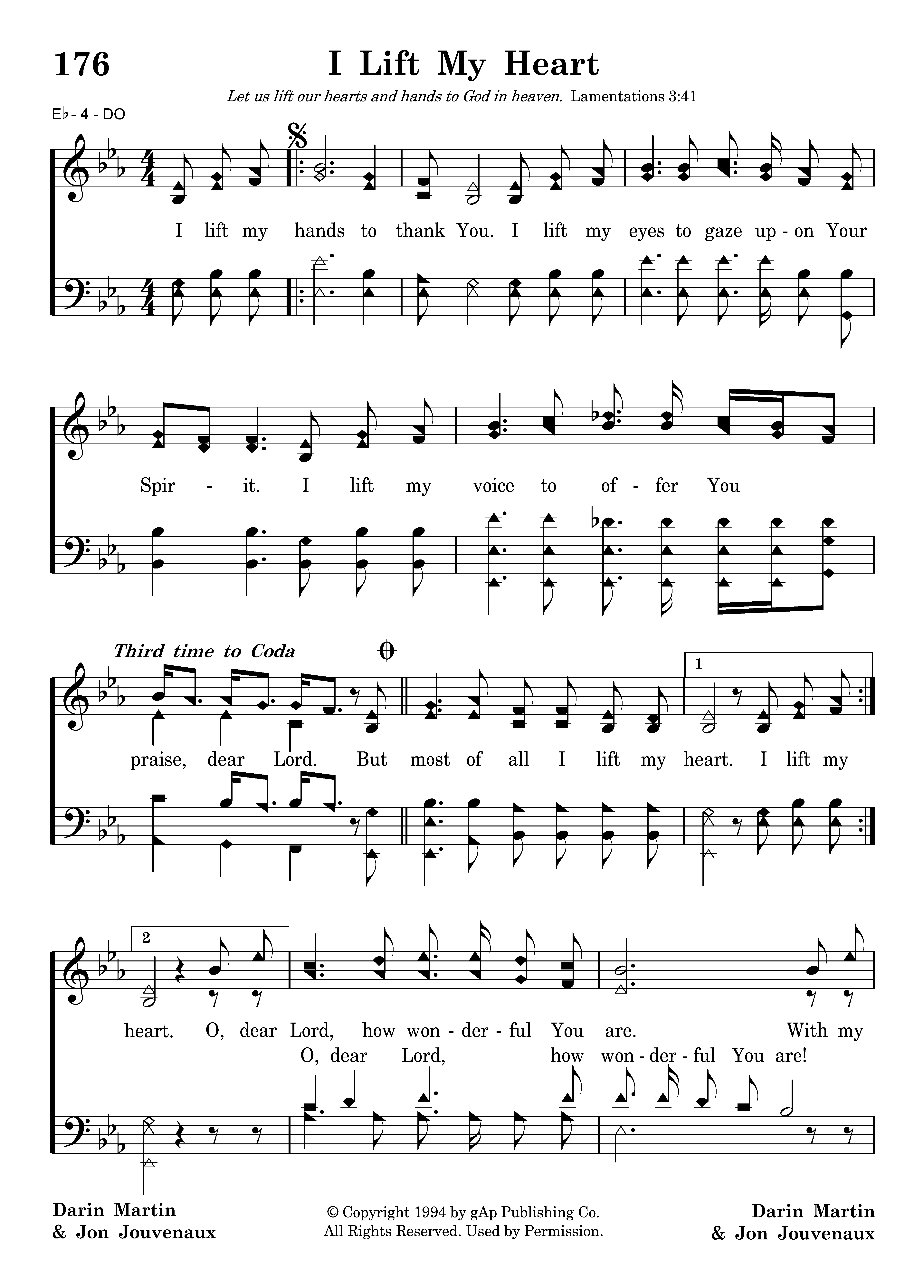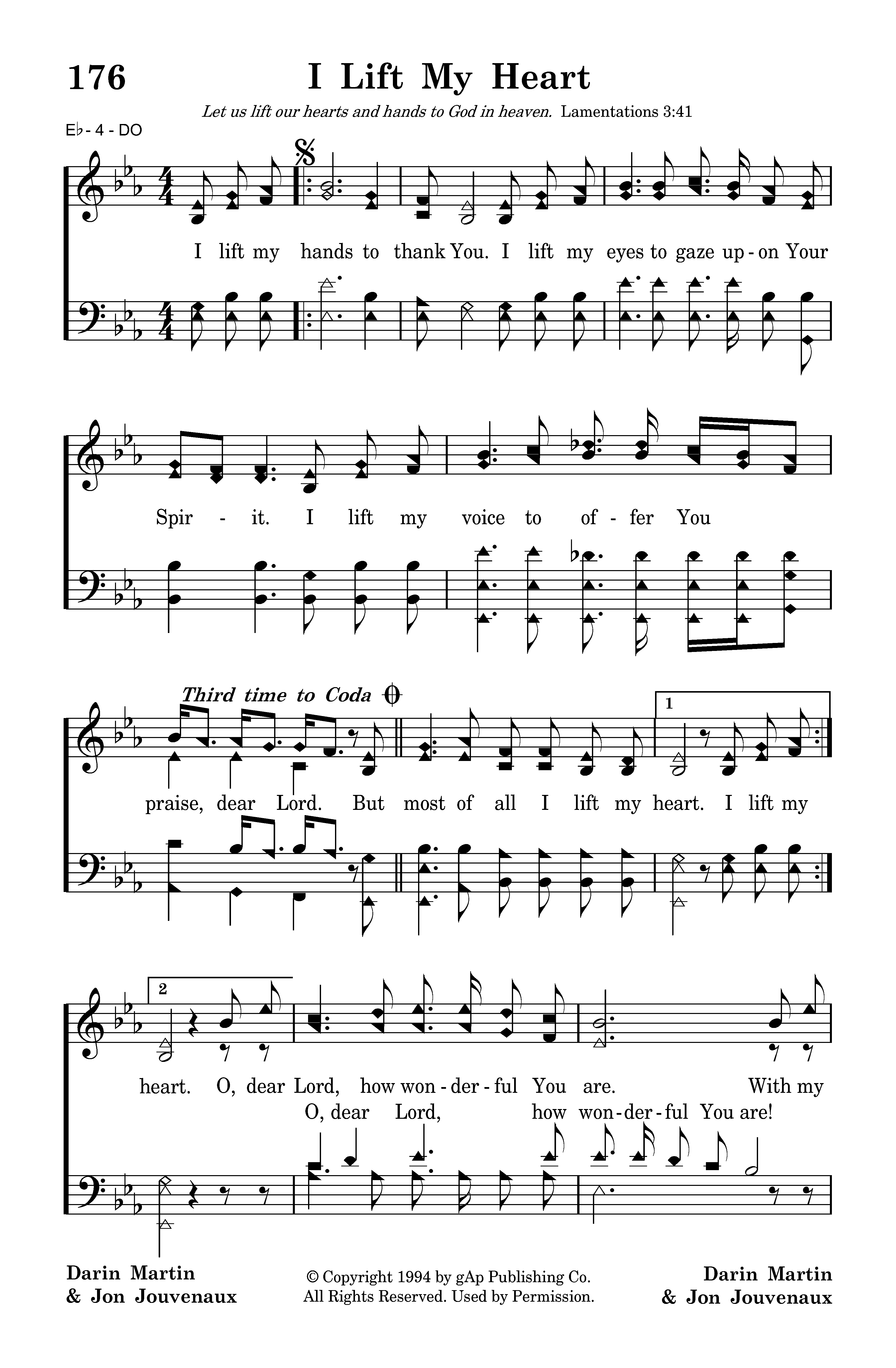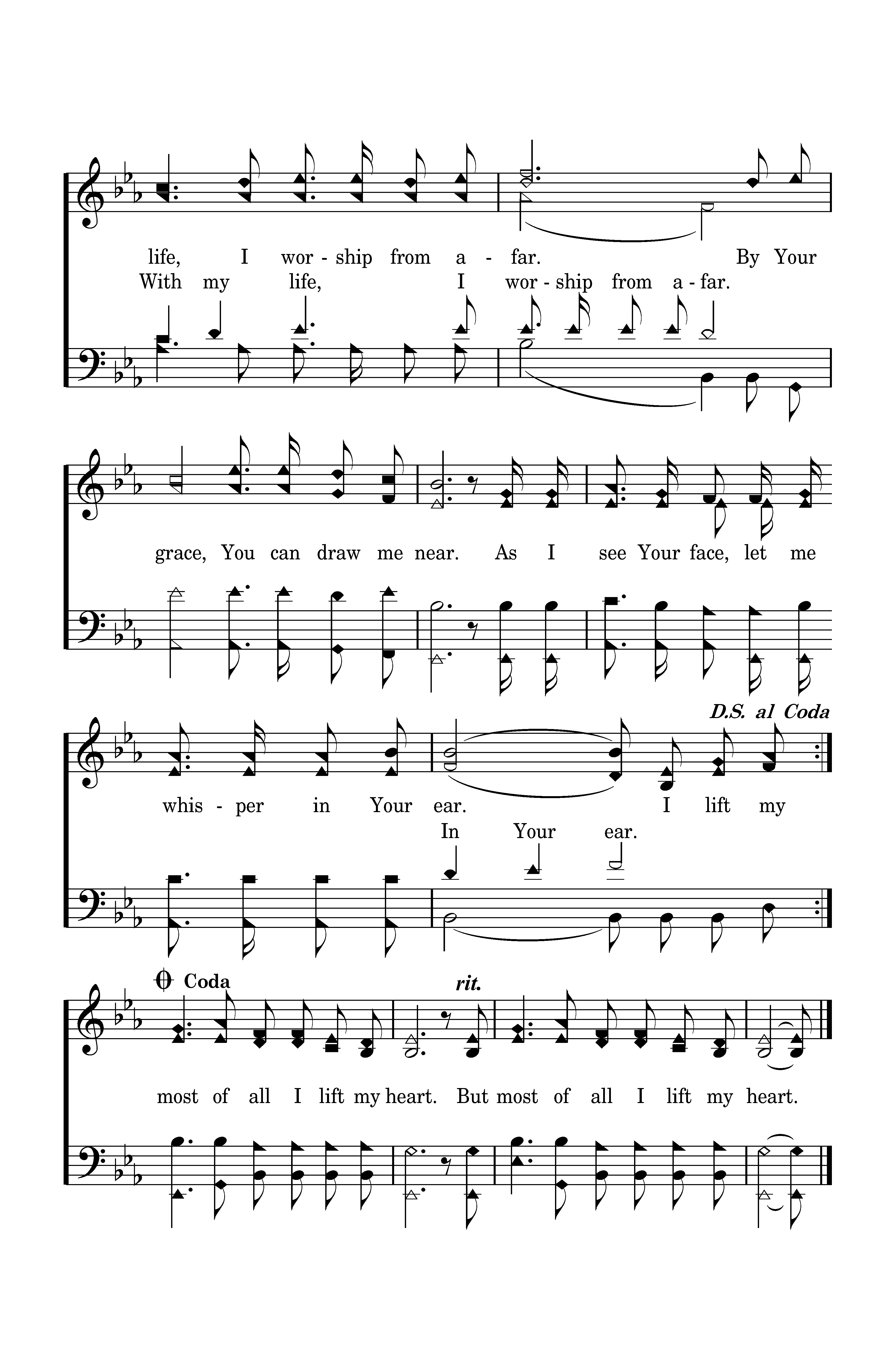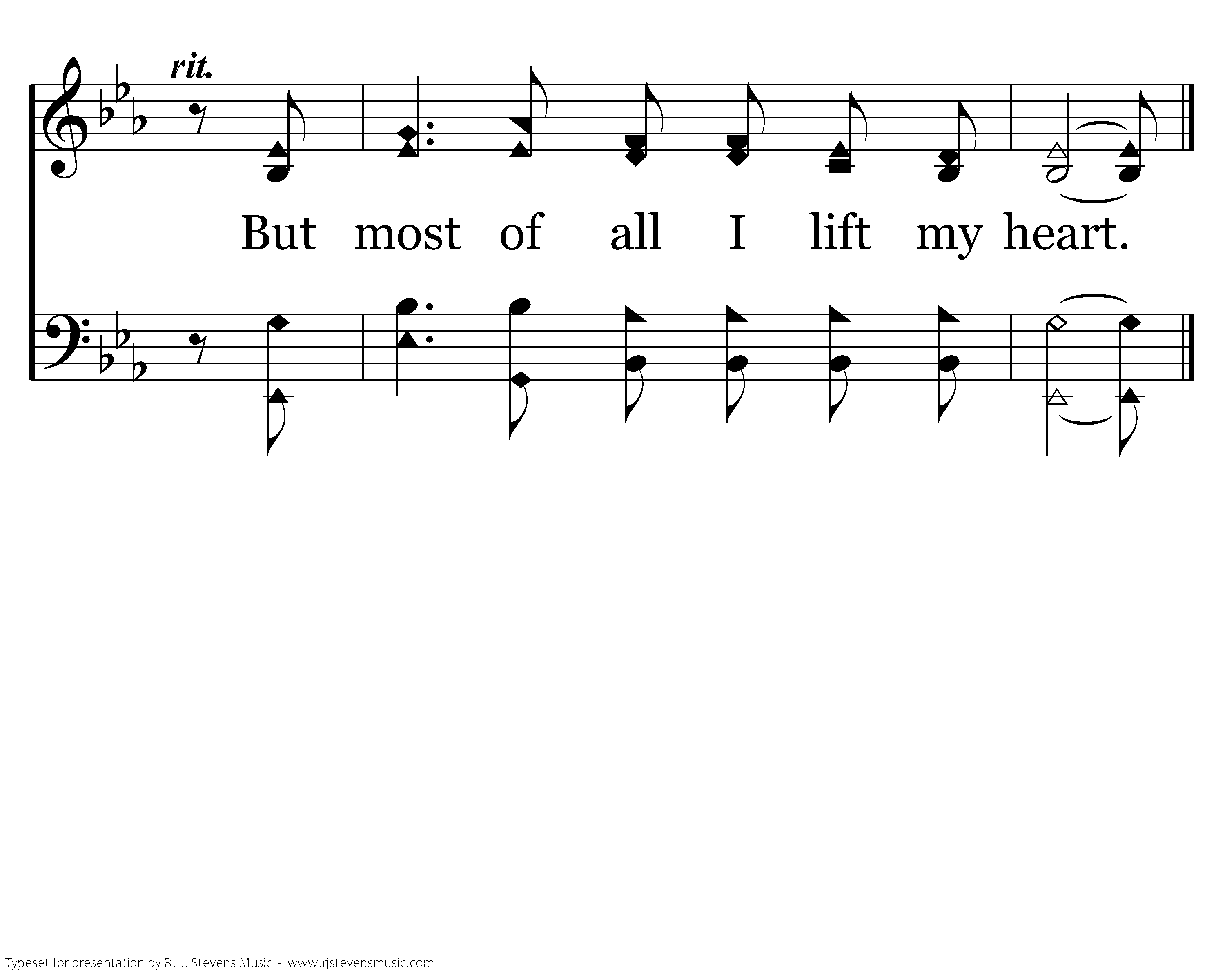 I lift my hands to thank You. I lift my eyes to gaze upon Your Spirit. I lift my voice to offer You praise, dear Lord. But most of all I lift my heart. But most of all I lift my heart. I lift my heart. O, dear Lord, how wonderful You are! With my life, I worship from afar. In Your ear.